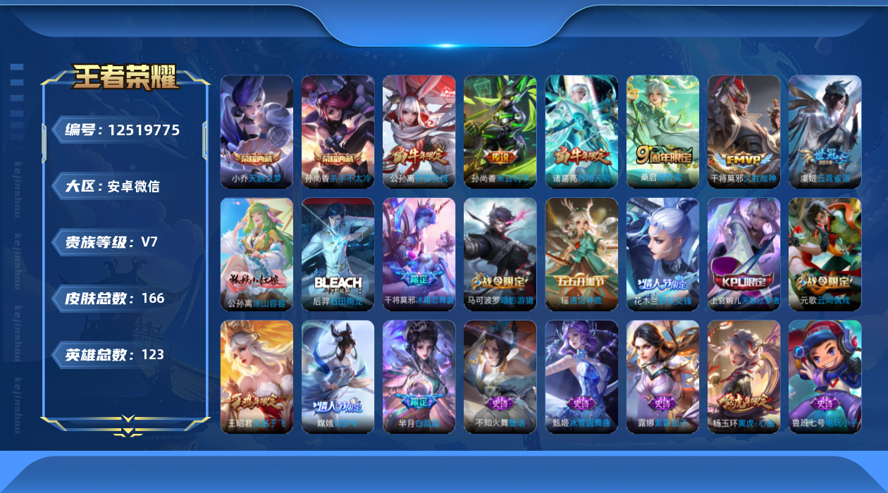 - PX_2105713-实名: 可修改 贵族等级: V6 英雄数: 88 皮肤数: 96 珍品传说: 器灵·落星盏 限定皮: 玉兔公主,鸣野蒿,愿照·众生和