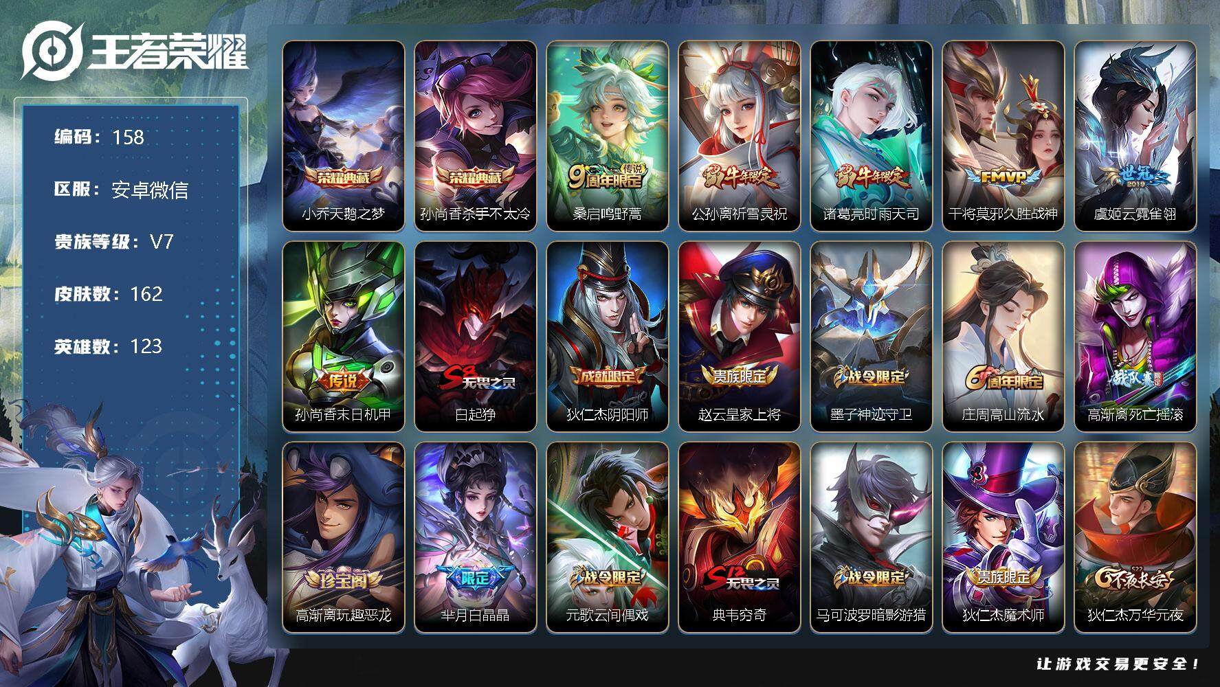 [12519775]AK806【商品标题】:微信支付不能用/介意勿拍/安卓WX-V7-永恒钻石II段位-123英雄-162皮肤-2典藏-0珍品无双-0无双-0珍品传说-6传说-50史诗 【荣耀典藏】:小乔天鹅之梦,孙尚香杀手不太冷 【传说皮肤】:桑启鸣野蒿,公孙离祈雪灵祝,诸葛亮时雨天司,干将莫邪久胜战神,虞姬云霓雀翎,孙尚香末日机甲 【限定皮肤】:白起狰,狄仁杰阴阳师,赵云皇家上将,墨子神迹守卫,庄周高山流水,高渐离死亡摇滚,高渐离玩趣恶龙,芈月白晶晶,元歌云间偶戏,典韦穷奇,马可波罗暗影游猎,狄仁杰魔术师,狄仁杰万华元夜,达摩星际陆战队,达摩沙漠行僧,项羽海滩派对,老夫子醍醐杖,程咬金演武夺筹,王昭君凤凰于飞,兰陵王金庭之子,花木兰默契交锋,亚瑟潮玩骑士王,李元芳云中旅人,钟馗驱傩正仪,杨玉环寅虎心曲,干将莫邪冰霜恋舞曲,雅典娜单词大作战,雅典娜黎明之约,蔡文姬繁星吟游,鬼谷子原初探秘者,诸葛亮时雨天司,苏烈千军破阵,百里玄策原初追逐者,公孙离祈雪灵祝,沈梦溪大漠名商,明世隐疑决卦,裴擒虎李小龙,裴擒虎擒涛扼浪,米莱狄胡桃异想国,云中君纤云弄巧,猪八戒西部大镖客,上官婉儿梁祝,上官婉儿天狼绘梦者,嫦娥如梦令,嫦娥拒霜思,蒙犽狂想玩偶喵,鲁班大师探海日志,桑启海盐诗旅,蒙恬荣光圣徽,周瑜熔金海岸 【年限皮肤】:杨玉环寅虎心曲,王昭君凤凰于飞,公孙离祈雪灵祝,诸葛亮时雨天司 【赛季限定】:白起狰,典韦穷奇,狄仁杰万华元夜,达摩沙漠行僧,老夫子醍醐杖,程咬金演武夺筹,兰陵王金庭之子,李元芳云中旅人,钟馗驱傩正仪,雅典娜黎明之约,鬼谷子原初探秘者,苏烈千军破阵,百里玄策原初追逐者,沈梦溪大漠名商,明世隐疑决卦,裴擒虎擒涛扼浪,鲁班大师探海日志,桑启海盐诗旅,蒙恬荣光圣徽 【战令限定】:墨子神迹守卫,元歌云间偶戏,马可波罗暗影游猎,达摩星际陆战队,亚瑟潮玩骑士王,雅典娜单词大作战,米莱狄胡桃异想国,猪八戒西部大镖客,蒙犽狂想玩偶喵 【史诗皮肤】:鲁班七号电玩小子,露娜紫霞仙子,赵云皇家上将,貂蝉圣诞恋歌,甄姬冰雪圆舞曲,王昭君偶像歌手,狄仁杰魔术师,廉颇地狱岩魂,宫本武藏鬼剑武藏,孙尚香水果甜心,妲己女仆咖啡,墨子金属风暴,刘禅绅士熊喵,张飞乱世虎臣,王昭君凤凰于飞,花木兰水晶猎龙者,刘邦德古拉伯爵,小乔缤纷独角兽,兰陵王暗隐猎兽者,安琪拉心灵骇客,百里守约特工魅影,白起星夜王子,干将莫邪