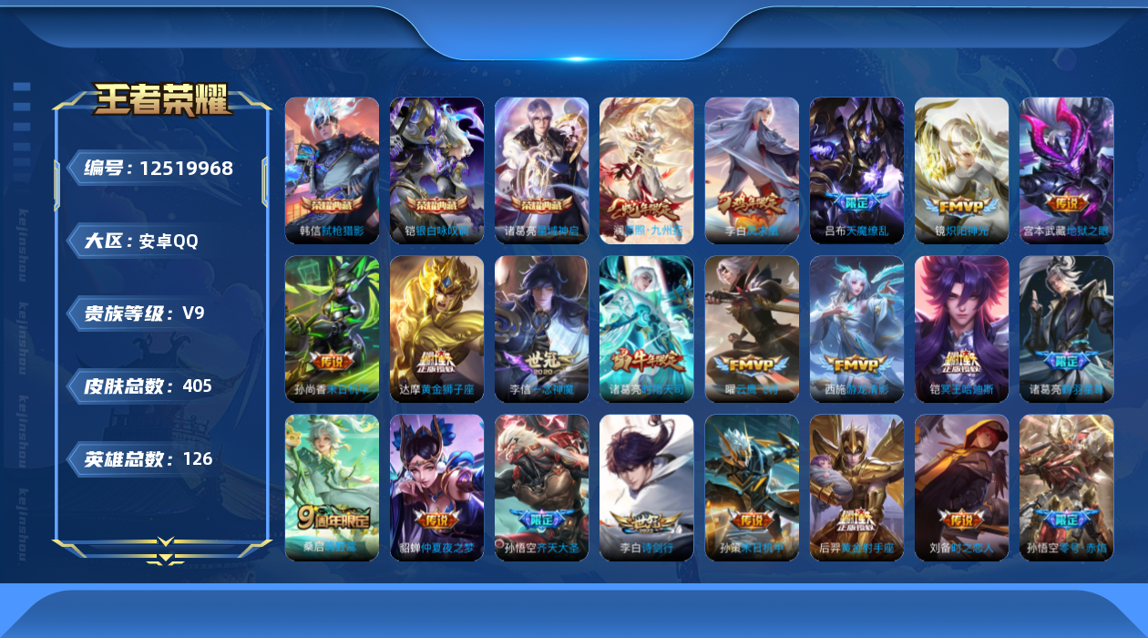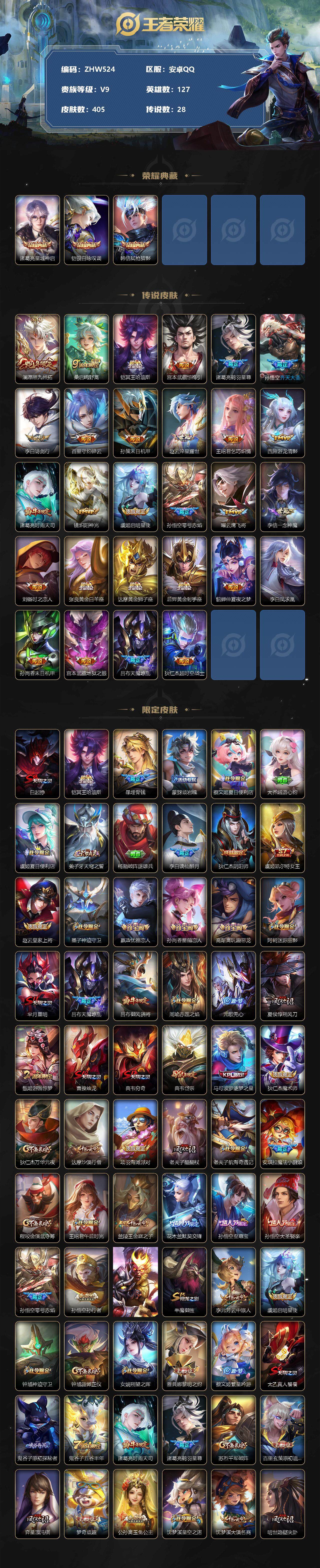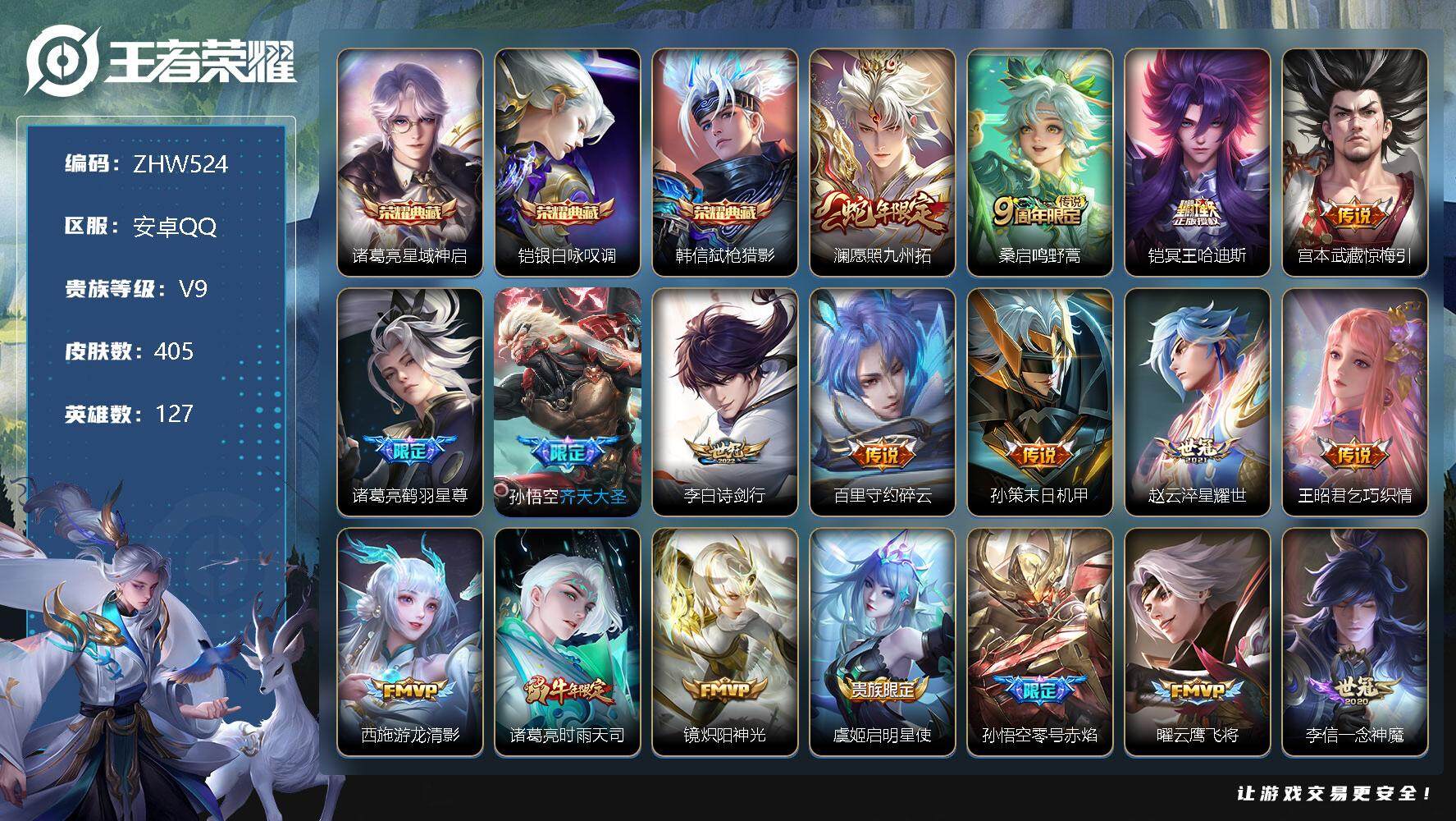 [12519968]【特价急出/详情看图】:安卓Q-V9-最强王者段位-127英雄-405皮肤-3典藏-28传说-110史诗