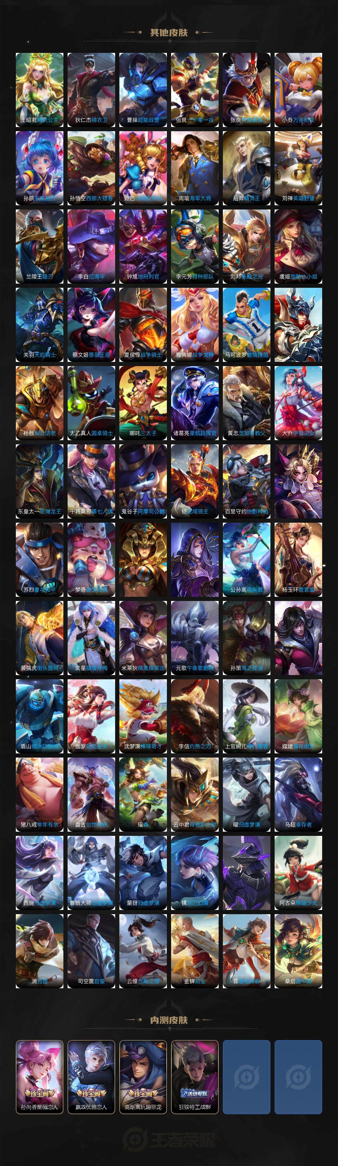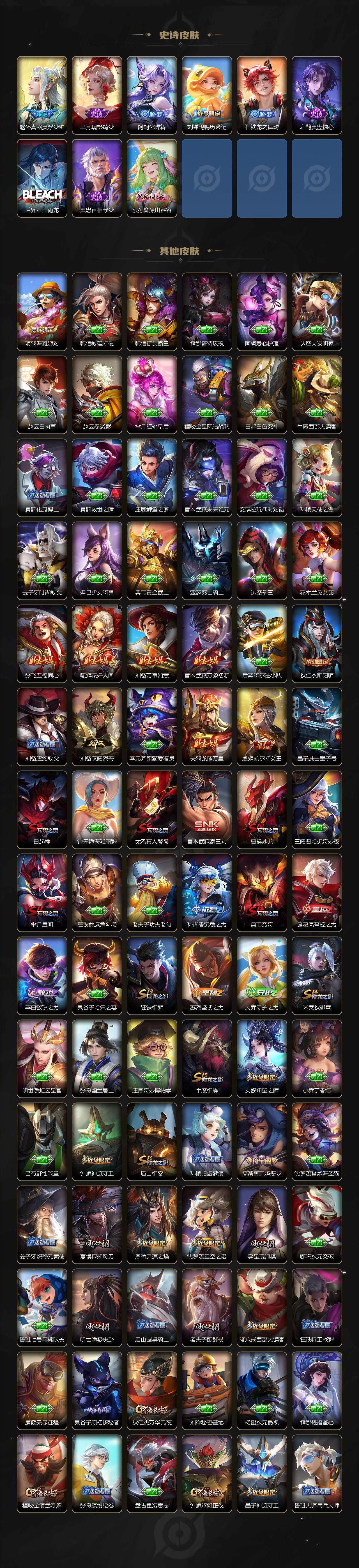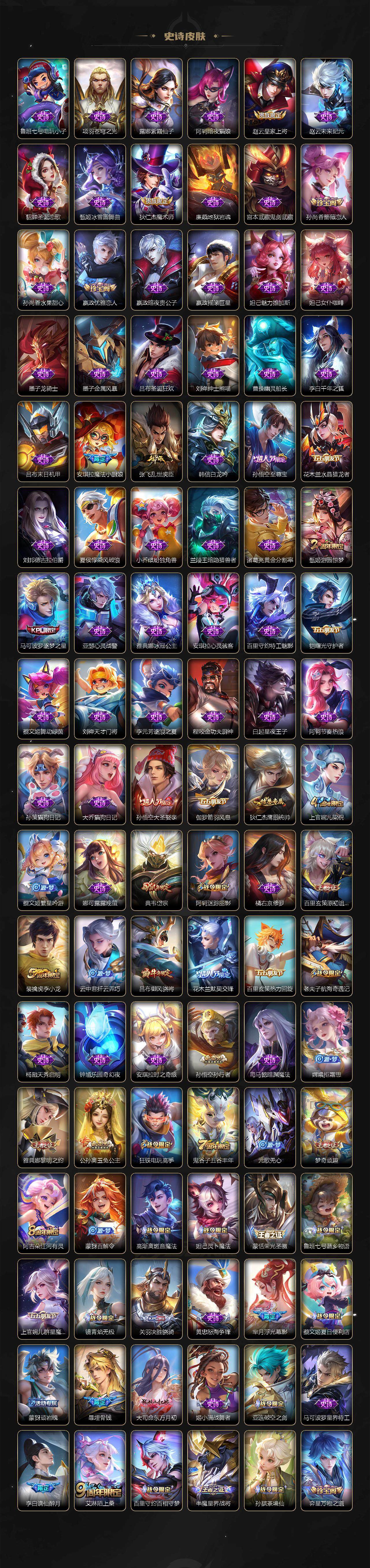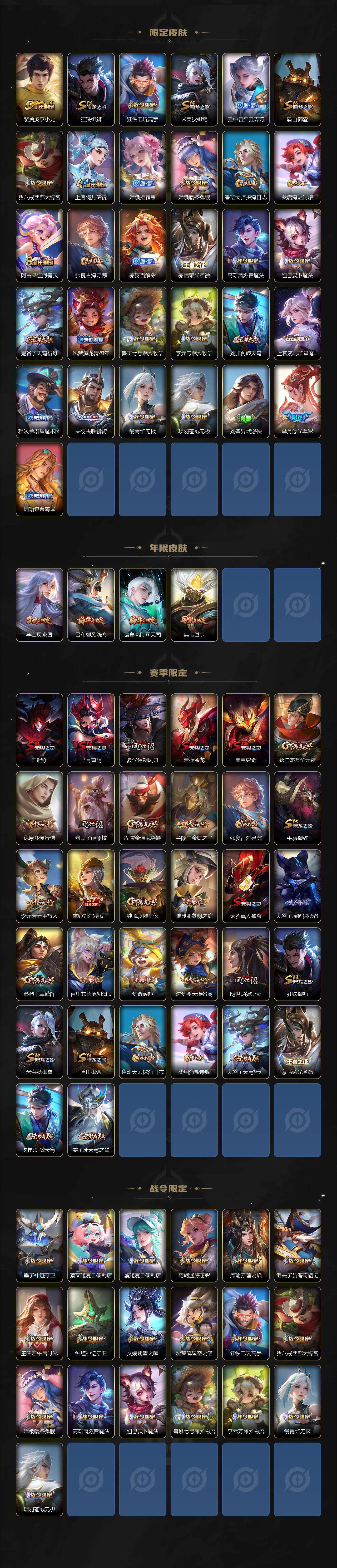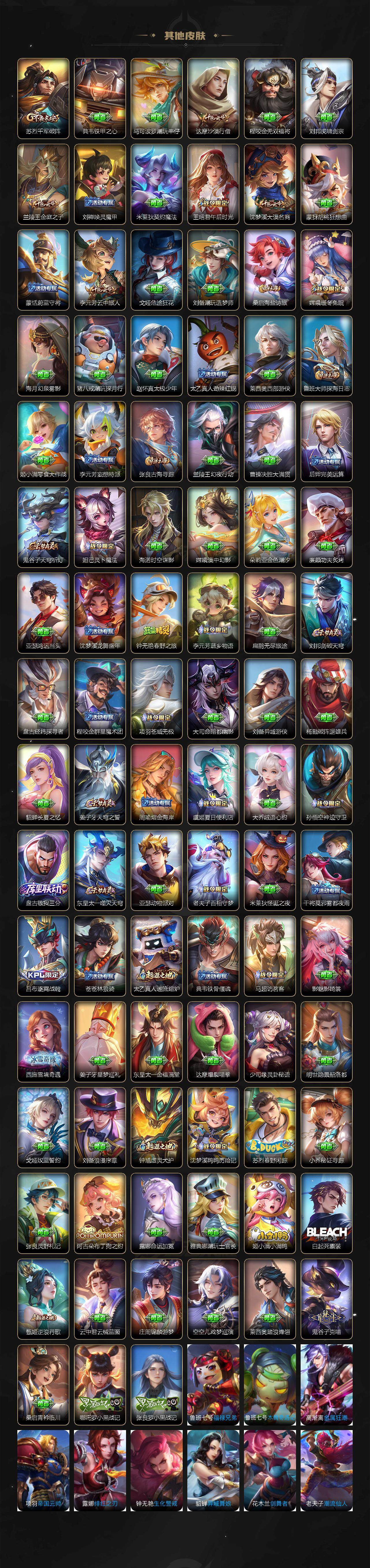 【限定皮肤】:白起狰,铠冥王哈迪斯,暃埋骨钱,蒙犽顽岩魄,蔡文姬夏日便利店,大乔绒语心约,虞姬夏日便利店,姜子牙天穹之誓,杨戬破阵退雄兵,李白谪仙醉月,狄仁杰阴阳师,虞姬凯尔特女王,赵云皇家上将,墨子神迹守卫,嬴政优雅恋人,孙尚香蔷薇恋人,高渐离玩趣恶龙,阿轲迷踪丽影,芈月重明,吕布天魔缭乱,吕布御风骁将,周瑜赤莲之焰,元歌无心,夏侯惇朔风刀,甄姬游园惊梦,曹操烛龙,典韦穷奇,典韦岱宗,马可波罗逐梦之星,狄仁杰魔术师,狄仁杰万华元夜,达摩沙漠行僧,项羽海滩派对,老夫子醍醐杖,老夫子航海奇遇记,安琪拉魔法小厨娘,程咬金演武夺筹,王昭君午后时光,兰陵王金庭之子,花木兰默契交锋,孙悟空至尊宝,孙悟空大圣娶亲,孙悟空零号赤焰,孙悟空孙行者,孙悟空齐天大圣,牛魔御旌,李元芳云中旅人,虞姬启明星使,钟馗神迹守卫,钟馗驱傩正仪,女娲朔望之晖,雅典娜黎明之约,蔡文姬繁星吟游,太乙真人饕餮,鬼谷子原初探秘者,鬼谷子五谷丰年,诸葛亮时雨天司,诸葛亮鹤羽星尊,苏烈千军破阵,百里玄策原初追逐者,弈星混沌棋,梦奇顽趣,公孙离玉兔公主,沈梦溪星空之诺,沈梦溪大漠名商,明世隐疑决卦,裴擒虎李小龙,狂铁御狮,狂铁电玩高手,米莱狄御霄,云中君纤云弄巧,盾山御銮,猪八戒西部大镖客,上官婉儿梁祝,嫦娥拒霜思,嫦娥暖冬兔眠,鲁班大师探海日志,桑启海盐诗旅,阿古朵江河有灵,张良古海寻踪,蒙犽百解令,蒙恬荣光圣徽,高渐离燃音魔法,妲己灵卜魔法,鬼谷子天穹祈灯,沈梦溪龙舞盛年,鲁班七号蔬乡物语,李元芳蔬乡物语,刘邦剑破天穹,上官婉儿群星魔术团,程咬金群星魔