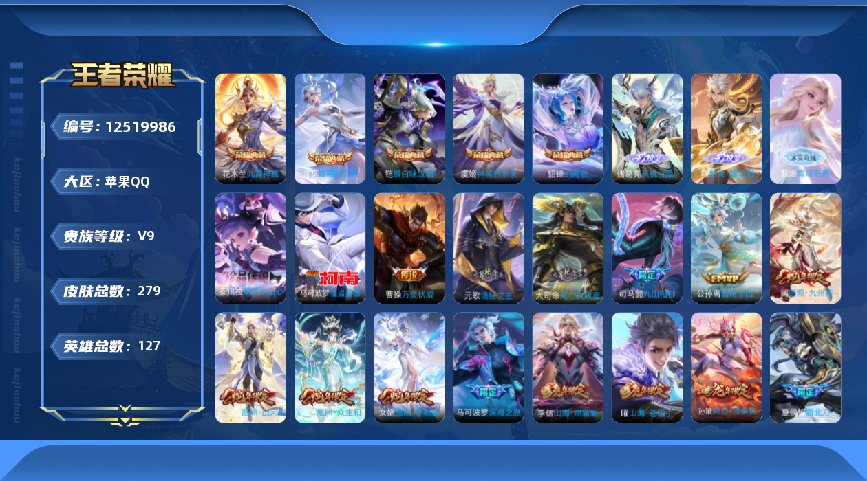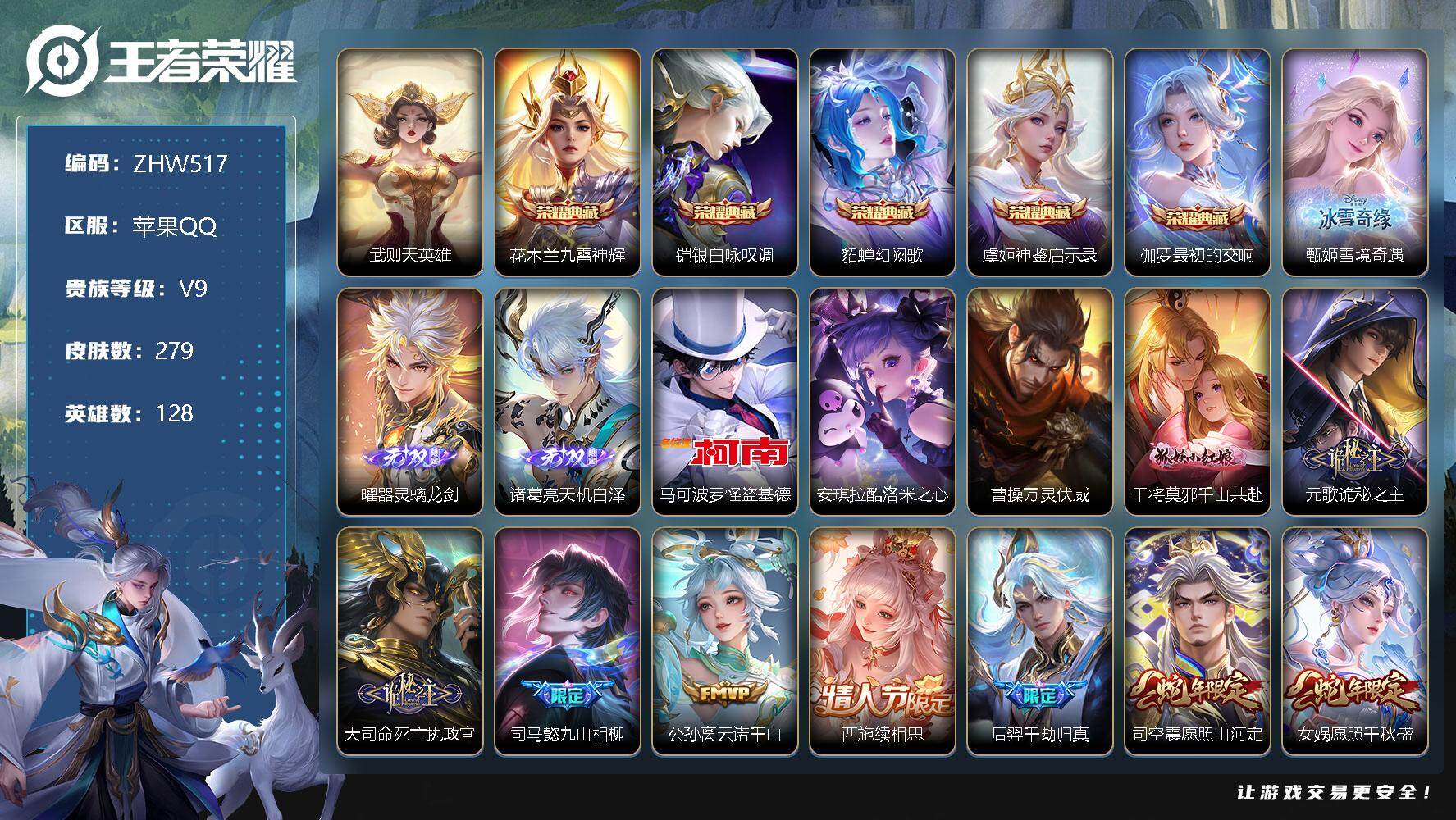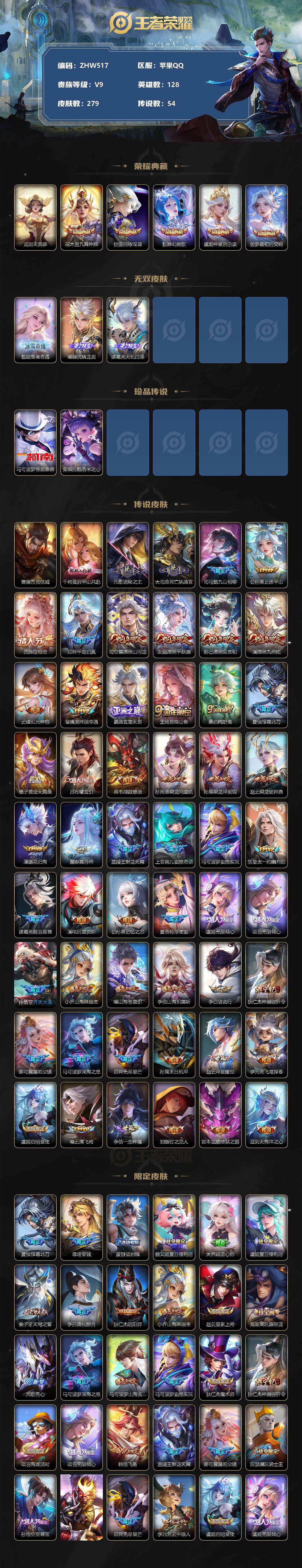 [12519986]【特价急出/详情看图】:苹果Q-V9-最强王者段位-128英雄-279皮肤-5典藏-3无双-2珍品传说-54传说-86史诗