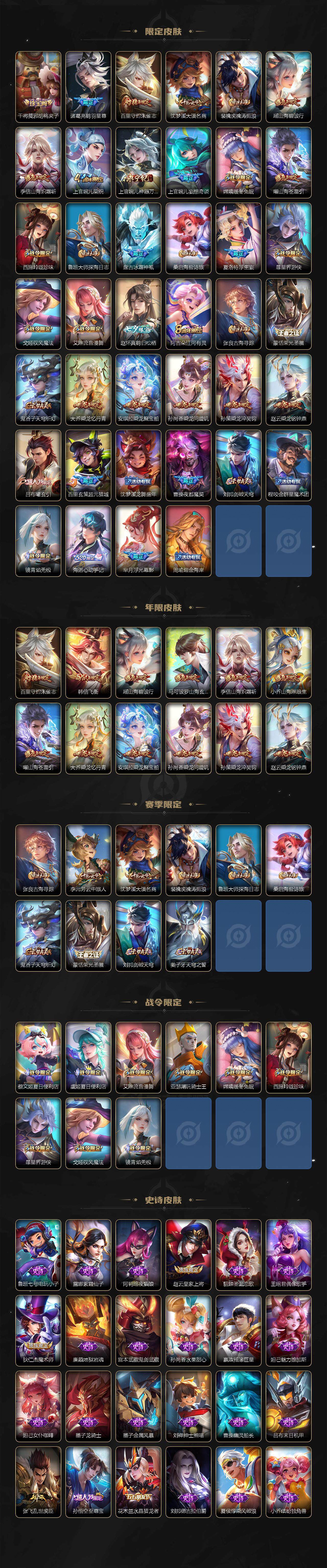 【限定皮肤】:夏侯惇霜北刀,暃埋骨钱,蒙犽顽岩魄,蔡文姬夏日便利店,大乔绒语心约,虞姬夏日便利店,姜子牙天穹之誓,李白谪仙醉月,狄仁杰阴阳师,小乔山海琳琅生,赵云皇家上将,高渐离玩趣恶龙,元歌无心,马可波罗深海之息,马可波罗山海玄木吟,马可波罗妄想实况,狄仁杰魔术师,狄仁杰神器狴犴令,项羽海滩派对,项羽无限倾心,韩信飞衡,兰陵王影龙天霄,娜可露露前尘镜,亚瑟潮玩骑士王,孙悟空至尊宝,孙悟空齐天大圣,后羿无尽星芒,李元芳云中旅人,虞姬启明星使,虞姬无限倾心,干将莫邪胡桃夹子,诸葛亮鹤羽星尊,百里守约朱雀志,沈梦溪大漠名商,裴擒虎擒涛扼浪,瑶山海碧波行,李信山海炽霜斩,上官婉儿梁祝,上官婉儿神器万象笔,上官婉儿妄想奇谈,嫦娥暖冬兔眠,曜山海苍雷引,西施玲珑珍味,鲁班大师探海日志,盘古冰霜神祇,桑启海盐诗旅,夏洛特浮生妄,暃星界游侠,戈娅驭风魔法,艾琳流音漫舞,赵怀真