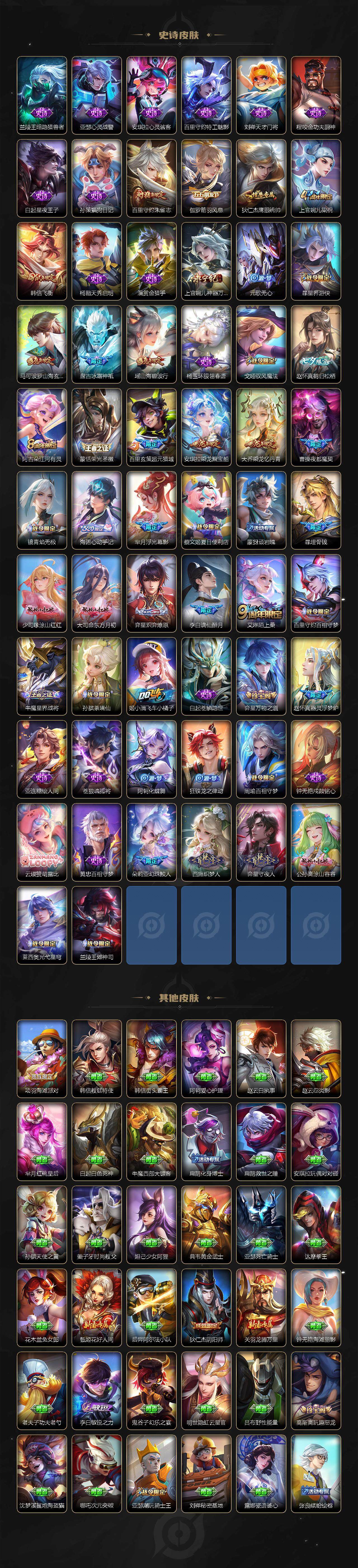 - [12287307]V8 1典藏 2珍品传说 23传说 125英雄 302皮肤 可修改实名 优质装备:弑枪猎影(韩信典藏),酷洛米之心,大耳狗之梦,黄金狮子座,云鹰飞将(小将军),炽阳神光,一念神魔,仲夏夜之梦(大飞蛾),地狱之眼,乞巧织情,时之恋人-刘备(电焊工),超时空战士-狄仁杰,无双飞将,山海·炽霜斩(李信年限),妄想实况,鹤归松栖(云缨),遇见神鼓,鲁班七号-时之奇旅,小动物乐团 传说皮:乘龙·问璇玑(孙尚香年限),落雪白狼,云诺千山,祥瑞亨通 珍宝阁皮:妄想食味,胡桃夹子 限定皮:逐霄战戟,陌上桑,鸣野蒿,至尊宝,山海·碧波行(瑶年限),武圣,梁祝,李小龙,冰霜恋舞曲,匿光启智者 史诗皮:鸭鸭历险记-刘禅,龙之律动,星界战将,石田雨龙,百相守梦-周瑜,百相守梦-黄忠,埋骨钱,谪仙醉月,星界特工,炽弈燎原,撼地雄心,破空之剑,怒海争锋,蔬乡物语(鲁班七号),百相守梦-百里守约,紫霞仙子,黄金分割率,特工魅影,千年之狐,永昼,冰冠公主,浮梦罗烟,鹤归松栖(赵怀真),江河有灵,百解令(蒙犽),高渐离燃音魔法,魅语,无限星赏官,晚萤,偶像歌手,银翎春语,龙骑士(小龙虾),暗夜猫娘,末日机甲-吕布,猫狗日记-孙策,猫狗日记-大乔,乱世虎臣,节奏热浪,修罗,女仆咖啡,摇滚巨星,水果甜心,绅士熊喵,天才门将,星夜王子,心灵骇客,功夫厨神,德古拉伯爵,暗隐猎兽者,幽灵船长,鬼剑武藏,暗渊魔法,心灵战警,乐园奇幻夜,天秀·启明,舞动绿茵,地狱岩魂,诗语江南,拒霜思,缤纷独角兽,乘风破浪,逐浪之夏,水晶猎龙者,曙光守护者,热力回旋,箭羽风息,金属风暴,原初追逐者,圣诞狂欢,圣诞恋歌,鹰眼统帅,暗夜贵公子,魅力维加斯,黎明之约,赏金猎手,未来纪元-赵云