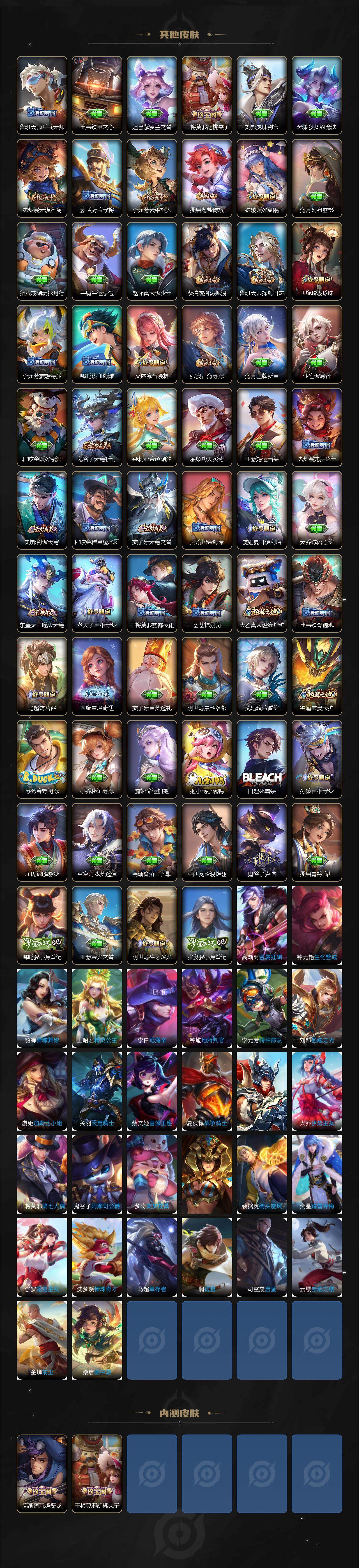伽罗箭羽风息,孙策猫狗日记,露娜紫霞仙子,王昭君偶像歌手,阿轲暗夜猫娘,吕布末日机甲,鲁班七号电玩小子,墨子龙骑士,嬴政摇滚巨星,刘禅绅士熊喵,刘禅天才门将,白起星夜王子,安琪拉心灵骇客,程咬金功夫厨神,刘邦德古拉伯爵,兰陵王暗隐猎兽者,曹操幽灵船长,宫本武藏鬼剑武藏,亚瑟心灵战警,杨戬天秀·启明,廉颇地狱岩魂,小乔缤纷独角兽,夏侯惇乘风破浪,花木兰水晶猎龙者,墨子金属风暴,貂蝉圣诞恋歌,百里守约特工魅影,澜赏金猎手,杨玉环银翎春语,赵怀真鹤归松栖,大乔乘龙·忆丹青,安琪拉乘龙·聚宝船,曹操夜都魔契,海诺心动手记,李白谪仙醉月,姬小满飞车小橘子,白起苍鳞隐世,赵怀真器灵·浮梦炉,亚连糖绘人间,苍狼魂孤将