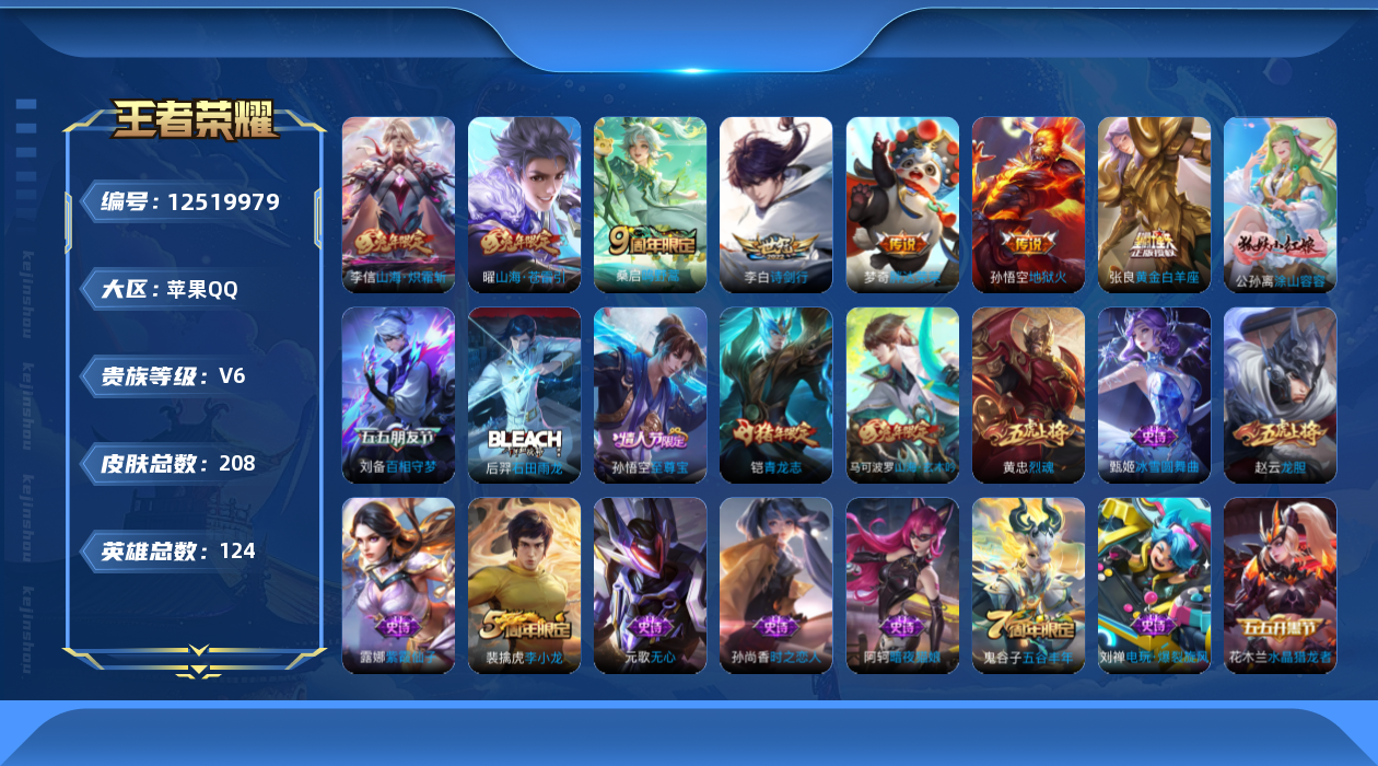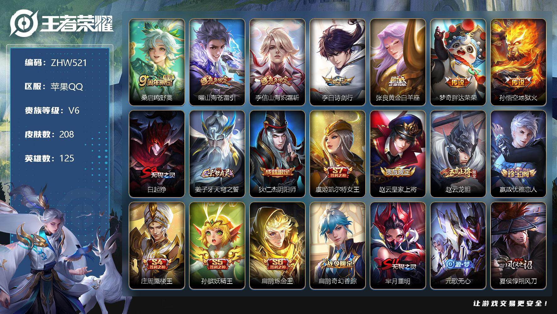 [12519979]【特价急出/详情看图】:苹果Q-V6-尊贵铂金I段位-125英雄-208皮肤-7传说-52史诗 【传说皮肤】:桑启鸣野蒿,曜山海苍雷引,李信山海炽霜斩,李白诗剑行,张良黄金白羊座,梦奇胖达荣荣,孙悟空地狱火 【限定皮肤】:白起狰,姜子牙天穹之誓,狄仁杰阴阳师,虞姬凯尔特女王,赵云皇家上将,赵云龙胆,嬴政优雅恋人,庄周蜃楼王,孙膑妖精王,扁鹊炼金王,扁鹊奇幻香踪,芈月重明,元歌无心,夏侯惇朔风刀,曹操烛龙,典韦穷奇,马可波罗山海玄木吟,狄仁杰魔术师,狄仁杰万华元夜,达摩沙漠行僧,项羽海滩派对,老夫子醍醐杖,兰陵王金庭之子,孙悟空至尊宝,牛魔御旌,刘备百相守梦,李元芳云中旅人,钟馗驱傩正仪,杨戬潮玩骑兵,雅典娜黎明之约,太乙真人饕餮,鬼谷子原初探秘者,鬼谷子五谷丰年,黄忠烈魂,铠青龙志,苏烈千军破阵,弈星混沌棋,沈梦溪大漠名商,明世隐疑决卦,裴擒虎李小龙,裴擒虎擒涛扼浪,狂铁御狮,李信山海炽霜斩,盾山御銮,曜山海苍雷引,鲁班大师探海日志,桑启海盐诗旅,张良古海寻踪,蒙犽百解令,蒙恬荣光圣徽,鬼谷子天穹祈灯,鲁班七号蔬乡物语,李元芳蔬乡物语,刘邦剑破天穹 【年限皮肤】:铠青龙志,黄忠烈魂,赵云龙胆,马可波罗山海玄木吟,李信山海炽霜斩,曜山海苍雷引 【赛季限定】:庄周蜃楼王,孙膑妖精王,扁鹊炼金王,白起狰,芈月重明,夏侯惇朔风刀,曹操烛龙,典韦穷奇,狄仁杰万华元夜,达摩沙漠行僧,老夫子醍醐杖,兰陵王金庭之子,张良古海寻踪,牛魔御旌,李元芳云中旅人,虞姬凯尔特女王,钟馗驱傩正仪,雅典娜黎明之约,太乙真人饕餮,鬼谷子原初探秘者,苏烈千军破阵,弈星混沌棋,沈梦溪大漠名商,明世隐疑决卦,裴擒虎擒涛扼浪,狂铁御狮,盾山御銮,鲁班大师探海日志,桑启海盐诗旅,鬼谷子天穹祈灯,蒙恬荣光圣徽,刘邦剑破天穹,姜子牙天穹之誓 【战令限定】:扁鹊奇幻香踪,杨戬潮玩骑兵,鲁班七号蔬乡物语,李元芳蔬乡物语 【史诗皮肤】:露娜紫霞仙子,阿轲暗夜猫娘,赵云皇家上将,赵云未来纪元,貂蝉圣诞恋歌,甄姬冰雪圆舞曲,王昭君偶像歌手,狄仁杰魔术师,宫本武藏鬼剑武藏,孙尚香水果甜心,嬴政优雅恋人,嬴政暗夜贵公子,嬴政摇滚巨星,妲己魅力维加斯,妲己女仆咖啡,墨子金属风暴,曹操幽灵船长,李白千年之狐,吕布末日机甲,韩信白龙吟,孙悟空至尊宝,花木兰水晶猎龙者,刘邦德古拉伯爵,夏侯惇乘风破浪,兰陵王暗隐猎兽者,亚瑟心灵战警