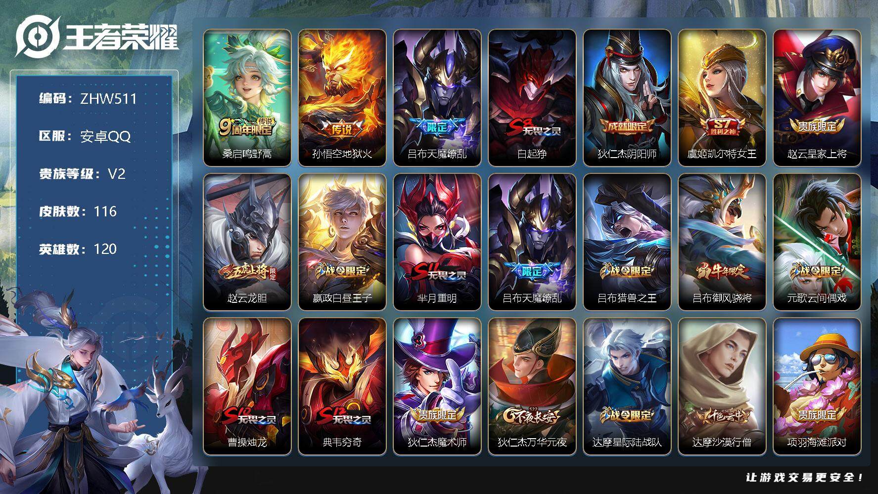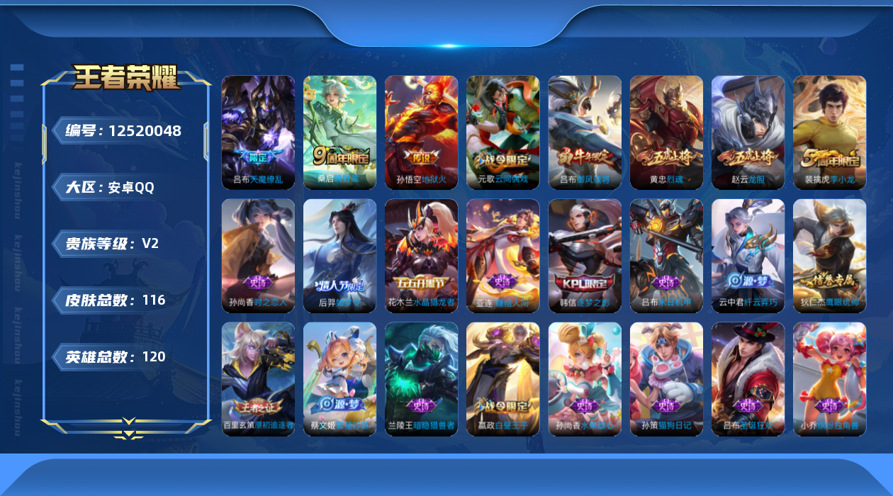 [12520048]【特价急出/详情看图】:安卓Q-V2-永恒钻石IV段位-120英雄-116皮肤-3传说-25史诗 【传说皮肤】:桑启鸣野蒿,孙悟空地狱火,吕布天魔缭乱 【限定皮肤】:白起狰,狄仁杰阴阳师,虞姬凯尔特女王,赵云皇家上将,赵云龙胆,嬴政白昼王子,芈月重明,吕布天魔缭乱,吕布猎兽之王,吕布御风骁将,元歌云间偶戏,曹操烛龙,典韦穷奇,狄仁杰魔术师,狄仁杰万华元夜,达摩星际陆战队,达摩沙漠行僧,项羽海滩派对,老夫子醍醐杖,程咬金演武夺筹,韩信逐梦之影,亚瑟潮玩骑士王,后羿如梦令,蔡文姬繁星吟游,太乙真人饕餮,鬼谷子原初探秘者,黄忠烈魂,百里玄策原初追逐者,弈星混沌棋,明世隐疑决卦,裴擒虎李小龙,狂铁御狮,米莱狄御霄,云中君纤云弄巧 【年限皮肤】:吕布御风骁将,黄忠烈魂,赵云龙胆 【赛季限定】:白起狰,芈月重明,曹操烛龙,典韦穷奇,狄仁杰万华元夜,达摩沙漠行僧,老夫子醍醐杖,程咬金演武夺筹,虞姬凯尔特女王,太乙真人饕餮,鬼谷子原初探秘者,百里玄策原初追逐者,弈星混沌棋,明世隐疑决卦,狂铁御狮,米莱狄御霄 【战令限定】:嬴政白昼王子,吕布猎兽之王,元歌云间偶戏,达摩星际陆战队,亚瑟潮玩骑士王 【史诗皮肤】:赵云皇家上将,狄仁杰魔术师,孙尚香水果甜心,妲己魅力维加斯,吕布圣诞狂欢,吕布末日机甲,花木兰水晶猎龙者,韩信逐梦之影,小乔缤纷独角兽,兰陵王暗隐猎兽者,李元芳逐浪之夏,嬴政白昼王子,孙策猫狗日记,狄仁杰鹰眼统帅,蔡文姬繁星吟游,后羿如梦令,赵云龙胆,黄忠烈魂,孙尚香时之恋人,百里玄策原初追逐者,裴擒虎李小龙,云中君纤云弄巧,元歌云间偶戏,吕布御风骁将,亚连糖绘人间 【其他皮肤】:项羽海滩派对,韩信教廷特使,韩信街头霸王,阿轲致命风华,达摩大发明家,牛魔西部大镖客,扁鹊化身博士,安琪拉玩偶对对碰,妲己少女阿狸,典韦黄金武士,亚瑟死亡骑士,花木兰兔女郎,甄姬花好人间,宫本武藏万象初新,后羿阿尔法小队,狄仁杰阴阳师,刘备纽约教父,李元芳黑猫爱糖果,关羽龙腾万里,虞姬凯尔特女王,白起狰,钟无艳海滩丽影,太乙真人饕餮,宫本武藏霸王丸,曹操烛龙,王昭君幻想奇妙夜,芈月重明,老夫子功夫老勺,牛魔制霸全明星,典韦穷奇,狂铁御狮,苏烈坚韧之力,项羽科学大爆炸,米莱狄御霄,吕布猎兽之王,明世隐虹云星官,小乔丁香结,沈梦溪鲨炮海盗猫,姜子牙炽热元素使,弈星混沌棋,哪吒次元突破,明世隐疑决卦,盾山