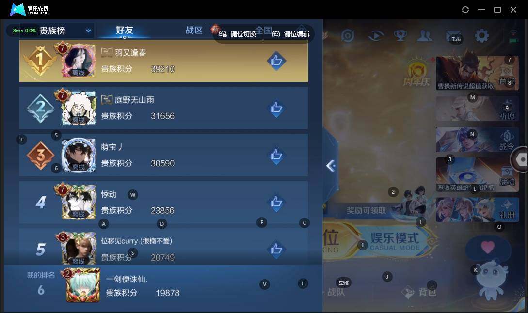 - [11571840]V6 1典藏 2传说 124英雄 214皮肤 可修改实名 荣耀水晶:幻阙歌(貂蝉典藏) 传说皮:炽阳神光 珍宝阁皮:妄想食味,优雅恋人,蔷薇恋人,女武神 限定皮:鸣野蒿,山海·碧波行(瑶年限),遇见飞天,高山流水,五谷丰年,游园惊梦,梁祝,李小龙 史诗皮:星界战将,蒙犽顽岩魄,紫霞仙子,苍穹之光,永昼,江河有灵,蒙恬荣光圣徽,冰冠公主,偶像歌手,晚萤,魅语,电玩·爆裂旋风,暗夜猫娘,末日机甲-吕布,猫狗日记-孙策,猫狗日记-大乔,时之恋人-孙尚香,乱世虎臣,节奏热浪,女仆咖啡,摇滚巨星,水果甜心,绅士熊喵,天才门将,功夫厨神,德古拉伯爵,暗隐猎兽者,幽灵船长,鬼剑武藏,纤云弄巧,繁星吟游(呼啦呼啦),缤纷独角兽,乘风破浪,逐浪之夏,热力回旋,箭羽风息,金属风暴,原初追逐者,圣诞狂欢,圣诞恋歌,鹰眼统帅,魅力维加斯,黎明之约,千筹问战,未来纪元-赵云
