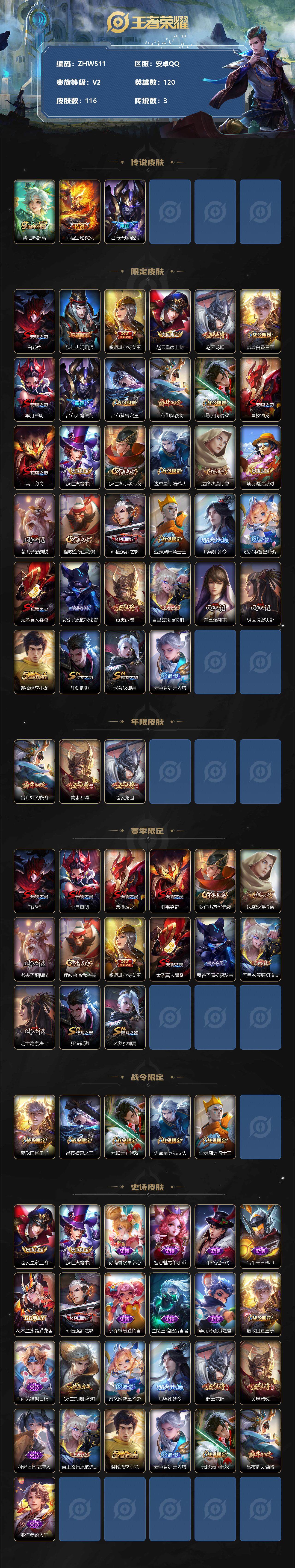 [12520048]【特价急出/详情看图】:安卓Q-V2-永恒钻石IV段位-120英雄-116皮肤-3传说-25史诗