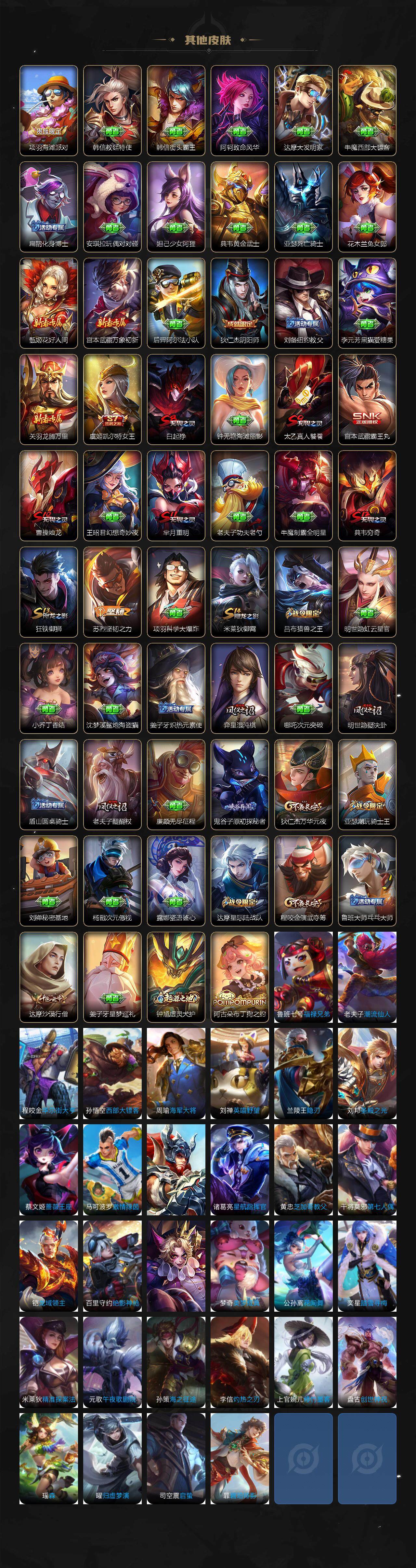 【其他皮肤】:项羽海滩派对,韩信教廷特使,韩信街头霸王,阿轲致命风华,达摩大发明家,牛魔西部大镖客,扁鹊化身博士,安琪拉玩偶对对碰,妲己少女阿狸,典韦黄金武士,亚瑟死亡骑士,花木兰兔女郎,甄姬花好人间,宫本武藏万象初新,后羿阿尔法小队,狄仁杰阴阳师,刘备纽约教父,李元芳黑猫爱糖果,关羽龙腾万里,虞姬凯尔特女王,白起狰,钟无艳海滩丽影,太乙真人饕餮,宫本武藏霸王丸,曹操烛龙,王昭君幻想奇妙夜,芈月重明,老夫子功夫老勺,牛魔制霸全明星,典韦穷奇,狂铁御狮,苏烈坚韧之力,项羽科学大爆炸,米莱狄御霄,吕布猎兽之王,明世隐虹云星官,小乔丁香结,沈梦溪鲨炮海盗猫,姜子牙炽热元素使,弈星混沌棋,哪吒次元突破,明世隐疑决卦,盾山