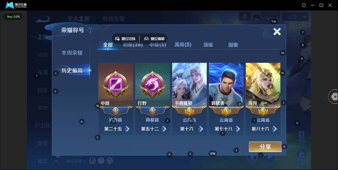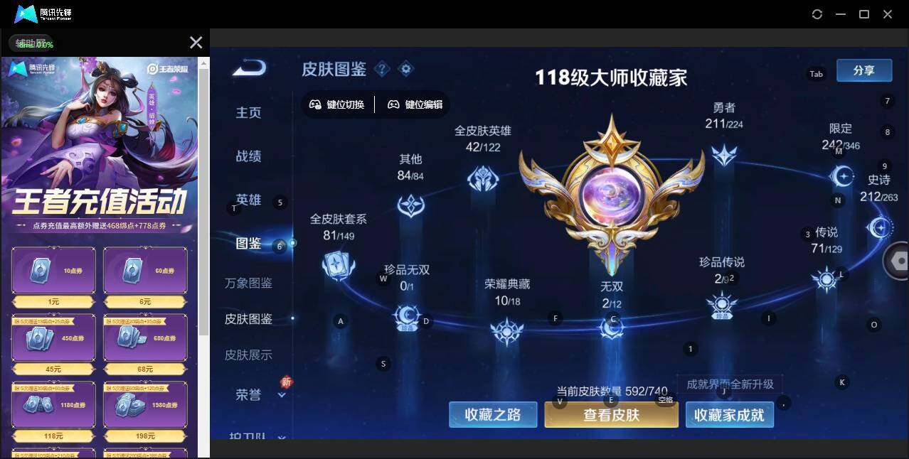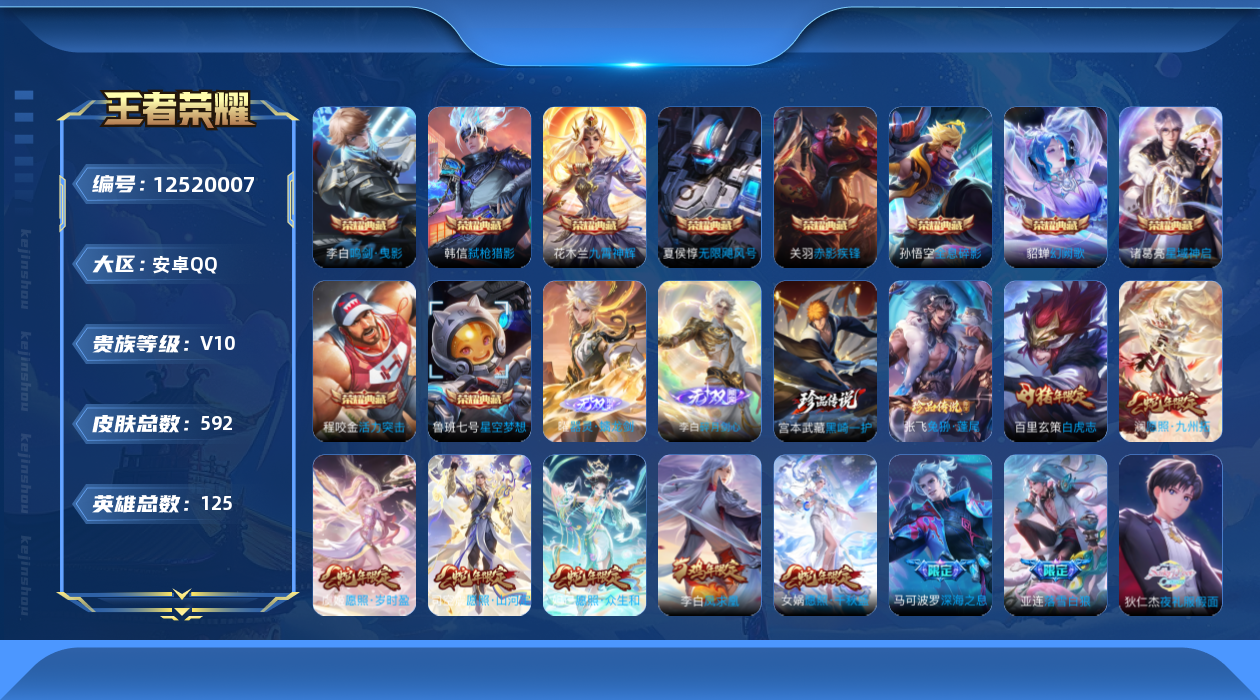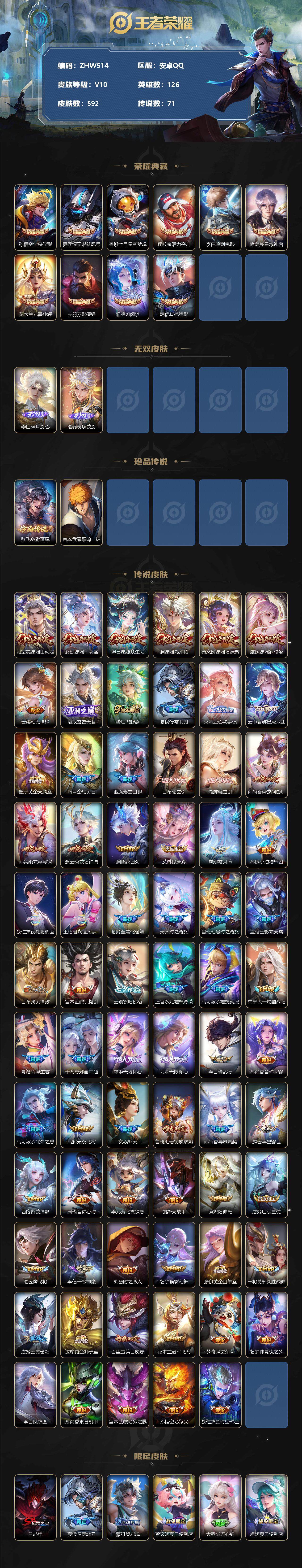 [12520007]【特价急出/详情看图】:安卓Q-V10-至尊星耀II段位-126英雄-592皮肤-10典藏-2无双-2珍品传说-71传说-212史诗