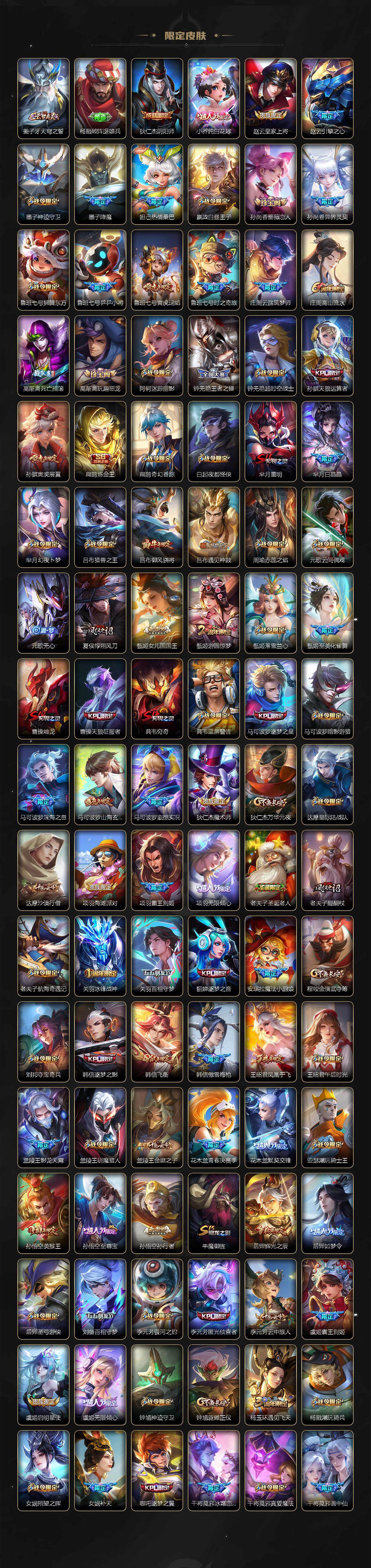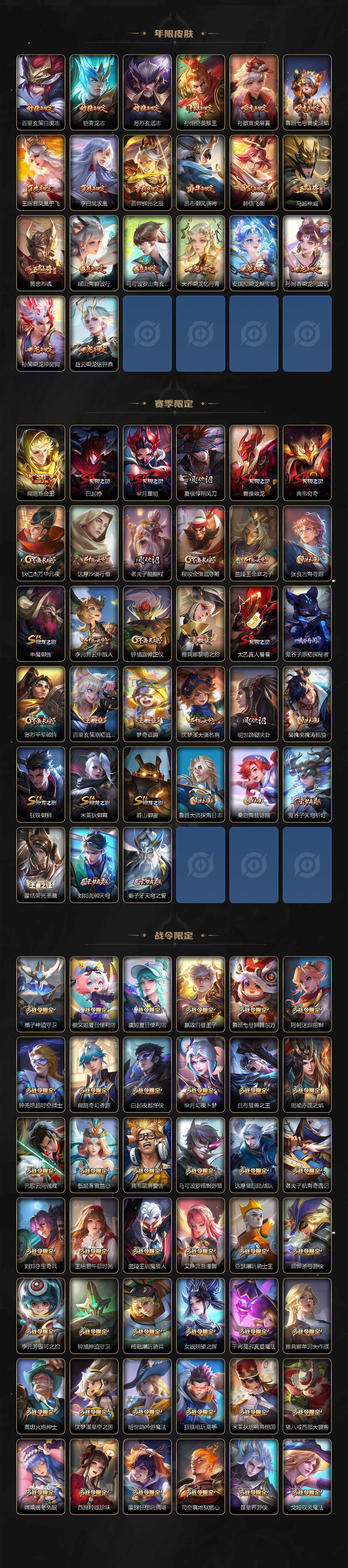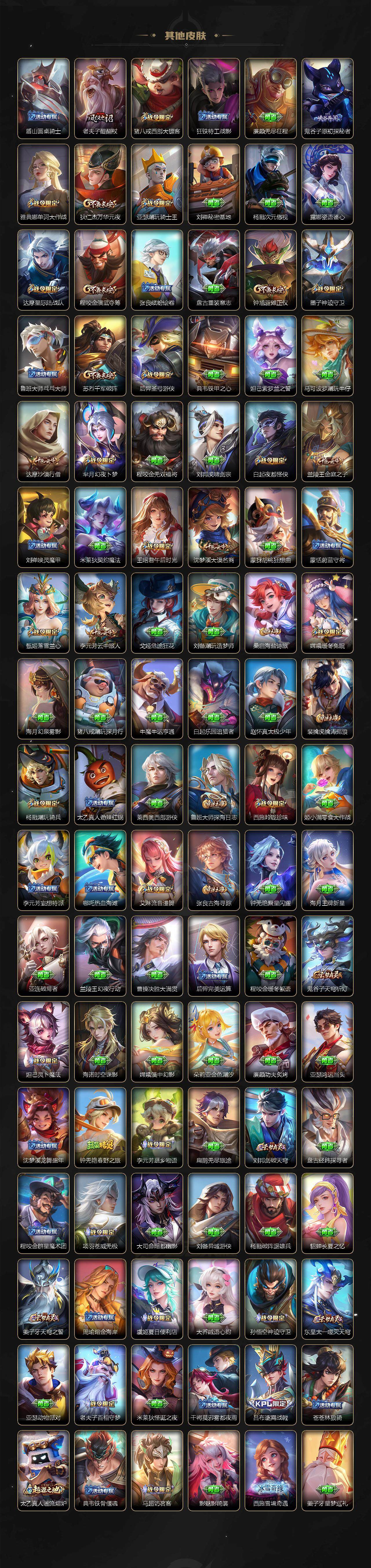 小乔青蛇,大乔白蛇,瑶遇见神鹿,娜可露露晚萤,伽罗箭羽风息,李元芳逐浪之夏,不知火舞魅语,公孙离无限星赏官,大乔猫狗日记,孙策猫狗日记,阿轲节奏热浪,露娜紫霞仙子,诸葛亮黄金分割率,王昭君偶像歌手,韩信白龙吟,项羽苍穹之光,孙尚香时之恋人,阿轲暗夜猫娘,雅典娜冰冠公主,吕布末日机甲,鲁班七号电玩小子,蒙犽龙鼓争鸣,橘右京修罗,墨子龙骑士,嬴政摇滚巨星,刘禅绅士熊喵,刘禅天才门将,白起星夜王子,安琪拉心灵骇客,安琪拉时之奇旅,程咬金功夫厨神,刘邦德古拉伯爵,兰陵王暗隐猎兽者,曹操幽灵船长,宫本武藏鬼剑武藏,司马懿暗渊魔法,亚瑟心灵战警,钟馗乐园奇幻夜,杨戬天秀·启明,蔡文姬舞动绿茵,廉颇地狱岩魂,西施诗语江南,小乔缤纷独角兽,夏侯惇乘风破浪,花木兰水晶猎龙者,铠曙光守护者,百里玄策热力回旋,墨子金属风暴,百里玄策原初追逐者,吕布圣诞狂欢,貂蝉圣诞恋歌,百里守约特工魅影,嬴政暗夜贵公子,嫦娥拒霜思,雅典娜黎明之约,李白千年之狐,哪吒雪上飞焰,夏洛特永昼,澜赏金猎手,艾琳奇遇舞章,貂蝉唤灵魅影,高渐离天秀·音浪,张良千筹问战,庄周天秀·幻梦,弈星滕王阁序,阿古朵顽趣,镜玫瑰异探,杨玉环银翎春语,刘备百相守梦,关羽百相守梦,沈梦溪匿光破解者,蔡文姬电玩·兔顽号,刘禅电玩·爆裂旋风,海月浮梦罗烟,镜真我赫兹,百里守约真我赫兹,赵怀真鹤归松栖,莱西奥末日机甲,李元芳匿光侦查者,姜子牙闲日渔趣,蒙犽百解令,高渐离燃音魔法,伽罗琥珀纪元,大乔乘龙·忆丹青,安琪拉乘龙·聚宝船,桑启奇遇星旅,上官婉儿群星魔术团,关羽决胜骁骑,明世隐夜落电台,海诺心动手记,姬小满飞车小橘子,白起苍鳞隐世,赵怀真器灵·浮梦炉,苍狼魂孤将
