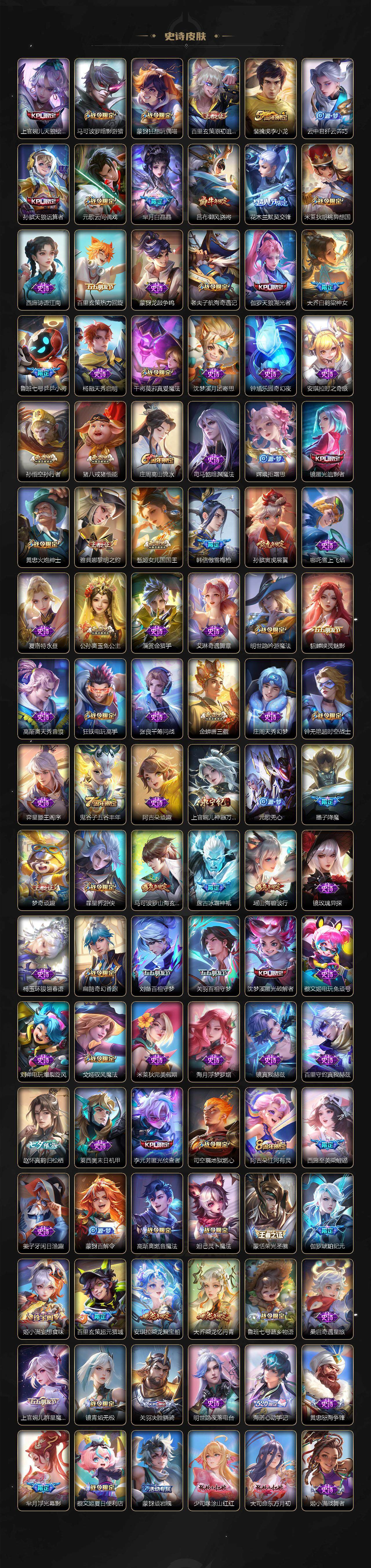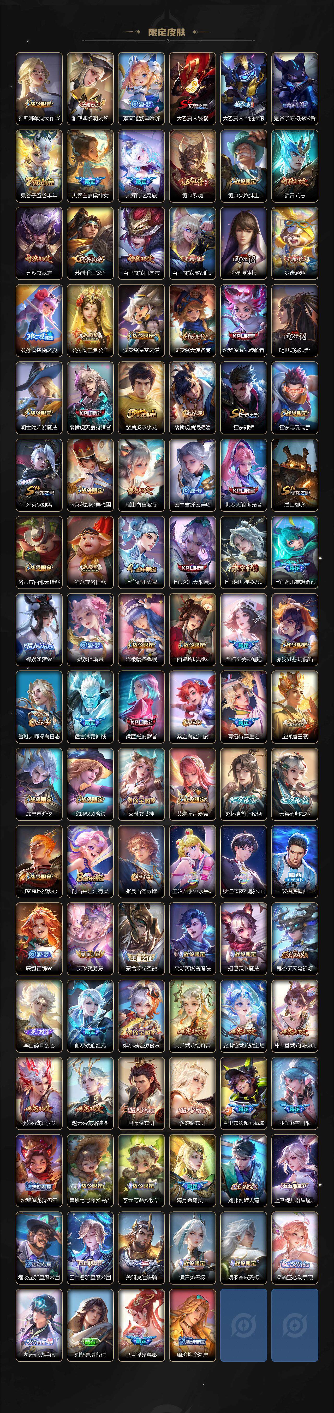 扁鹊炼金王,白起狰,太乙真人饕餮,曹操烛龙,芈月重明,典韦穷奇,狂铁御狮,米莱狄御霄,牛魔御旌,盾山御銮,夏侯惇朔风刀,明世隐疑决卦,老夫子醍醐杖,鬼谷子原初探秘者,狄仁杰万华元夜,程咬金演武夺筹,钟馗驱傩正仪,苏烈千军破阵,吕布猎兽之王,嬴政白昼王子,女娲朔望之晖,典韦蓝屏警告,钟馗神迹守卫,鲁班七号狮舞东方,沈梦溪星空之诺,李元芳银河之约,刘邦夺宝奇兵,马可波罗暗影游猎,蒙犽狂想玩偶喵,元歌云间偶戏,弈星混沌棋,达摩沙漠行僧,兰陵王金庭之子,沈梦溪大漠名商,李元芳云中旅人,桑启海盐诗旅,裴擒虎擒涛扼浪,鲁班大师探海日志,张良古海寻踪,项羽苍威无极,镜青焰无极