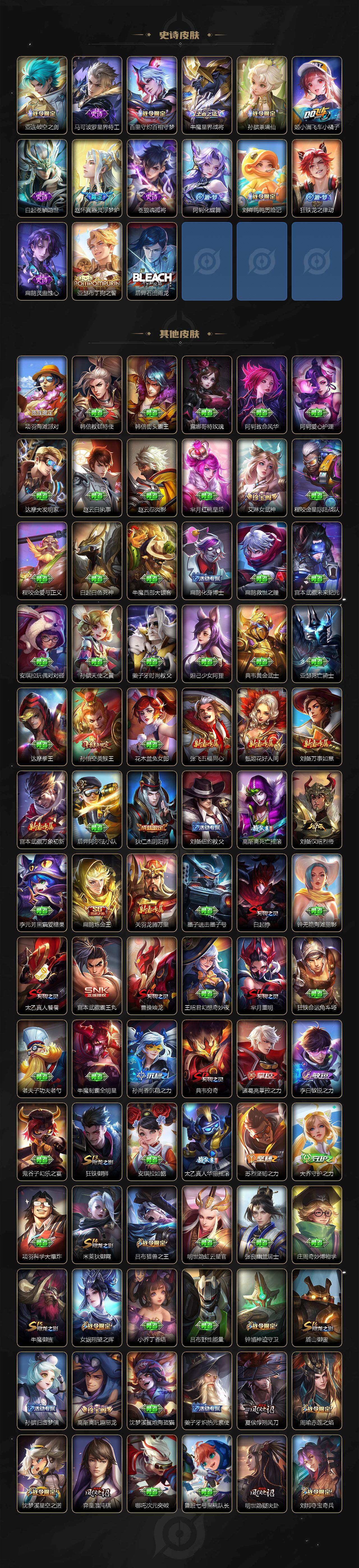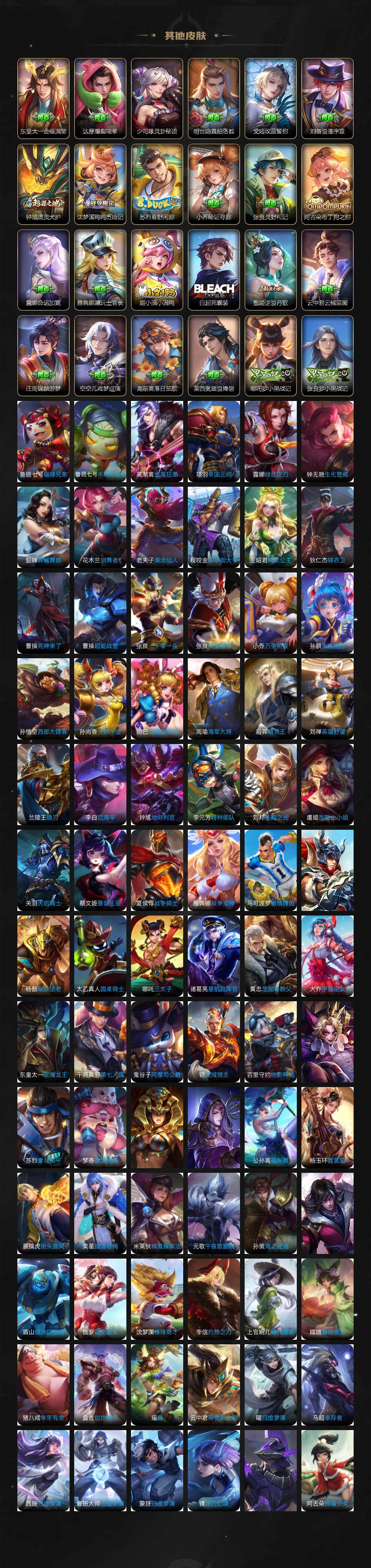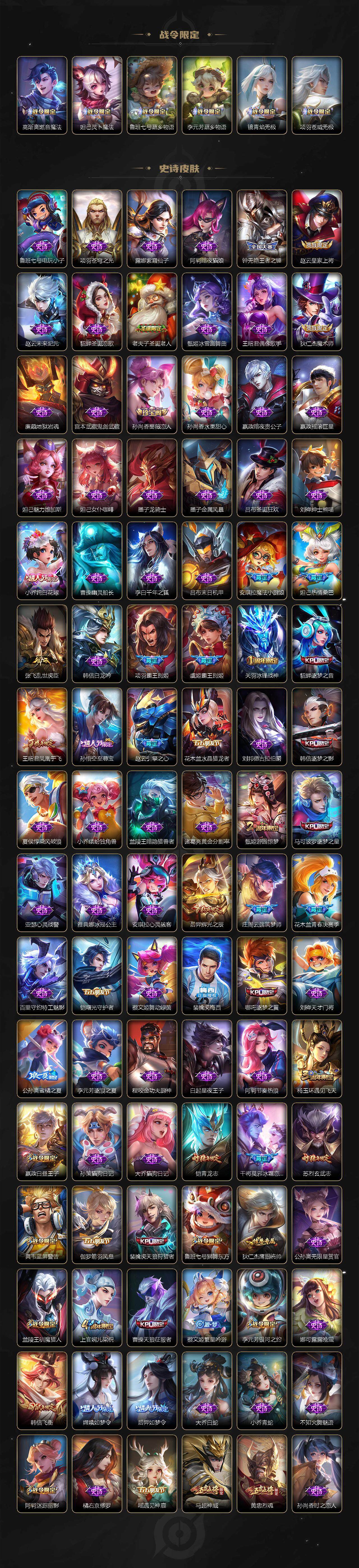 【英雄全皮】:墨子全皮,刘禅全皮,高渐离全皮,阿轲全皮,扁鹊全皮,白起全皮,宫本武藏全皮,达摩全皮,程咬金全皮,姜子牙全皮,刘邦全皮,孙权全皮,张良全皮,刘备全皮,李元芳全皮,钟馗全皮,苍全皮,女娲全皮,哪吒全皮,太乙真人全皮,苏烈全皮,沈梦溪全皮,狂铁全皮,米莱狄全皮,猪八戒全皮,上官婉儿全皮,海月全皮,蒙犽全皮,蒙恬全皮,镜全皮,阿古朵全皮,夏洛特全皮,司空震全皮,金蝉全皮,赵怀真全皮,戈娅全皮,空空儿全皮,影全皮,海诺全皮,姬小满全皮,少司缘全皮