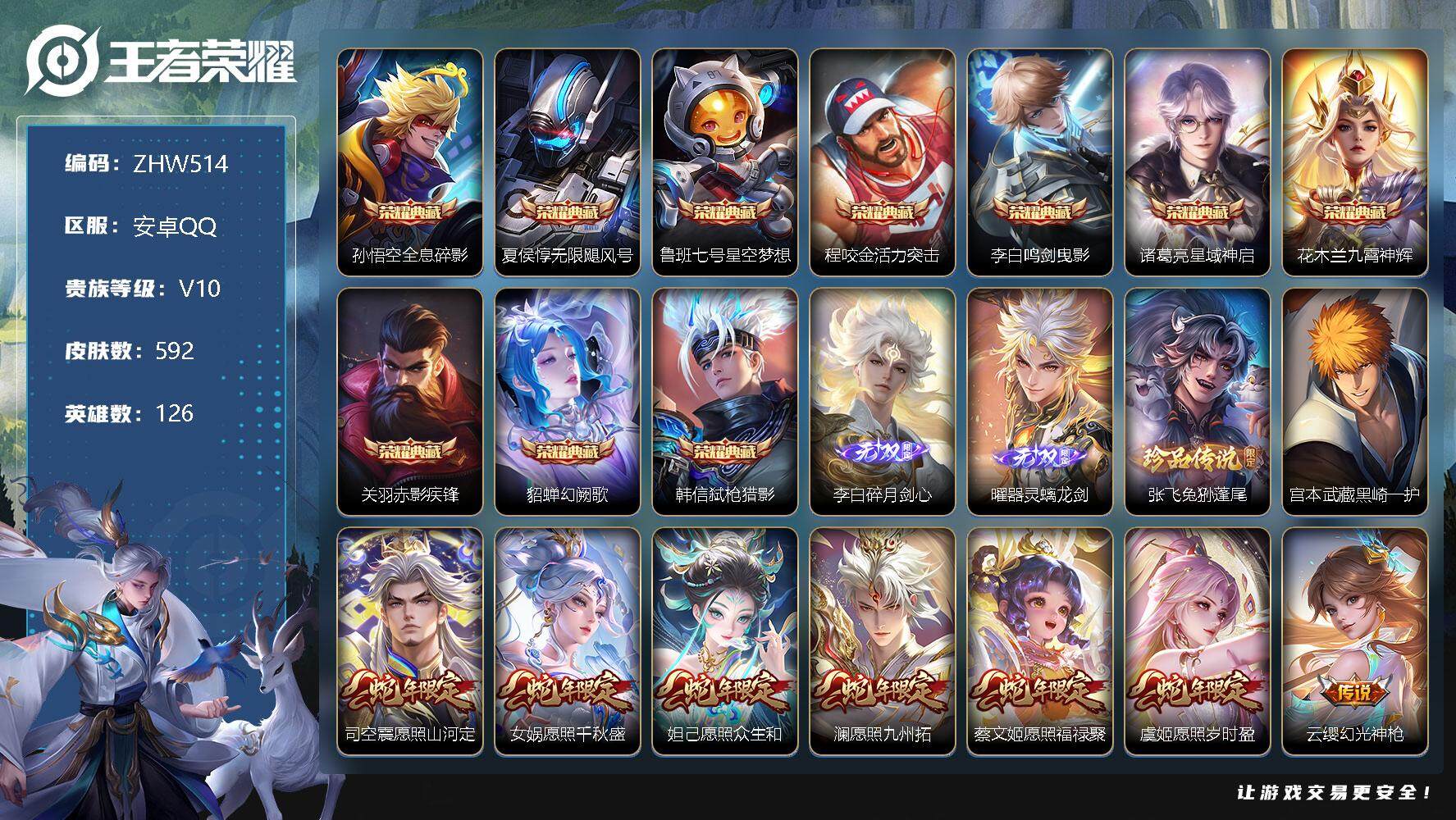 [12520007]【特价急出/详情看图】:安卓Q-V10-至尊星耀II段位-126英雄-592皮肤-10典藏-2无双-2珍品传说-71传说-212史诗 【英雄全皮】:墨子全皮,刘禅全皮,高渐离全皮,阿轲全皮,扁鹊全皮,白起全皮,宫本武藏全皮,达摩全皮,程咬金全皮,姜子牙全皮,刘邦全皮,孙权全皮,张良全皮,刘备全皮,李元芳全皮,钟馗全皮,苍全皮,女娲全皮,哪吒全皮,太乙真人全皮,苏烈全皮,沈梦溪全皮,狂铁全皮,米莱狄全皮,猪八戒全皮,上官婉儿全皮,海月全皮,蒙犽全皮,蒙恬全皮,镜全皮,阿古朵全皮,夏洛特全皮,司空震全皮,金蝉全皮,赵怀真全皮,戈娅全皮,空空儿全皮,影全皮,海诺全皮,姬小满全皮,少司缘全皮 【荣耀典藏】:孙悟空全息碎影,夏侯惇无限飓风号,鲁班七号星空梦想,程咬金活力突击,李白鸣剑曳影,诸葛亮星域神启,花木兰九霄神辉,关羽赤影疾锋,貂蝉幻阙歌,韩信弑枪猎影 【无双皮肤】:李白碎月剑心,曜器灵螭龙剑 【珍品传说】:张飞兔狲蓬尾,宫本武藏黑崎一护 【传说皮肤】:司空震愿照山河定,女娲愿照千秋盛,妲己愿照众生和,澜愿照九州拓,蔡文姬愿照福禄聚,虞姬愿照岁时盈,云缨幻光神枪,嬴政玄雷天君,桑启鸣野蒿,夏侯惇霜北刀,朵莉亚心动手记,云中君群星魔术团,墨子黄金天蝎座,海月金乌负日,亚连落雪白狼,吕布曦玄引,貂蝉曦玄引,孙尚香乘龙问璇玑,孙策乘龙淬吴钩,赵云乘龙铭钟鼎,澜逐花归海,艾琳觅芳踪,露娜霜月吟,孙膑小动物乐团,狄仁杰夜礼服假面,王昭君永恒水手月亮,甄姬至美化雀舞,大乔时之奇旅,鲁班七号时之奇旅,兰陵王影龙天霄,吕布遇见神鼓,宫本武藏惊梅引,云缨鹤归松栖,上官婉儿妄想奇谈,马可波罗妄想实况,东皇太一灼幽烈阳,夏洛特浮生妄,干将莫邪画中仙,虞姬无限倾心,项羽无限倾心,李白诗剑行,孙尚香音你闪耀,马可波罗深海之息,马超无双飞将,女娲补天,鲁班七号寅虎瑞焰,孙尚香异界灵契,赵云淬星耀世,西施游龙清影,周瑜音你心动,李元芳飞鸢探春,铠绛天战甲,镜炽阳神光,虞姬启明星使,曜云鹰飞将,李信一念神魔,刘备时之恋人,貂蝉猫影幻舞,张良黄金白羊座,干将莫邪久胜战神,虞姬云霓雀翎,达摩黄金狮子座,百里玄策白虎志,花木兰冠军飞将,梦奇胖达荣荣,貂蝉仲夏夜之梦,李白凤求凰,孙尚香末日机甲,宫本武藏地狱之眼,孙悟空地狱火,狄仁杰超时空战士 【限定皮肤】:白起狰,夏侯惇霜北刀,蒙犽顽岩魄,蔡文姬夏日便利店