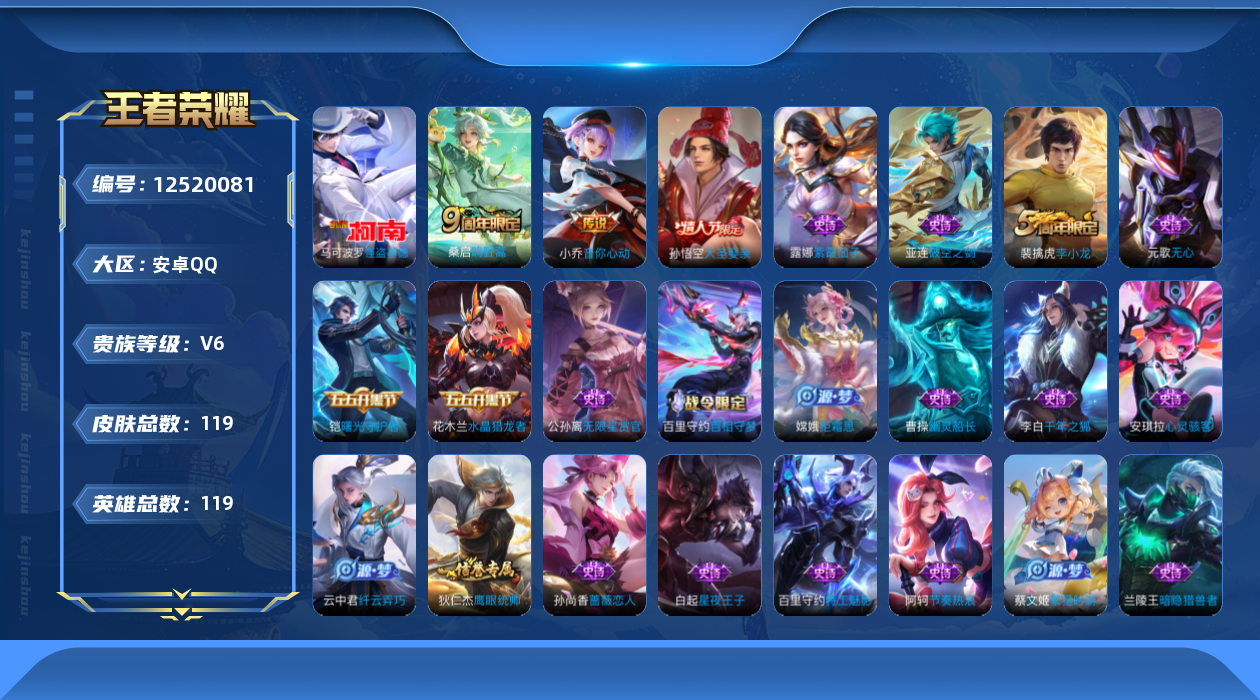 [12520081]【特价急出/详情看图】:安卓Q-V6-荣耀黄金I段位-119英雄-119皮肤-1珍品传说-2传说-32史诗