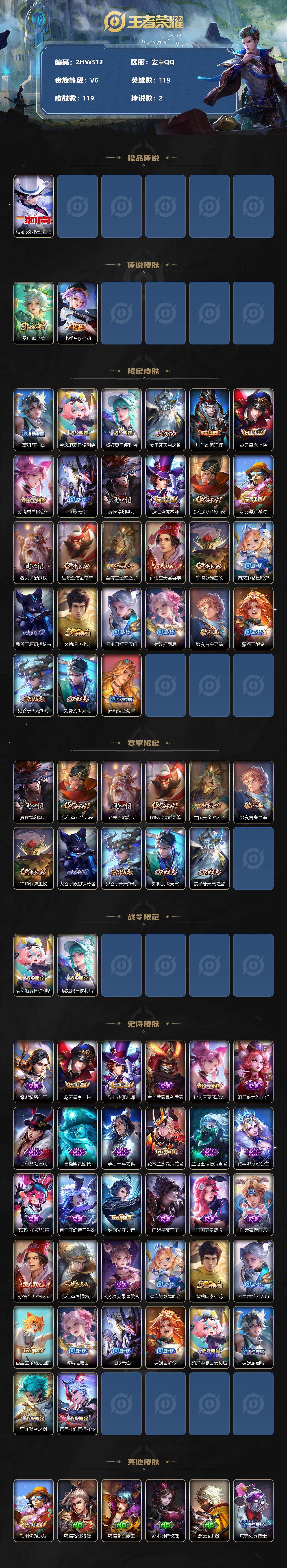 - PX_2102730-实名: 可修改 贵族等级: V5 英雄数: 121 皮肤数: 99 传说皮: 黄金狮子座,久胜战神,无双飞将,琥珀纪元铠,琥珀纪元马超 限定皮: 梁祝,鸣野蒿