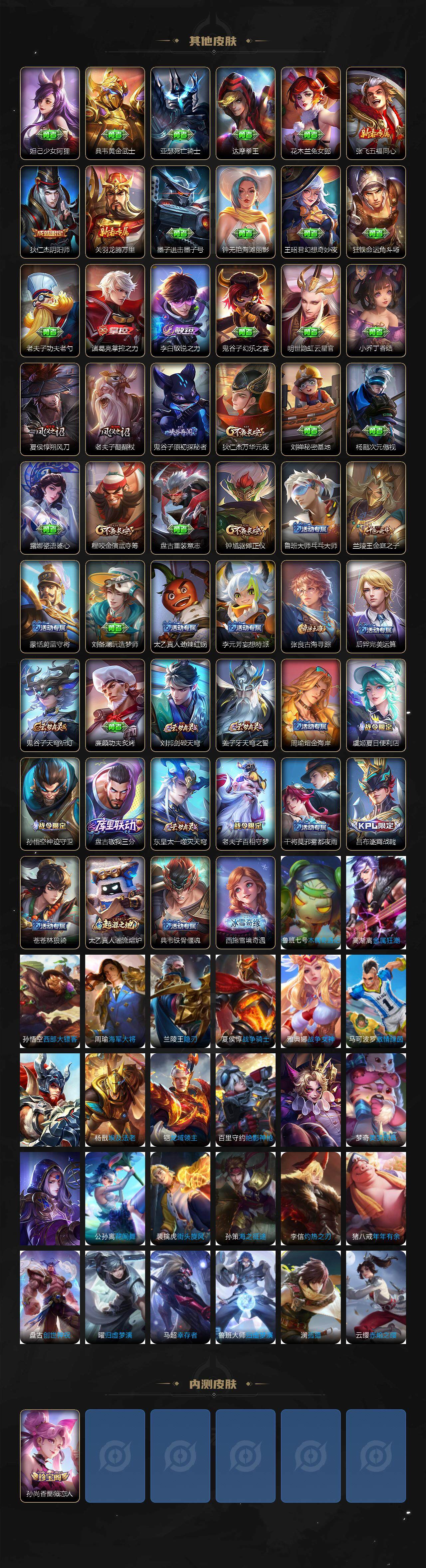 【其他皮肤】:项羽海滩派对,韩信教廷特使,韩信街头霸王,露娜哥特玫瑰,赵云忍炎影,扁鹊化身博士,妲己少女阿狸,典韦黄金武士,亚瑟死亡骑士,达摩拳王,花木兰兔女郎,张飞五福同心,狄仁杰阴阳师,关羽龙腾万里,墨子进击墨子号,钟无艳海滩丽影,王昭君幻想奇妙夜,狂铁命运角斗场,老夫子功夫老勺,诸葛亮掌控之力,李白敏锐之力,鬼谷子幻乐之宴,明世隐虹云星官,小乔丁香结,夏侯惇朔风刀,老夫子醍醐杖,鬼谷子原初探秘者,狄仁杰万华元夜,刘禅秘密基地,杨戬次元傲视,露娜瓷语鉴心,程咬金演武夺筹,盘古重装意志,钟馗驱傩正仪,鲁班大师乓乓大师,兰陵王金庭之子,蒙恬蔚蓝守将,刘备潮玩造梦师,太乙真人劲辣红锅,李元芳妄想特派,张良古海寻踪,后羿完美运算,鬼谷子天穹祈灯,廉颇功夫炙烤,刘邦剑破天穹,