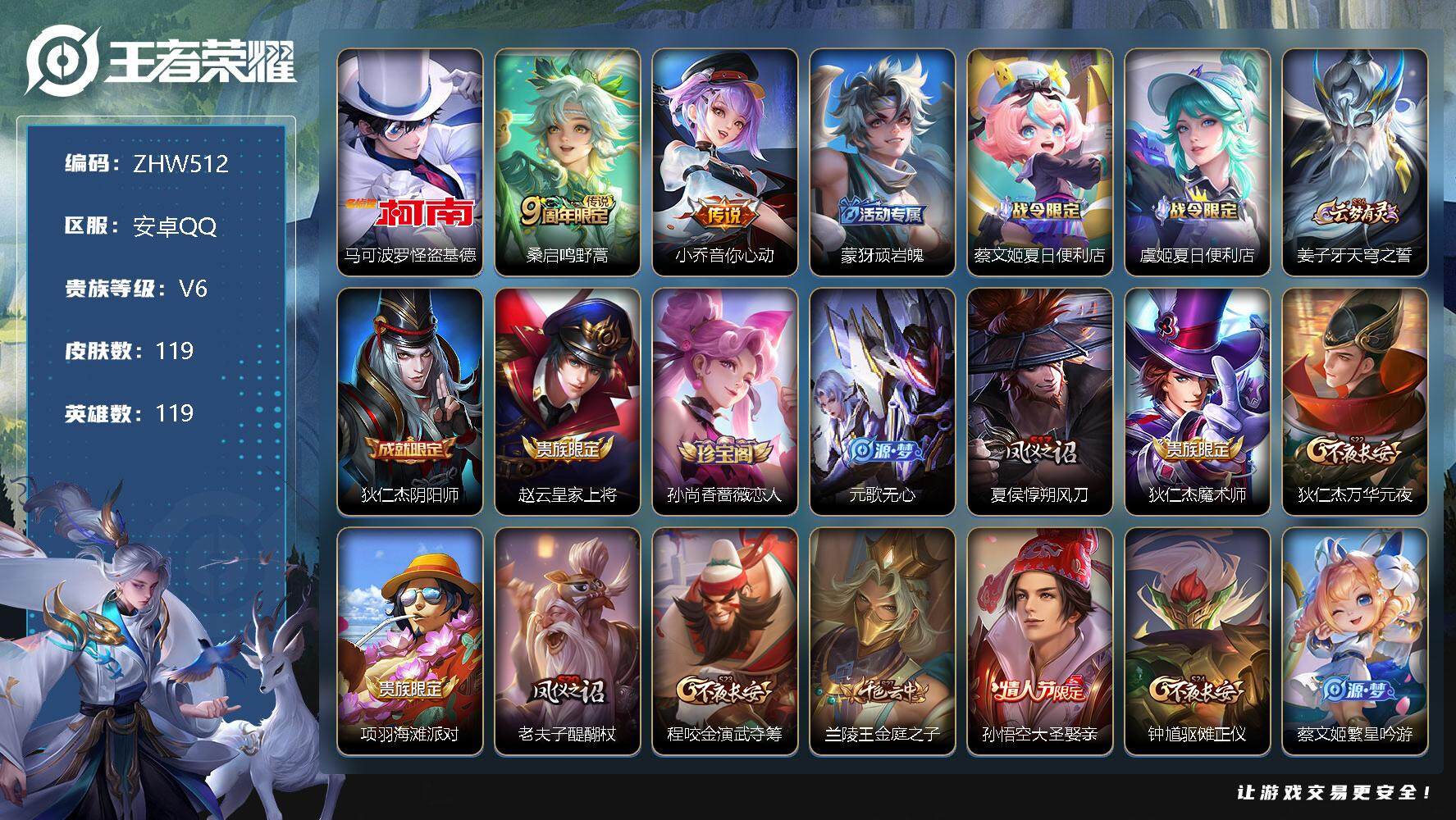 [12520081]【特价急出/详情看图】:安卓Q-V6-荣耀黄金I段位-119英雄-119皮肤-1珍品传说-2传说-32史诗 【珍品传说】:马可波罗怪盗基德 【传说皮肤】:桑启鸣野蒿,小乔音你心动 【限定皮肤】:蒙犽顽岩魄,蔡文姬夏日便利店,虞姬夏日便利店,姜子牙天穹之誓,狄仁杰阴阳师,赵云皇家上将,孙尚香蔷薇恋人,元歌无心,夏侯惇朔风刀,狄仁杰魔术师,狄仁杰万华元夜,项羽海滩派对,老夫子醍醐杖,程咬金演武夺筹,兰陵王金庭之子,孙悟空大圣娶亲,钟馗驱傩正仪,蔡文姬繁星吟游,鬼谷子原初探秘者,裴擒虎李小龙,云中君纤云弄巧,嫦娥拒霜思,张良古海寻踪,蒙犽百解令,鬼谷子天穹祈灯,刘邦剑破天穹,周瑜熔金海岸 【赛季限定】:夏侯惇朔风刀,狄仁杰万华元夜,老夫子醍醐杖,程咬金演武夺筹,兰陵王金庭之子,张良古海寻踪,钟馗驱傩正仪,鬼谷子原初探秘者,鬼谷子天穹祈灯,刘邦剑破天穹,姜子牙天穹之誓 【战令限定】:蔡文姬夏日便利店,虞姬夏日便利店 【史诗皮肤】:露娜紫霞仙子,赵云皇家上将,狄仁杰魔术师,宫本武藏鬼剑武藏,孙尚香蔷薇恋人,妲己魅力维加斯,吕布圣诞狂欢,曹操幽灵船长,李白千年之狐,花木兰水晶猎龙者,兰陵王暗隐猎兽者,雅典娜冰冠公主,安琪拉心灵骇客,百里守约特工魅影,铠曙光守护者,白起星夜王子,阿轲节奏热浪,孙策猫狗日记,孙悟空大圣娶亲,狄仁杰鹰眼统帅,公孙离无限星赏官,蔡文姬繁星吟游,裴擒虎李小龙,云中君纤云弄巧,百里玄策热力回旋,嫦娥拒霜思,元歌无心,蒙犽百解令,蔡文姬夏日便利店,蒙犽顽岩魄,亚连破空之剑,百里守约百相守梦 【其他皮肤】:项羽海滩派对,韩信教廷特使,韩信街头霸王,露娜哥特玫瑰,赵云忍炎影,扁鹊化身博士,妲己少女阿狸,典韦黄金武士,亚瑟死亡骑士,达摩拳王,花木兰兔女郎,张飞五福同心,狄仁杰阴阳师,关羽龙腾万里,墨子进击墨子号,钟无艳海滩丽影,王昭君幻想奇妙夜,狂铁命运角斗场,老夫子功夫老勺,诸葛亮掌控之力,李白敏锐之力,鬼谷子幻乐之宴,明世隐虹云星官,小乔丁香结,夏侯惇朔风刀,老夫子醍醐杖,鬼谷子原初探秘者,狄仁杰万华元夜,刘禅秘密基地,杨戬次元傲视,露娜瓷语鉴心,程咬金演武夺筹,盘古重装意志,钟馗驱傩正仪,鲁班大师乓乓大师,兰陵王金庭之子,蒙恬蔚蓝守将,刘备潮玩造梦师,太乙真人劲辣红锅,李元芳妄想特派,张良古海寻踪,后羿完美运算,鬼谷子天穹祈灯,廉颇功夫炙烤,刘邦剑破天穹,