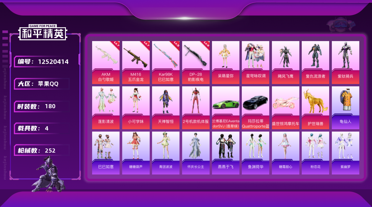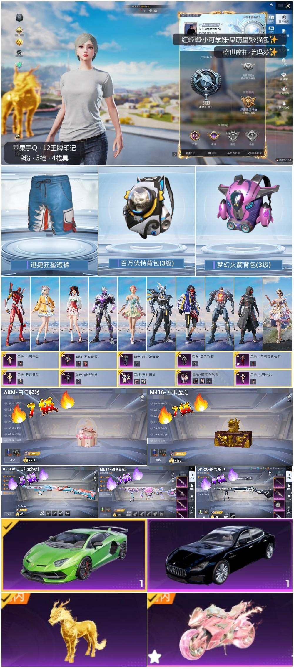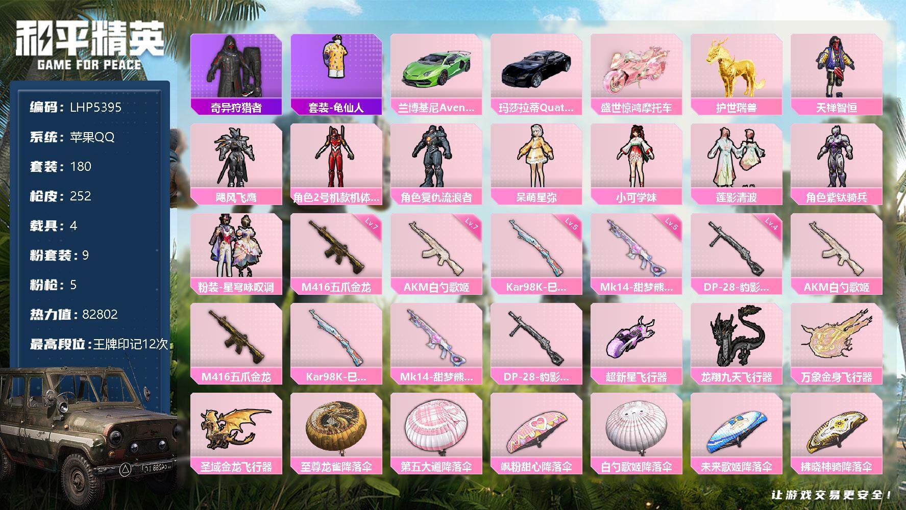 [12520414]素材身法号/地铁满天赋【特价急出/详情看图】:苹果 手Q-9粉装-5特效枪-4载具-5粉色飞行器-8.2w热力值-12王牌印记-180套装-252枪皮【热门品类】:套装-奇异狩猎者,套装-龟仙人【粉色载具】:兰博基尼Aventador SVJ(翡翠绿),玛莎拉蒂Quattroporte(夜幕蓝),盛世惊鸿摩托车,护世瑞兽【粉色套装】:粉装-天禅智恒,粉装-飓风飞鹰,角色-2号机款机体服,角色-复仇流浪者,角色-呆萌星弥,角色-小可学妹,粉装-莲影清波,角色-紫钛骑兵,粉装-星穹咏叹调【粉色枪皮等级】:AKM-白勺歌姬(七级),M416-五爪金龙(七级),Kar98K-巳巳如意(五级),Mk14-甜梦熊击(五级),DP-28-豹影疾电(四级)【粉色飞行器】:超新星飞行器,龙翔九天飞行器,万象金身飞行器,圣域金龙飞行器