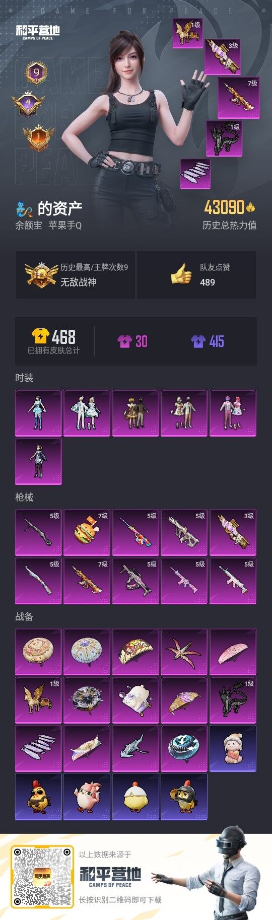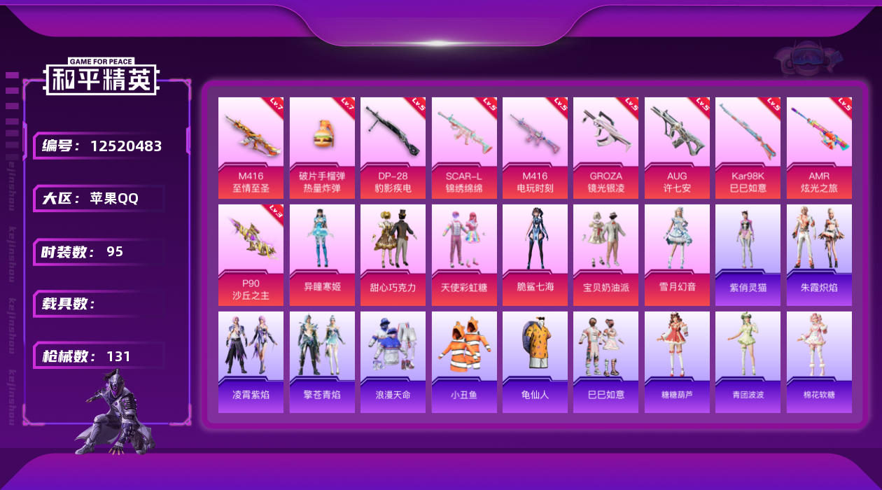 [12520483]素材身法号/无敌战神框1【特价急出/详情看图】:苹果 手Q-无敌战神框-6粉装-10特效枪-6粉色飞行器-4.3w热力值-9王牌印记-95套装-131枪皮【热门品类】:套装-浪漫天命,套装-派对舞王,套装-小丑鱼,套装-奇异狩猎者,套装-龟仙人【粉色套装】:粉装-甜心巧克力,粉装-宝贝奶油派,粉装-天使彩虹糖,角色-脆鲨七海,粉装-雪月幻音,角色-异瞳寒姬【粉色枪皮等级】:SCAR-L-锦绣绵绵(五级),M416-至情至圣(七级),M416-电玩时刻(五级),GROZA-镜光银凌(五级),AUG-许七安(五级),P90-沙丘之主(三级),Kar98K-巳巳如意(五级),AMR-炫光之旅(五级),DP-28-豹影疾电(五级),破片手榴弹-热量炸弹(七级)【粉色飞行器】:酣梦熊熊飞行器,沙丘之主天马,镜域双华-灵镜之阶,龙翔九天飞行器,脆鲨七海飞行器