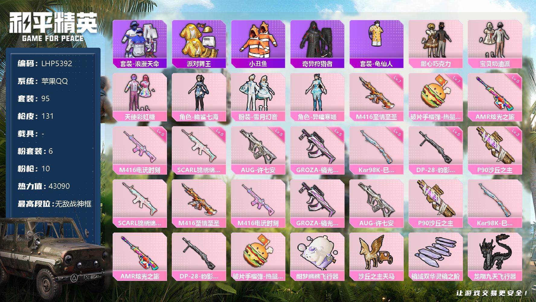 - [13788340]【店主推荐捡漏号!可直接换绑苹果 手Q-24粉装-10特效枪-3载具-2粉色飞行器-79270热力值-13王牌印记-177套装-210枪皮【热门品类】:粉装-梦幻火箭,粉装-童趣迷兔,粉装-缤纷油彩,套装-浪漫天命,角色-军刀雅典娜,套装-胖达圆圆,套装-龟仙人,套装-红熊茄茄【粉色载具】:迈凯伦570S(天际蓝),Formula E Gen2(巅峰兰),俏皮小熊猫【粉色套装】:粉装-甜心巧克力,粉装-宝贝奶油派,粉装-天使彩虹糖,粉装-梦幻火箭,粉装-缤纷油彩,粉装-甜蜜誓约,粉装-冰霜白皇,粉装-童趣迷兔,粉装-彩虹鹿灵,粉装-绒雪飘舞,粉装-傲雪凌霜,粉装-霁雪冰心,粉装-灵感创作师,粉装-彩虹甜喵,女娲后裔-赵灵儿,粉装-冰川红玫,粉装-寒光使者,粉装-海螺星光,角色-茉莉星,角色-圣堂之誓,角色-美雪,角色-千金淑猫,角色-羊梦糖心,角色-异瞳寒姬【粉色枪皮等级】:SCAR-L-锦绣绵绵(五级),M416-五爪金龙(七级),M416-电玩时刻(五级),GROZA-旋转彩虹(七级),AUG-妙趣可丽(七级),UMP45-量子极限(五级),Kar98K-巳巳如意(五级),M417-第五大道(四级),M249-彩虹甜喵(七级),DP-28-豹影疾电(五级)【粉色枪皮】:SCAR-L-锦绣绵绵,M416-五爪金龙,M416-电玩时刻,GROZA-旋转彩虹,AUG-妙趣可丽,UMP45-量子极限,Kar98K-巳巳如意,M417-第五大道,M249-彩虹甜喵,DP-28-豹影疾电【粉色飞行器】:绒雪飘舞飞行器,繁龙极客飞行器
