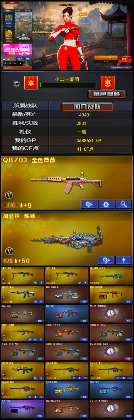 【英雄级武器】:柯尔特-电竞装甲,麒麟刺-堕天神,龙啸-堕天神,M4A1-武圣,Glock18-武圣,烈火-动感闪耀,天神-动感闪耀,屠龙-动感闪耀,手雷-动感闪耀,QBZ03-金色蔷薇,M4A1-雷神,M4A1-黑龙,RPK-盘龙*2,加特林-炼狱,AK47-火麒麟,AK12-天启,AWM-天龙,Barrett-毁灭*3,Barrett-极光*2,黑骑士-海王,AK-47-猩红传说*2,AK47-B-战神*2,AK47-B-常胜将军,沙鹰-天神,沙鹰-修罗,擎天,龙啸*2,屠龙