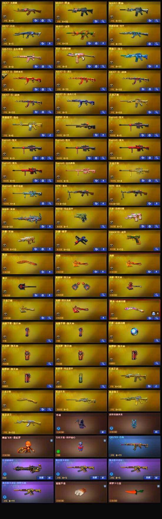 【稀有皮肤】:雷神-荣耀之魄,雷神-虎将,火麒麟-平天大圣,毁灭耀金皮肤,毁灭-星空,毁灭-黑大圣皮肤,毁灭-风暴,AWM-天龙-传奇70KG,AK47-黑武士-361,烈龙-星空,龙啸-醒狮 皮肤