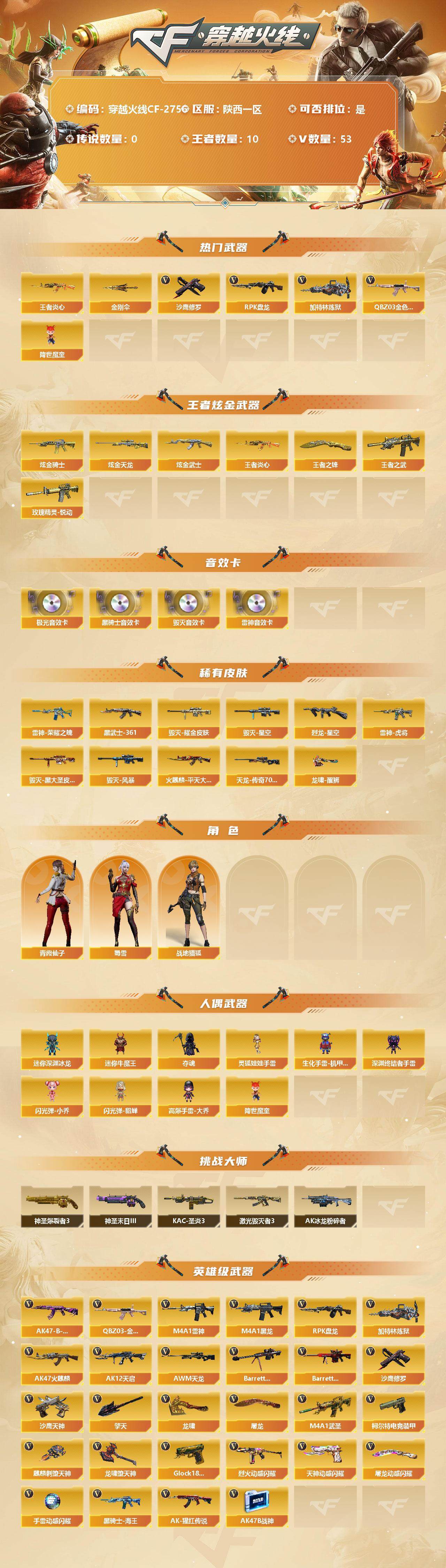 [12520936]【商品标题】:陕西一区-53V-10王者-3炫金 【热门武器】:QBZ03-金色蔷薇,王者炎心,RPK-盘龙*2,加特林-炼狱,降世魔童,沙鹰-修罗,金刚伞 【王者炫金武器】:炫金骑士,炫金天龙,炫金武士,王者炎心,王者之武,玫瑰精灵-悦动,王者之锋 【音效卡】:M4A1-雷神音效卡,M4A1-黑骑士音效卡,Barrett-毁灭音效卡,Barrett-极光音效卡*2 【稀有皮肤】:雷神-荣耀之魄,雷神-虎将,火麒麟-平天大圣,毁灭耀金皮肤,毁灭-星空,毁灭-黑大圣皮肤,毁灭-风暴,AWM-天龙-传奇70KG,AK47-黑武士-361,烈龙-星空,龙啸-醒狮 皮肤 【角色】:战地猎狐,蜀雪,青霞仙子 【人偶武器】:降世魔童,迷你深渊冰龙,迷你牛魔王,夺魂,灵狐娃娃手雷,生化手雷-机甲核心,深渊终结者手雷,闪光弹-小乔,闪光弹-貂蝉,高爆手雷-大乔 【挑战大师】:神圣爆裂者III,神圣爆裂者-末日III,KAC-圣炎切割者III,激光毁灭者III*2,AK47-冰龙粉碎者 【英雄级武器】:柯尔特-电竞装甲,麒麟刺-堕天神,龙啸-堕天神,M4A1-武圣,Glock18-武圣,烈火-动感闪耀,天神-动感闪耀,屠龙-动感闪耀,手雷-动感闪耀,QBZ03-金色蔷薇,M4A1-雷神,M4A1-黑龙,RPK-盘龙*2,加特林-炼狱,AK47-火麒麟,AK12-天启,AWM-天龙,Barrett-毁灭*3,Barrett-极光*2,黑骑士-海王,AK-47-猩红传说*2,AK47-B-战神*2,AK47-B-常胜将军,沙鹰-天神,沙鹰-修罗,擎天,龙啸*2,屠龙 【特殊枪械】:2盘龙,1炼狱