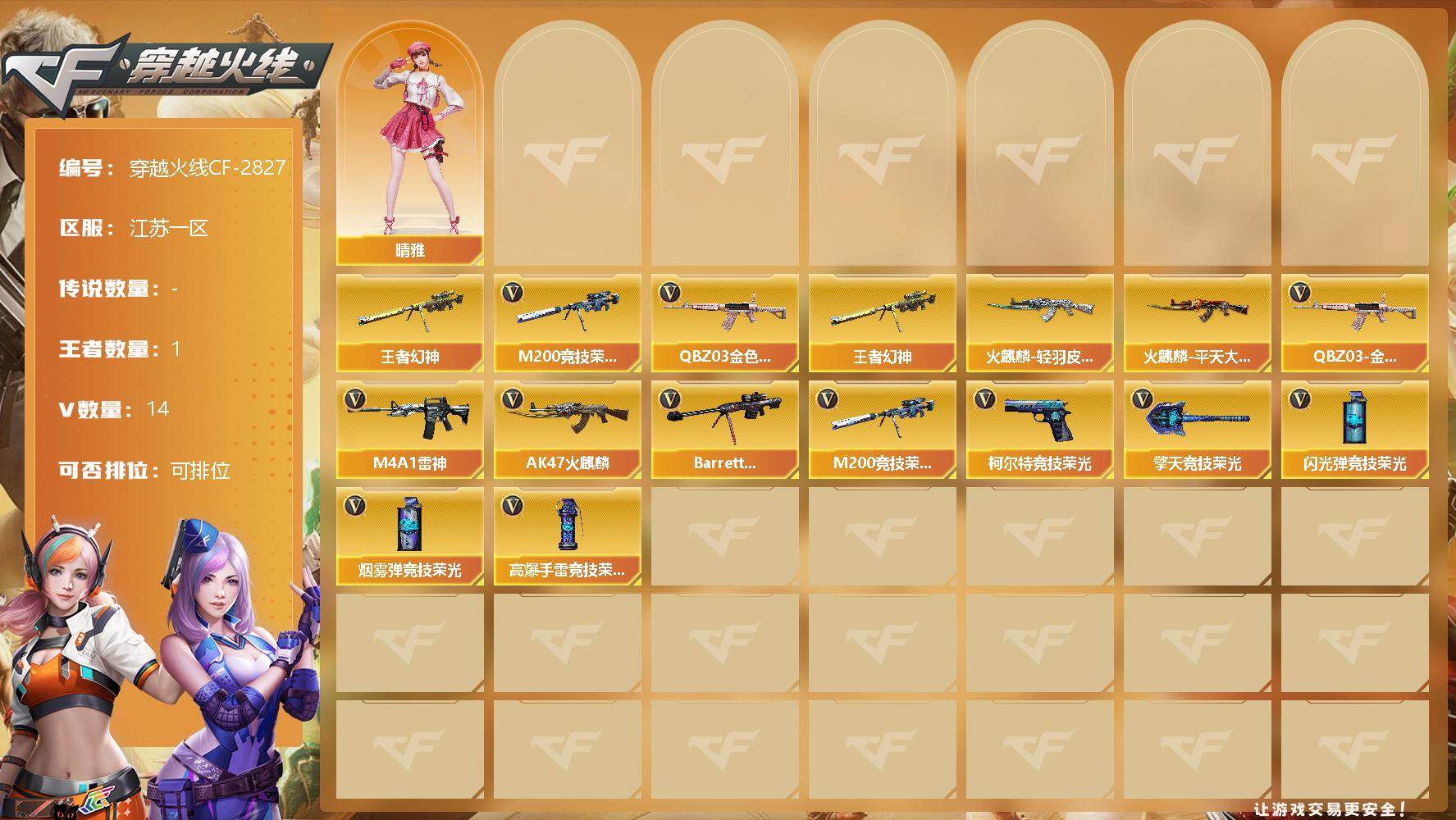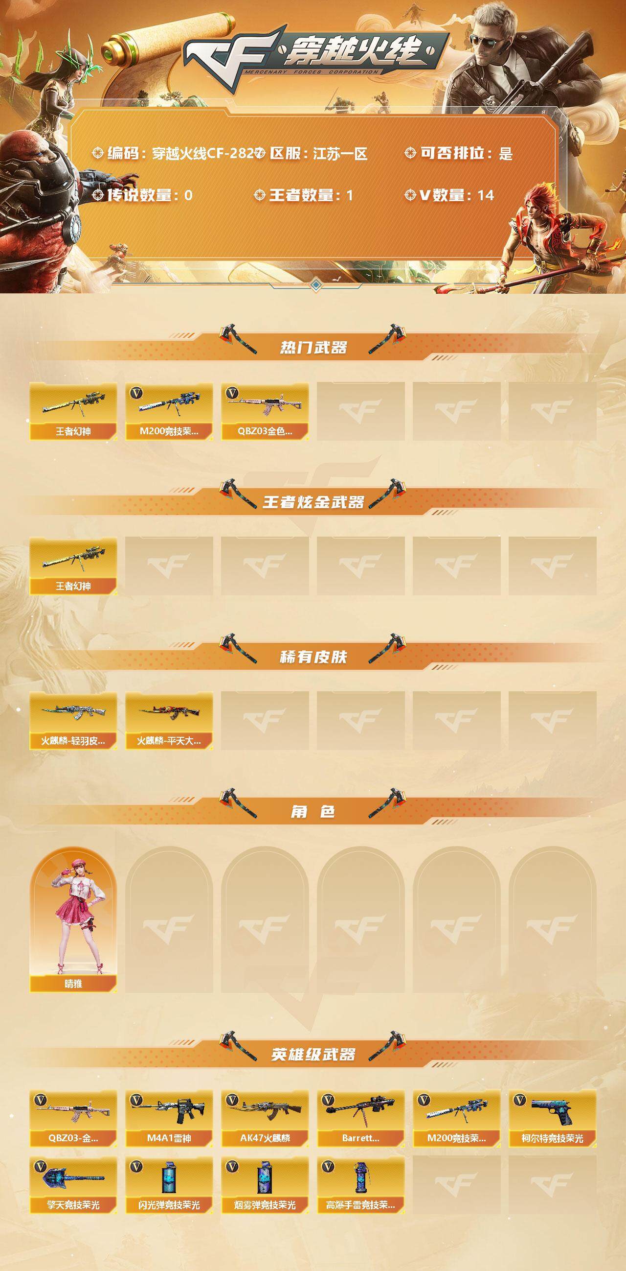 [12521375]【商品标题】:江苏一区-14V-1王者-0炫金 【热门武器】:王者幻神,QBZ03-金色蔷薇,M200-竞技荣光 【王者炫金武器】:王者幻神 【稀有皮肤】:火麒麟-轻羽皮肤,火麒麟-平天大圣 【角色】:晴雅 【英雄级武器】:M200-竞技荣光,柯尔特-竞技荣光,擎天-竞技荣光,高爆手雷-竞技荣光,烟雾弹-竞技荣光*3,闪光弹-竞技荣光,QBZ03-金色蔷薇,M4A1-雷神,AK47-火麒麟,Barrett-毁灭 【特殊枪械】: