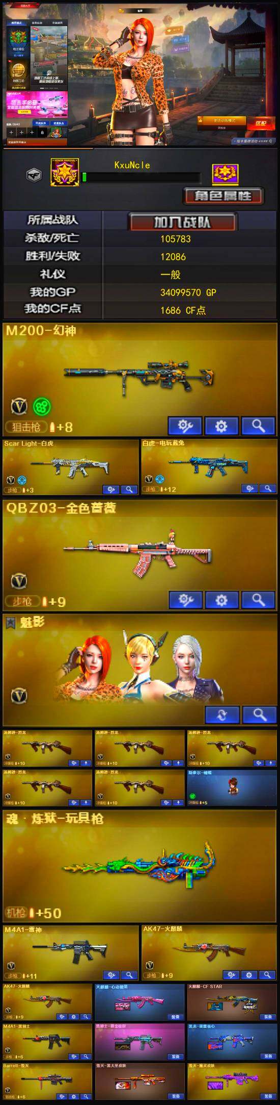 【英雄级武器】:柯尔特-电竞装甲,M4A1-武圣,Glock18-武圣,QBZ03-金色蔷薇,Scar Light-白虎,白虎-电玩蓝兔,无影-神兵利器,M4A1-雷神,M4A1-黑骑士,M4A1-死神,汤姆逊-烈龙*5,AK47-火麒麟*2,AWM-天龙,Barrett-毁灭,Barrett-极光,AA-12-雷霆*2,M200-幻神,AK-47-猩红传说*6
