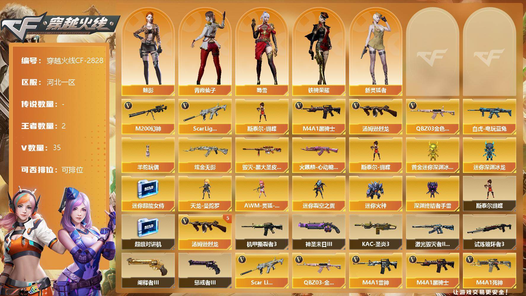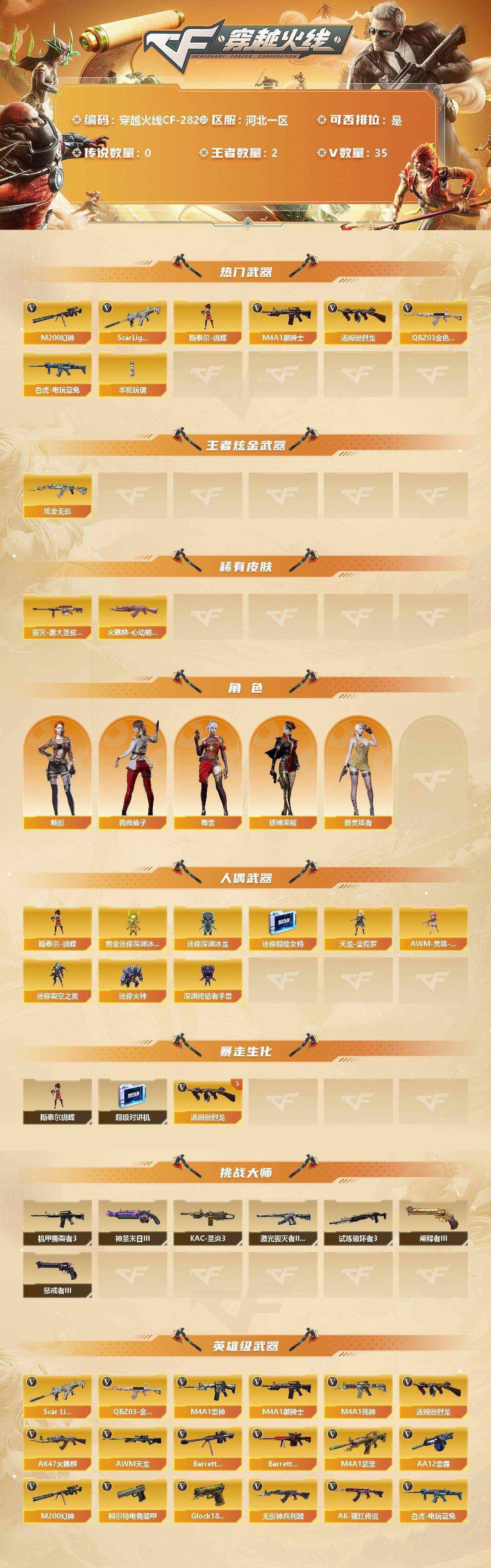 [12521961]【商品标题】:河北一区-35V-2王者-1炫金 【热门武器】:QBZ03-金色蔷薇,Scar Light-白虎,M200-幻神,白虎-电玩蓝兔,M4A1-黑骑士,汤姆逊-烈龙*5,斯泰尔-蝴蝶,羊驼玩偶 【王者炫金武器】:炫金无影 【稀有皮肤】:火麒麟-心动糖果,毁灭-黑大圣皮肤 【角色】:魅影,蜀雪,新灵狐者,铁骑荣耀,青霞仙子 【人偶武器】:斯泰尔-蝴蝶,天龙-曼陀罗,AWM-灵狐-15周年嘉年华,黄金迷你深渊冰龙,迷你深渊冰龙,迷你超能女侍,迷你裂空之翼*2,迷你火种,深渊终结者手雷 【暴走生化】:斯泰尔-蝴蝶,超级对讲机 【挑战大师】:机甲撕裂者III,神圣爆裂者-末日III,KAC-圣炎切割者III,阐释者III,惩戒者III,试炼破坏者III,激光毁灭者III-白马银枪 【英雄级武器】:柯尔特-电竞装甲,M4A1-武圣,Glock18-武圣,QBZ03-金色蔷薇,Scar Light-白虎,白虎-电玩蓝兔,无影-神兵利器,M4A1-雷神,M4A1-黑骑士,M4A1-死神,汤姆逊-烈龙*5,AK47-火麒麟*2,AWM-天龙,Barrett-毁灭,Barrett-极光,AA-12-雷霆*2,M200-幻神,AK-47-猩红传说*6 【特殊枪械】:蝴蝶斯泰尔+5烈龙,1白虎,1黑骑士,5烈龙,1蝴蝶斯泰尔