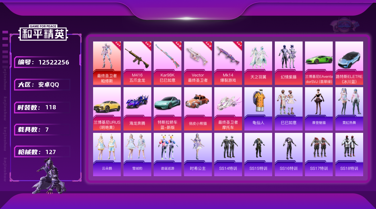 [12522256]老木乃伊/素材身法号/地铁满天赋【特价急出/详情看图】:安卓 手Q-1神装-3粉装-4特效枪-7载具-3粉色飞行器-4.8w热力值-5王牌印记-118套装-127枪皮【红色神装等级】:最终圣卫者-帕修斯(一级)【热门品类】:粉装-梦幻火箭,套装-冥河战士,套装-龟仙人,套装-浪漫波比【粉色载具】:特斯拉Roadster(水滴蓝),兰博基尼Aventador SVJ(翡翠绿),兰博基尼URUS(明艳黄),路特斯ELETRE(冰川蓝),海龙奔腾,俏皮小熊猫,最终圣卫者摩托车【粉色套装】:粉装-梦幻火箭,粉装-幻情紫藤,粉装-天之羽翼【粉色枪皮等级】:M416-五爪金龙(七级),Vector-最终圣卫者(三级),Kar98K-巳巳如意(五级),Mk14-爆裂游戏(一级)【粉色飞行器】:绿意幻情飞行器,天之羽翼飞行器,终晖之翼飞行器