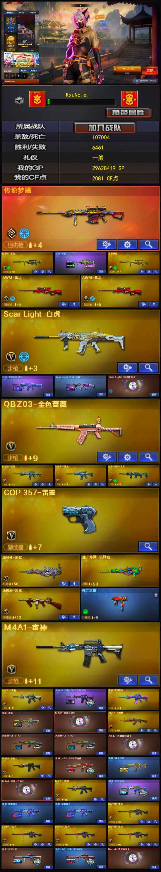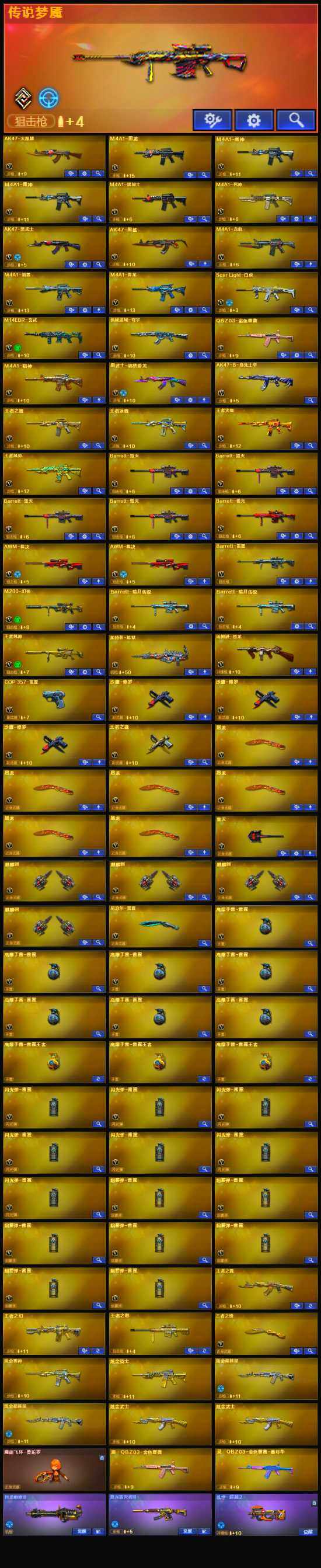【英雄级武器】:M4A1-雷霆,QBZ03-金色蔷薇,M14EBR-玄武,Scar Light-白虎,M4A1-青龙,M4A1-雷神*2,M4A1-黑龙,M4A1-黑骑士,M4A1-死神,加特林-炼狱,汤姆逊-烈龙,AK47-火麒麟,AK47-黑武士,Barrett-毁灭*4,Barrett-极光,AWM-裁决*2,M4A1-龙血,M200-幻神,AK47-黑鲨,M4A1-猎神,黑武士-锦绣游龙,AK-47-猩红传说,沙鹰-修罗*3,麒麟刺*4,擎天,屠龙*6