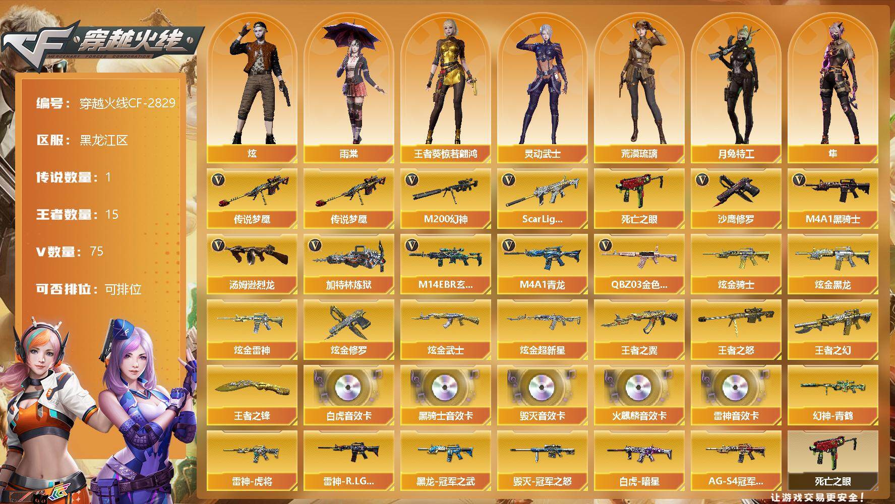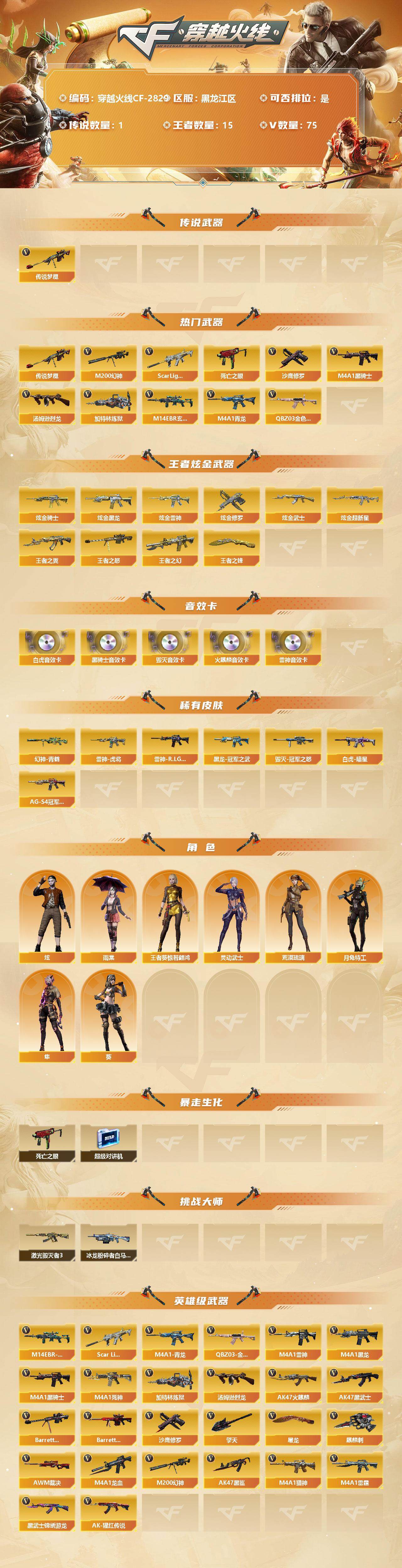 [12522133]【商品标题】:黑龙江区-75V-15王者-8炫金 【传说武器】:传说梦魇 【热门武器】:传说梦魇,QBZ03-金色蔷薇,M14EBR-玄武,Scar Light-白虎,M4A1-青龙,M200-幻神,死亡之眼,M4A1-黑骑士,汤姆逊-烈龙,加特林-炼狱,沙鹰-修罗*3 【王者炫金武器】:炫金骑士,炫金黑龙,炫金雷神,炫金修罗,炫金武士*2,炫金超新星*2,王者之幻,王者之翼,王者之怒,王者之锋 【音效卡】:AK47-火麒麟音效卡,M4A1-雷神音效卡,M4A1-黑骑士音效卡,Barrett-毁灭音效卡,Scar Light-白虎音效卡 【稀有皮肤】:幻神-青鹤,Scar Light-白虎-暗星,雷神-虎将,雷神-R.LGD-CFPLS18冠军,黑骑士-AG-S4冠军典藏,黑龙-冠军之武,毁灭-冠军之怒 【角色】:王者葵-惊若翩鸿,葵,炫,雨棠,月兔特工,荒漠琉璃,隼,灵动武士 【暴走生化】:死亡之眼,超级对讲机 【挑战大师】:激光毁灭者III,冰龙粉碎者-白马银枪 【英雄级武器】:M4A1-雷霆,QBZ03-金色蔷薇,M14EBR-玄武,Scar Light-白虎,M4A1-青龙,M4A1-雷神*2,M4A1-黑龙,M4A1-黑骑士,M4A1-死神,加特林-炼狱,汤姆逊-烈龙,AK47-火麒麟,AK47-黑武士,Barrett-毁灭*4,Barrett-极光,AWM-裁决*2,M4A1-龙血,M200-幻神,AK47-黑鲨,M4A1-猎神,黑武士-锦绣游龙,AK-47-猩红传说,沙鹰-修罗*3,麒麟刺*4,擎天,屠龙*6 【特殊枪械】:1白虎,1黑骑士,1烈龙,1炼狱