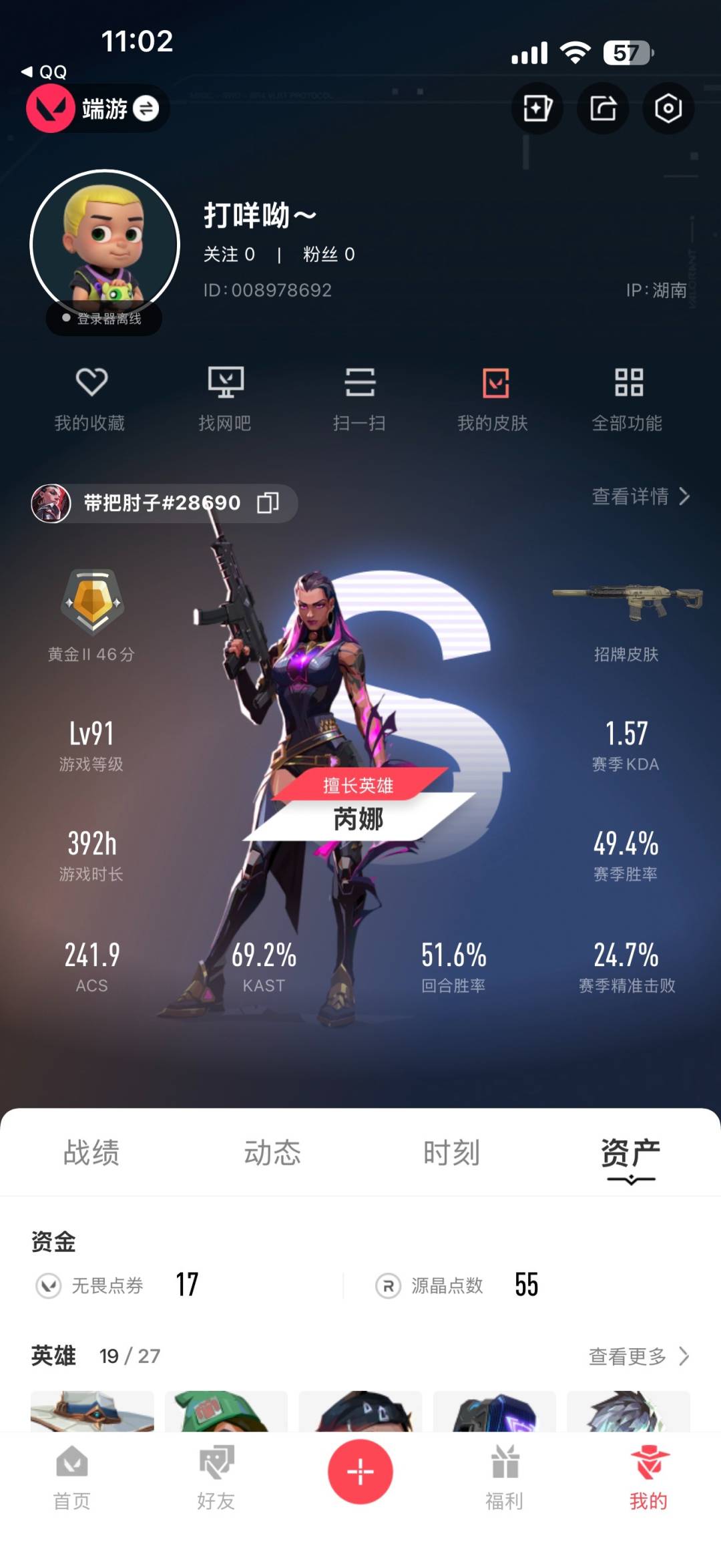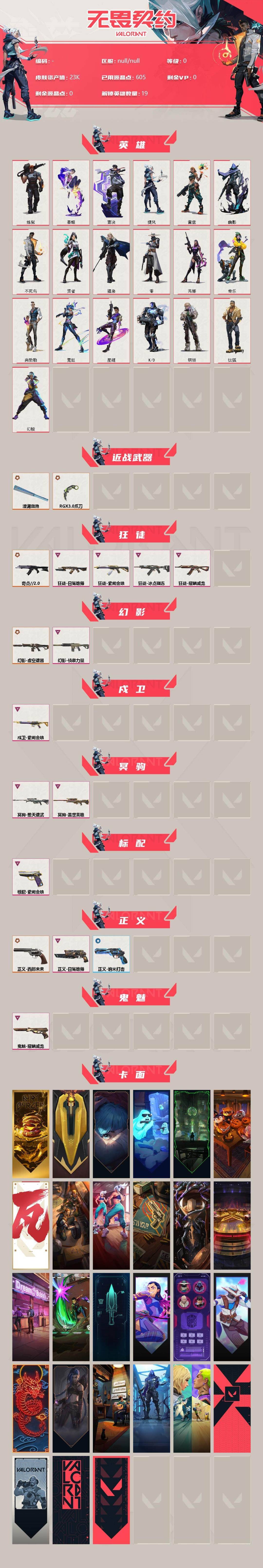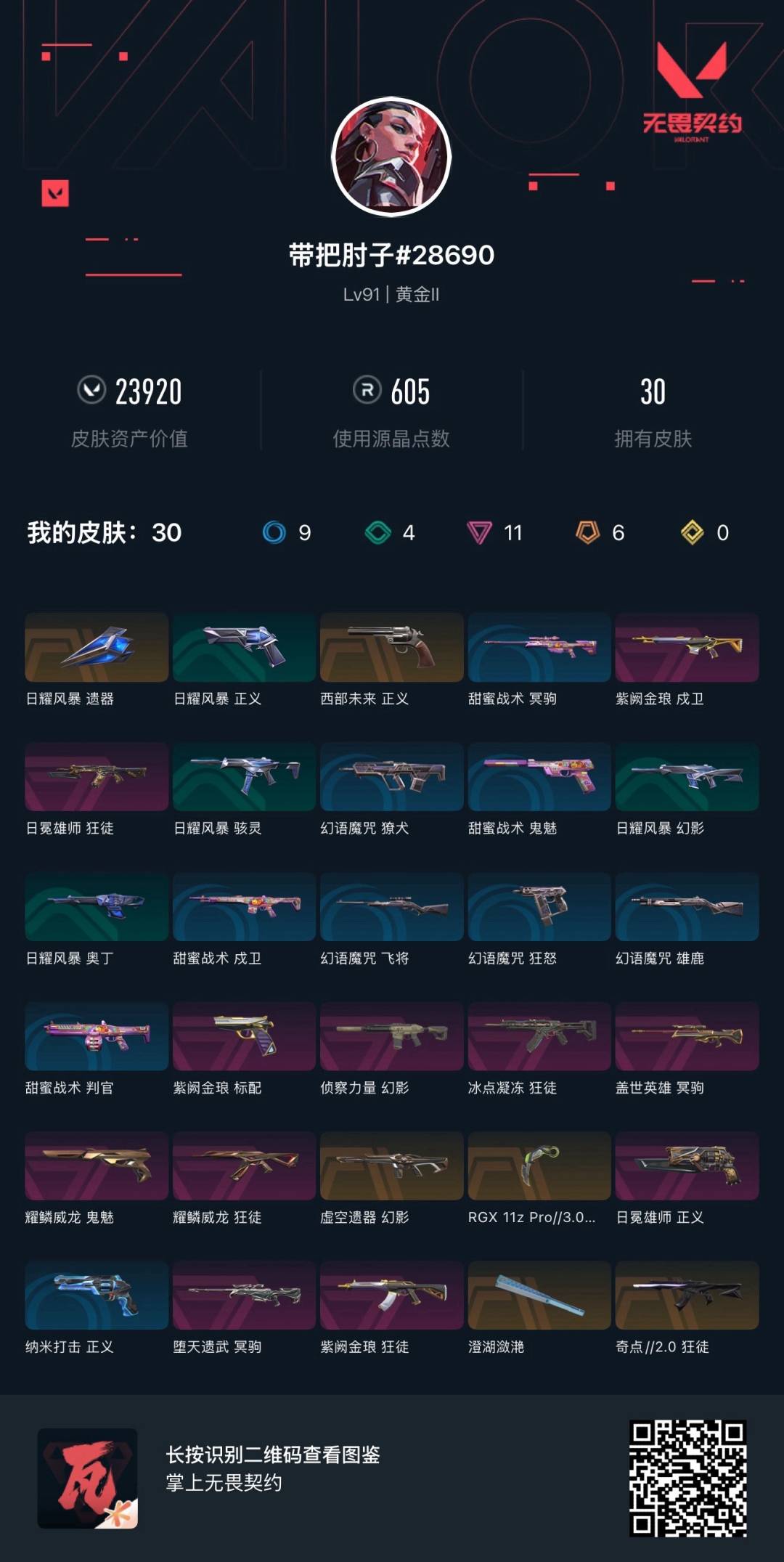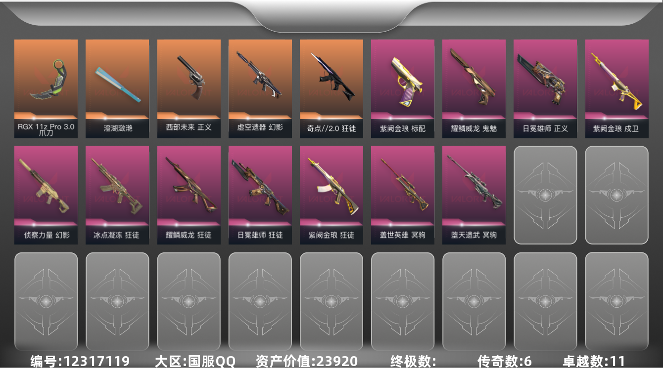 [12317119]6橙皮 11紫皮 30皮肤 19英雄 69卡面 605已用源晶 黄金 优质装备:狂徒-紫阙金琅,幻影-侦察力量,冥驹-堕天遗武,正义-日冕雄师,狂徒-日冕雄师,狂徒-奇点//2.0,标配-紫阙金琅,澄湖潋滟,狂徒-冰点凝冻,狂徒-耀鳞威龙,爪刀-RGX 11z Pro 3.0,戍卫-紫阙金琅,鬼魅-耀鳞威龙 佩枪皮肤:正义-西部未来 步枪皮肤:幻影-虚空遗器 狙击枪皮肤:冥驹-盖世英雄