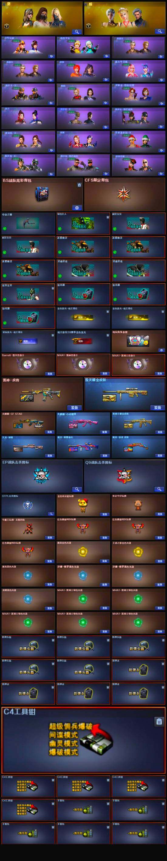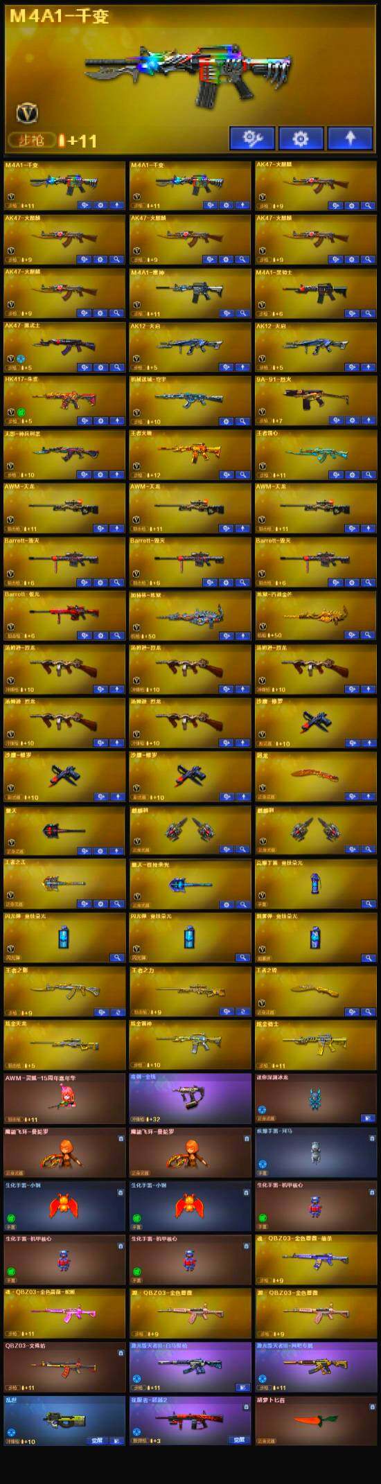 【英雄级武器】:擎天-竞技荣光,高爆手雷-竞技荣光,烟雾弹-竞技荣光,闪光弹-竞技荣光*2,HK417-朱雀,无影-神兵利器,M4A1-雷神,M4A1-黑骑士,加特林-炼狱,汤姆逊-烈龙*5,AK47-火麒麟*5,AK47-黑武士,AK12-天启*2,AWM-天龙*3,Barrett-毁灭*3,Barrett-极光,M4A1-千变*3,沙鹰-修罗*3,麒麟刺*2,擎天,屠龙