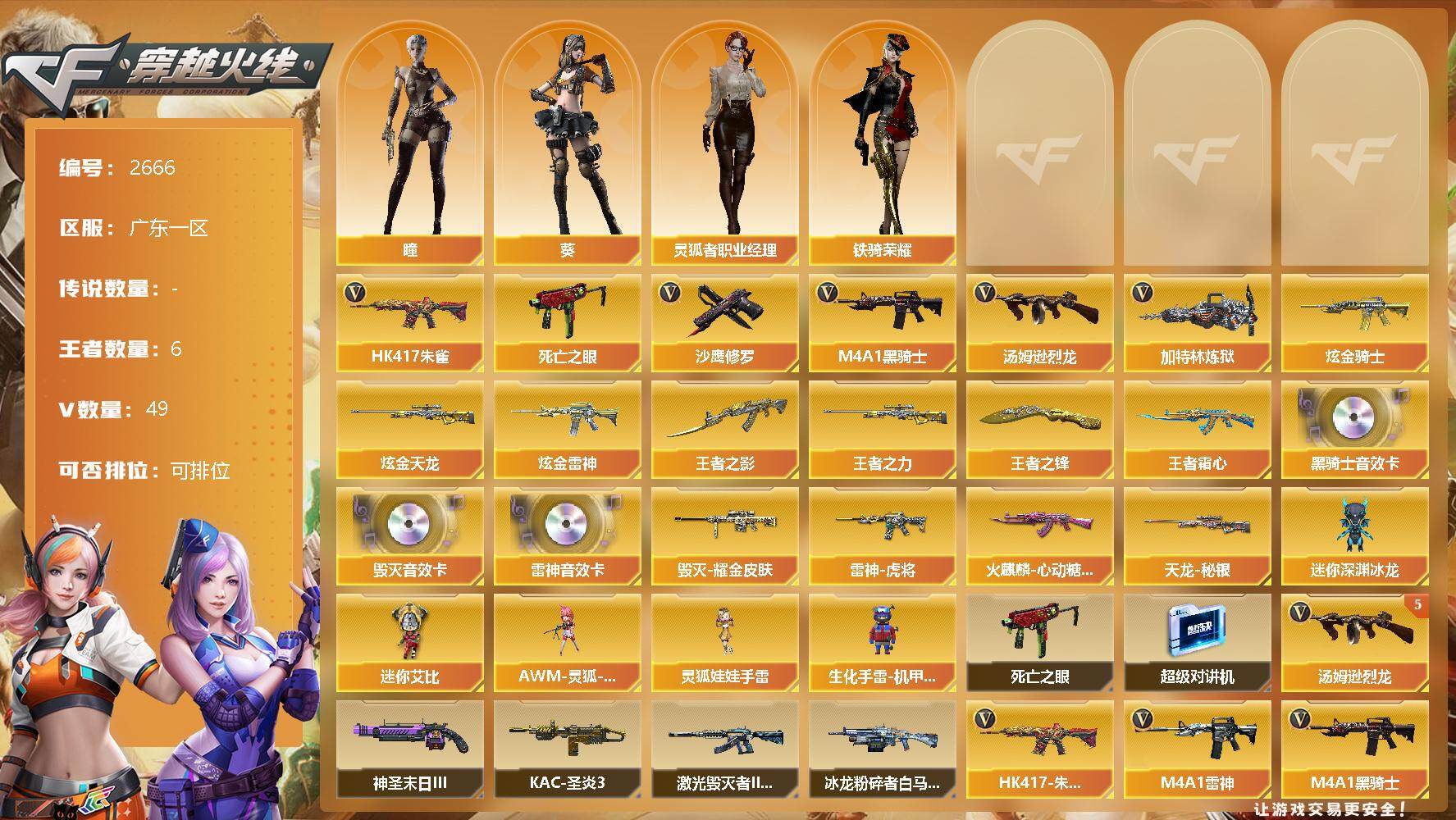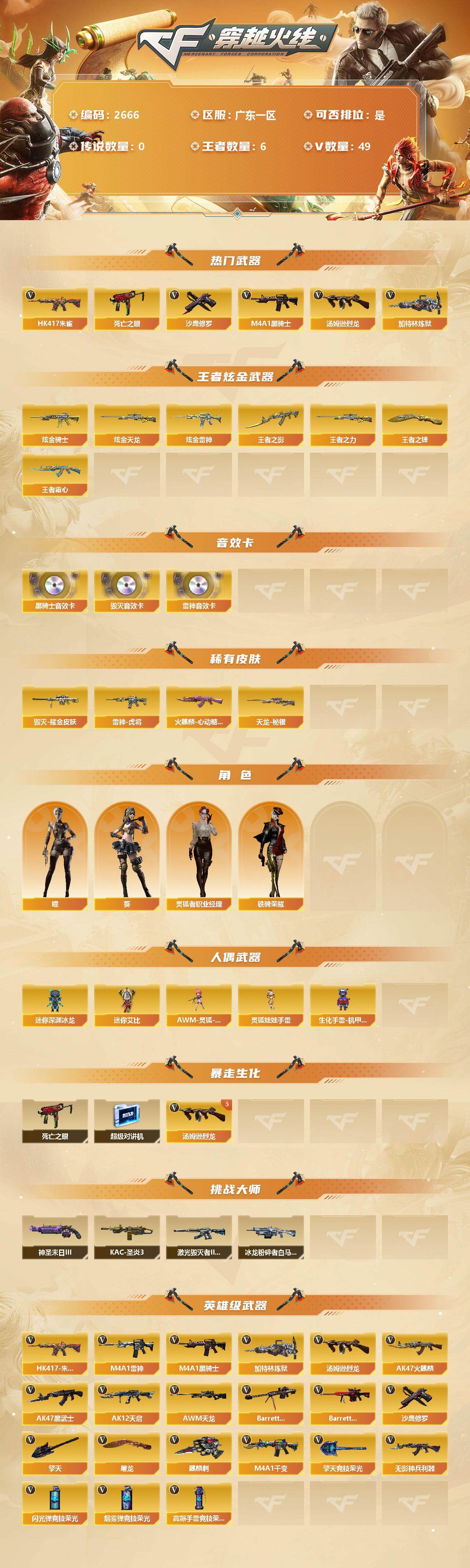 [12522417]【商品标题】:广东一区-49V-6王者-3炫金 【热门武器】:HK417-朱雀,死亡之眼,M4A1-黑骑士,汤姆逊-烈龙*5,加特林-炼狱,沙鹰-修罗*3 【王者炫金武器】:炫金骑士,炫金天龙,炫金雷神,王者之影,王者之力,王者霜心,王者之锋 【音效卡】:M4A1-雷神音效卡,M4A1-黑骑士音效卡,Barrett-毁灭音效卡 【稀有皮肤】:雷神-虎将,火麒麟-心动糖果,毁灭耀金皮肤,天龙-秘银 【角色】:灵狐者-职业经理,葵,瞳,铁骑荣耀 【人偶武器】:AWM-灵狐-15周年嘉年华,迷你深渊冰龙,迷你艾比,灵狐娃娃手雷*5,生化手雷-机甲核心*3 【暴走生化】:死亡之眼,超级对讲机 【挑战大师】:神圣爆裂者-末日III,KAC-圣炎切割者III,激光毁灭者III-白马银枪,冰龙粉碎者-白马银枪 【英雄级武器】:擎天-竞技荣光,高爆手雷-竞技荣光,烟雾弹-竞技荣光,闪光弹-竞技荣光*2,HK417-朱雀,无影-神兵利器,M4A1-雷神,M4A1-黑骑士,加特林-炼狱,汤姆逊-烈龙*5,AK47-火麒麟*5,AK47-黑武士,AK12-天启*2,AWM-天龙*3,Barrett-毁灭*3,Barrett-极光,M4A1-千变*3,沙鹰-修罗*3,麒麟刺*2,擎天,屠龙 【特殊枪械】:1黑骑士,5烈龙,1炼狱