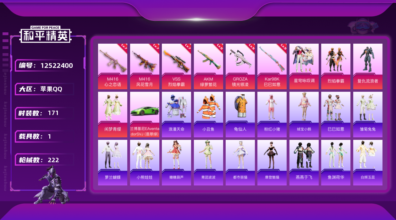 [12522400]地铁满天赋【特价急出/详情看图】:苹果 手Q-4粉装-6特效枪-1载具-7w热力值-15王牌印记-171套装-222枪皮【热门品类】:套装-浪漫天命,套装-都市猎人,套装-深海小丑鱼,套装-小丑鱼,套装-奇异狩猎者,套装-龟仙人,套装-粉红小猪【粉色载具】:兰博基尼Aventador SVJ(翡翠绿)【粉色套装】:粉装-烈焰拳霸,角色-复仇流浪者,粉装-闲梦青缨,粉装-星穹咏叹调【粉色枪皮等级】:AKM-绿萝繁花(五级),M416-心之恋语(七级),M416-风花雪月(七级),GROZA-镜光银凌(五级),Kar98K-巳巳如意(五级),VSS-烈焰拳霸(七级)