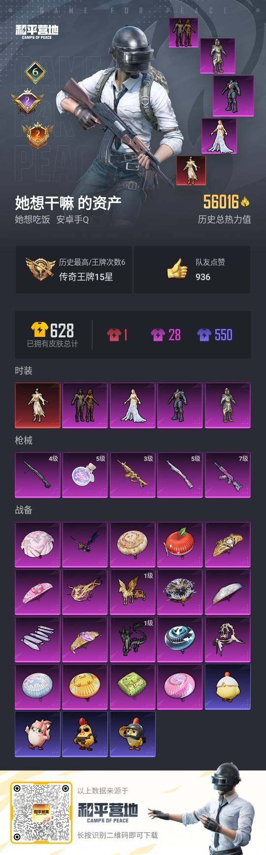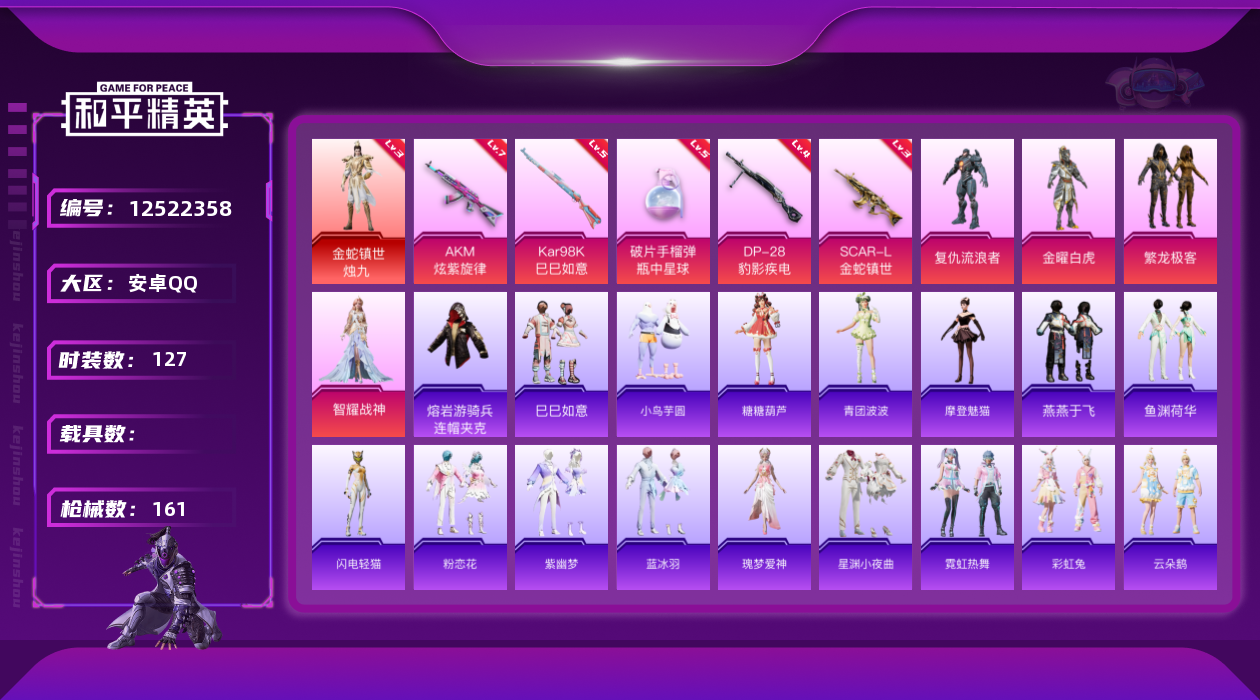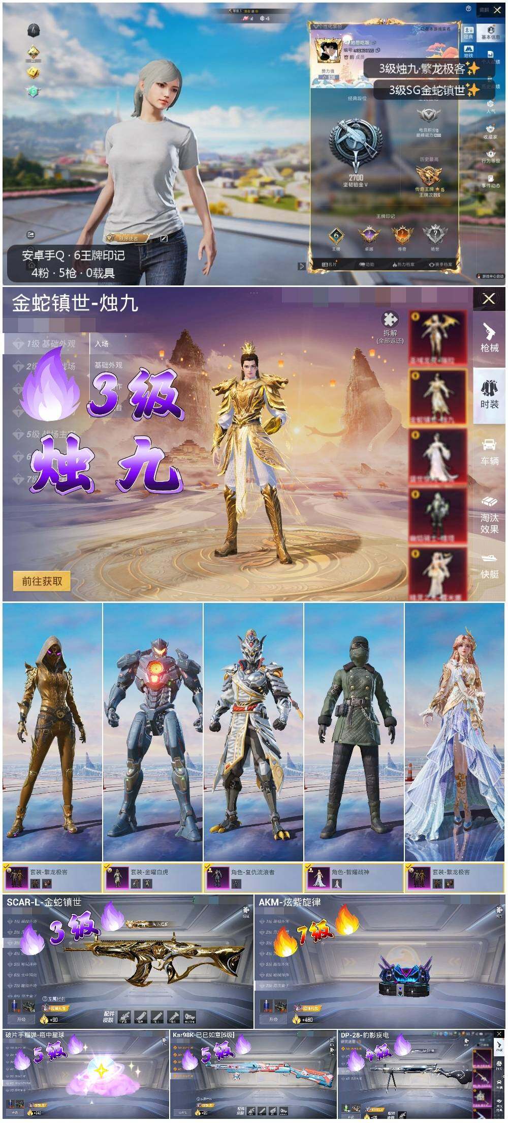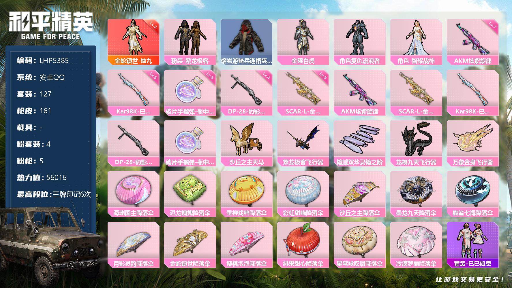 [12522358]素材身法号【特价急出/详情看图】:安卓 手Q-1神装-4粉装-5特效枪-6粉色飞行器-5.6w热力值-6王牌印记-127套装-161枪皮【红色神装等级】:金蛇镇世-烛九(三级)【热门品类】:粉装-繁龙极客,熔岩游骑兵连帽夹克【粉色套装】:粉装-金曜白虎,角色-复仇流浪者,粉装-繁龙极客,角色-智耀战神【粉色枪皮等级】:AKM-炫紫旋律(七级),SCAR-L-金蛇镇世(三级),Kar98K-巳巳如意(五级),DP-28-豹影疾电(四级),破片手榴弹-瓶中星球(五级)【粉色飞行器】:沙丘之主天马,繁龙极客飞行器,镜域双华-灵镜之阶,龙翔九天飞行器,万象金身飞行器