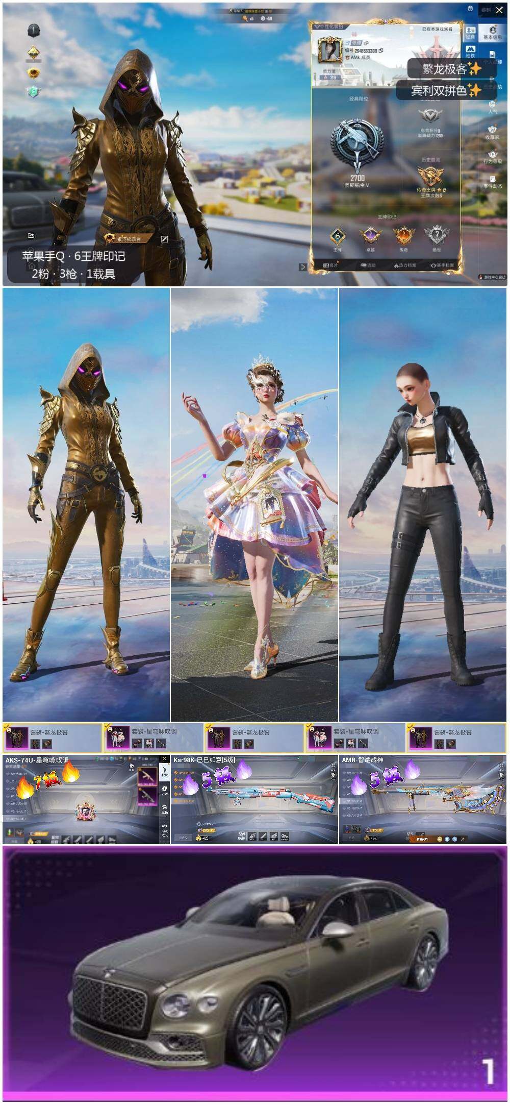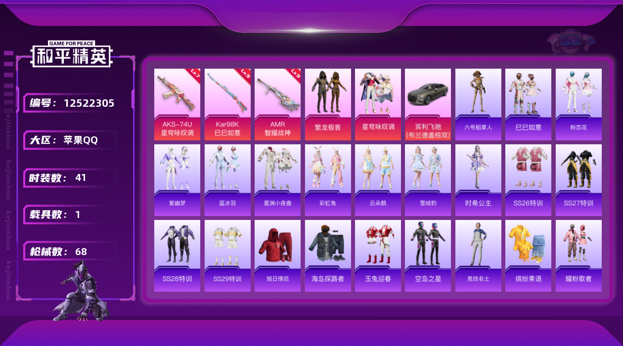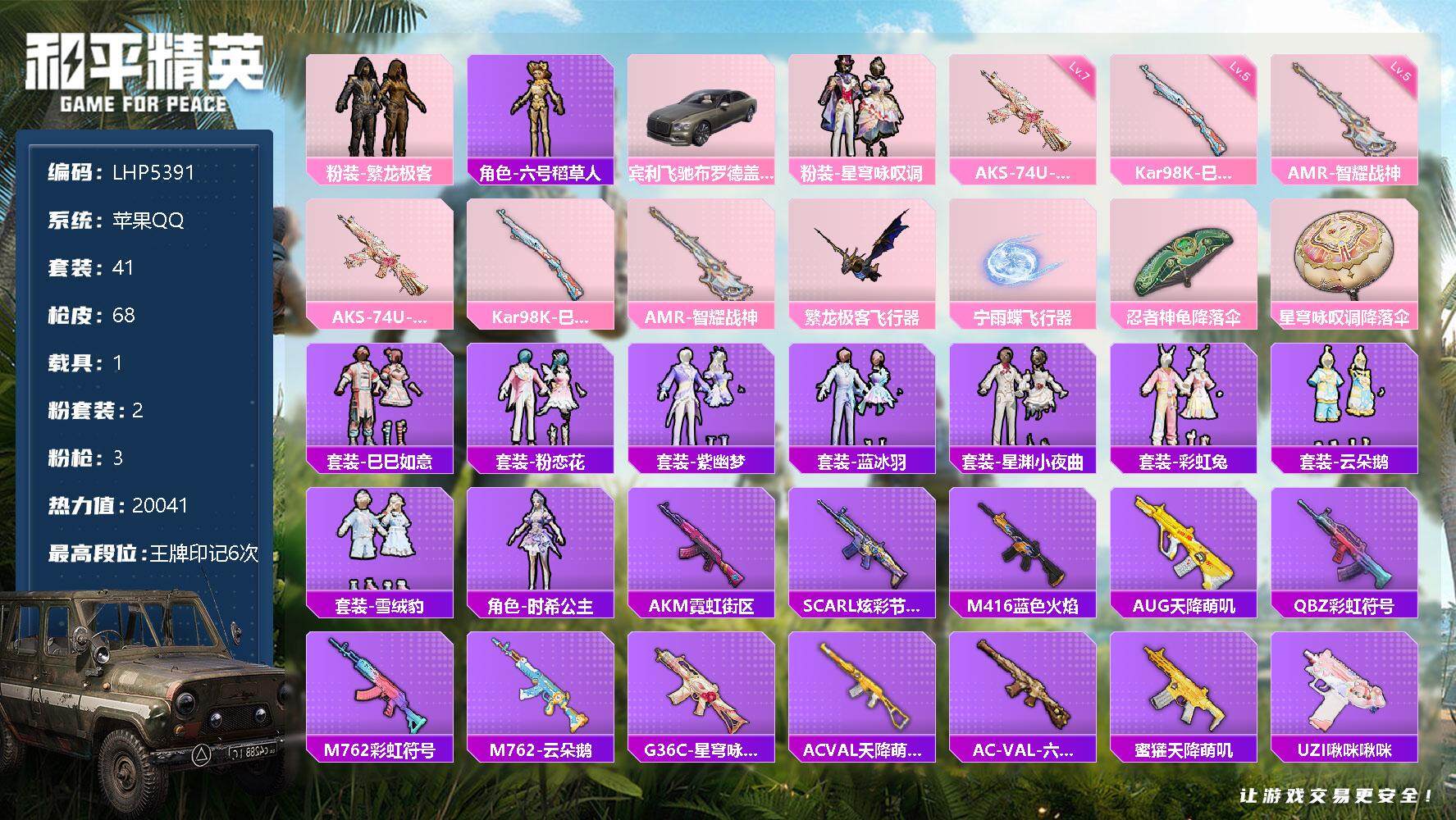 [12522305]【特价急出/详情看图】:苹果 手Q-2粉装-3特效枪-1载具-2粉色飞行器-2w热力值-6王牌印记-41套装-68枪皮【热门品类】:粉装-繁龙极客,角色-六号稻草人【粉色载具】:宾利飞驰(布罗德盖棕双色)【粉色套装】:粉装-繁龙极客,粉装-星穹咏叹调【粉色枪皮等级】:AKS-74U-星穹咏叹调(七级),Kar98K-巳巳如意(五级),AMR-智耀战神(五级)【粉色飞行器】:繁龙极客飞行器,宁雨蝶飞行器