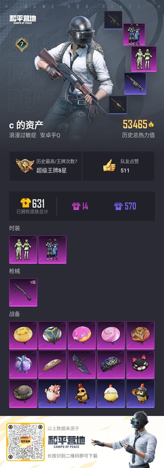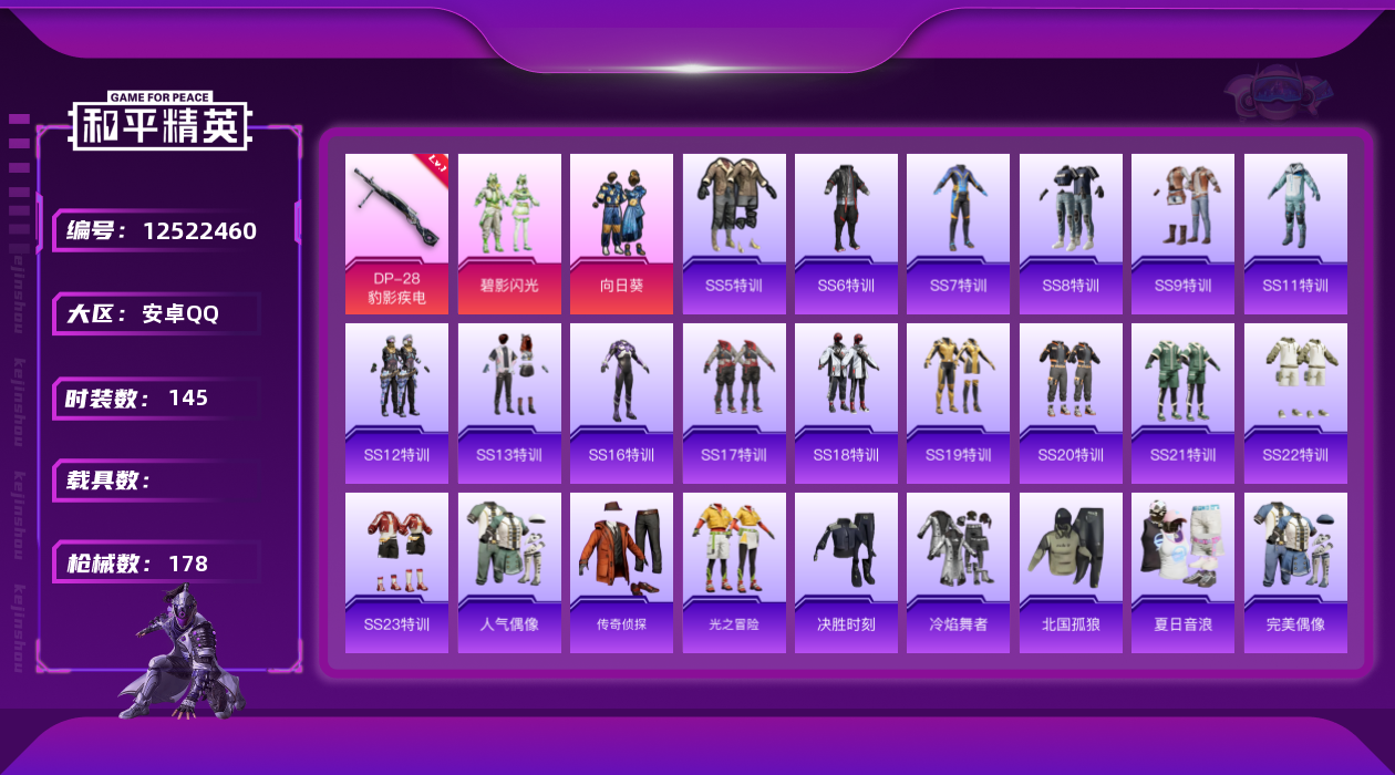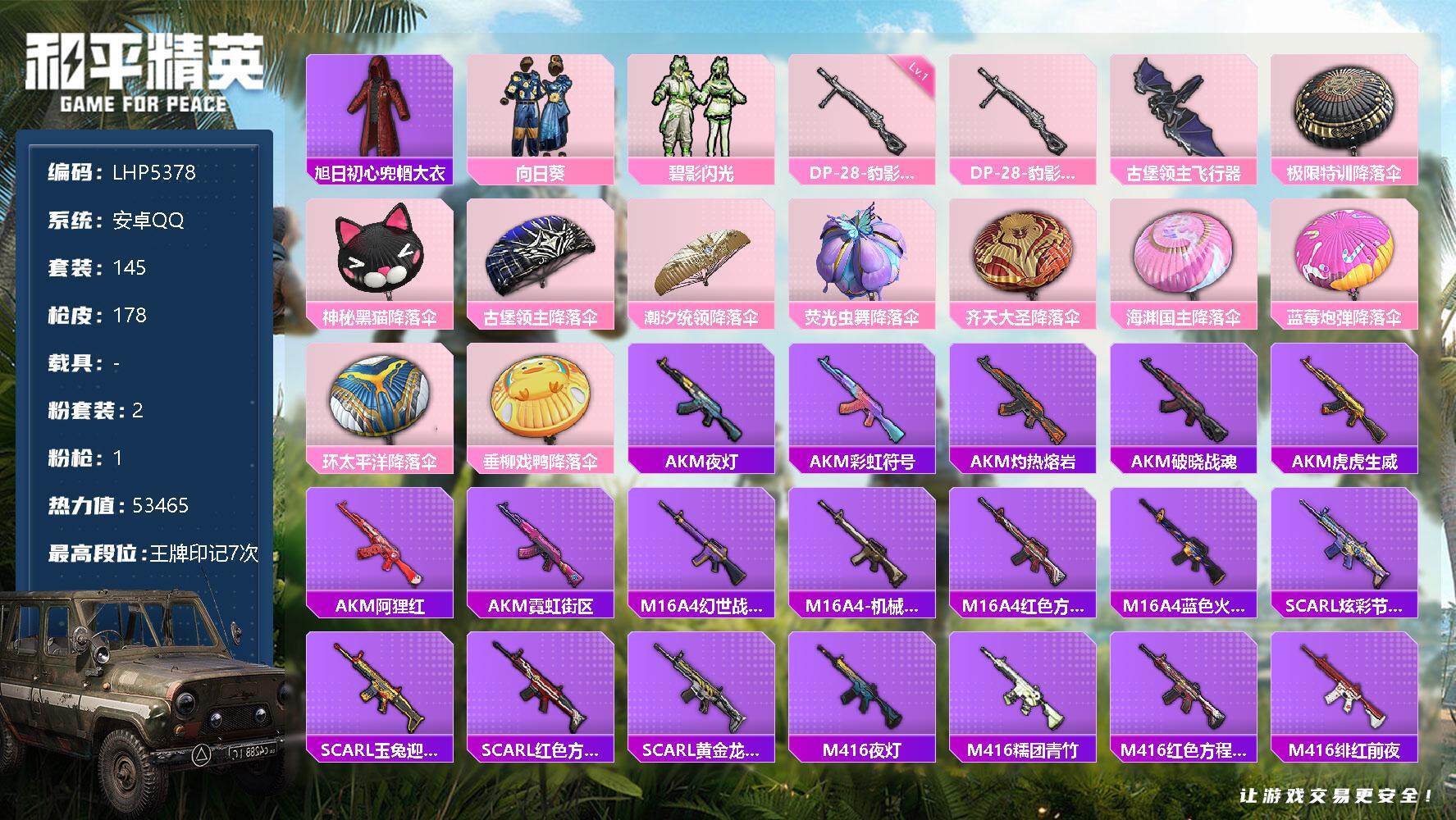 [12522460]【特价急出/详情看图】:安卓 手Q-2粉装-1特效枪-1粉色飞行器-5.3w热力值-7王牌印记-145套装-178枪皮【热门品类】:旭日初心兜帽大衣【粉色套装】:粉装-向日葵,粉装-碧影闪光【粉色枪皮等级】:DP-28-豹影疾电(一级)【粉色飞行器】:古堡领主飞行器