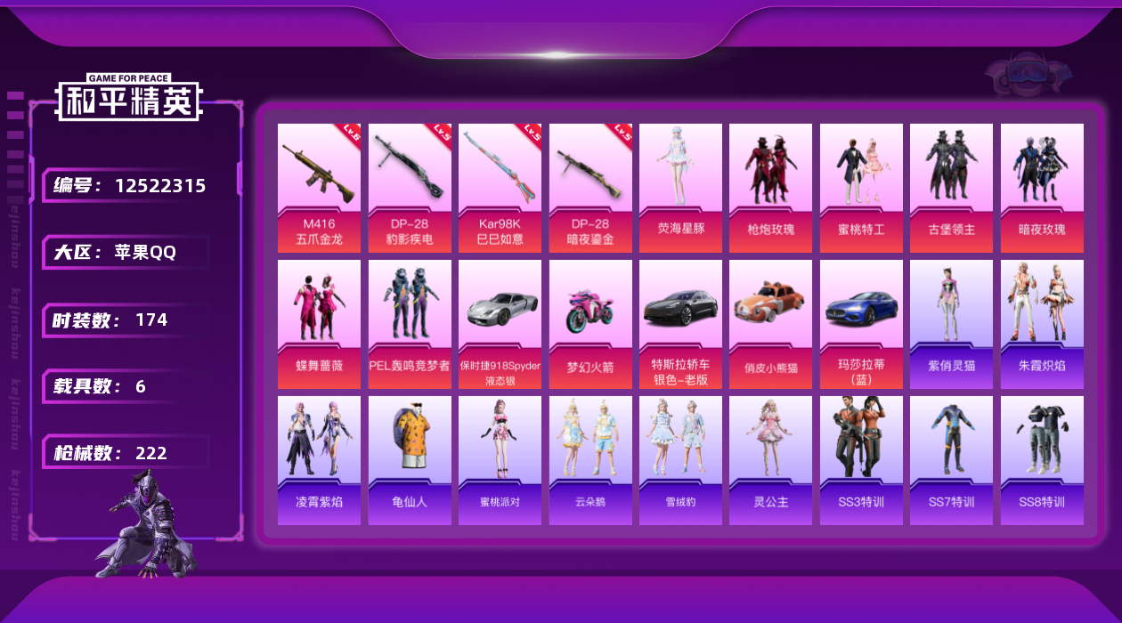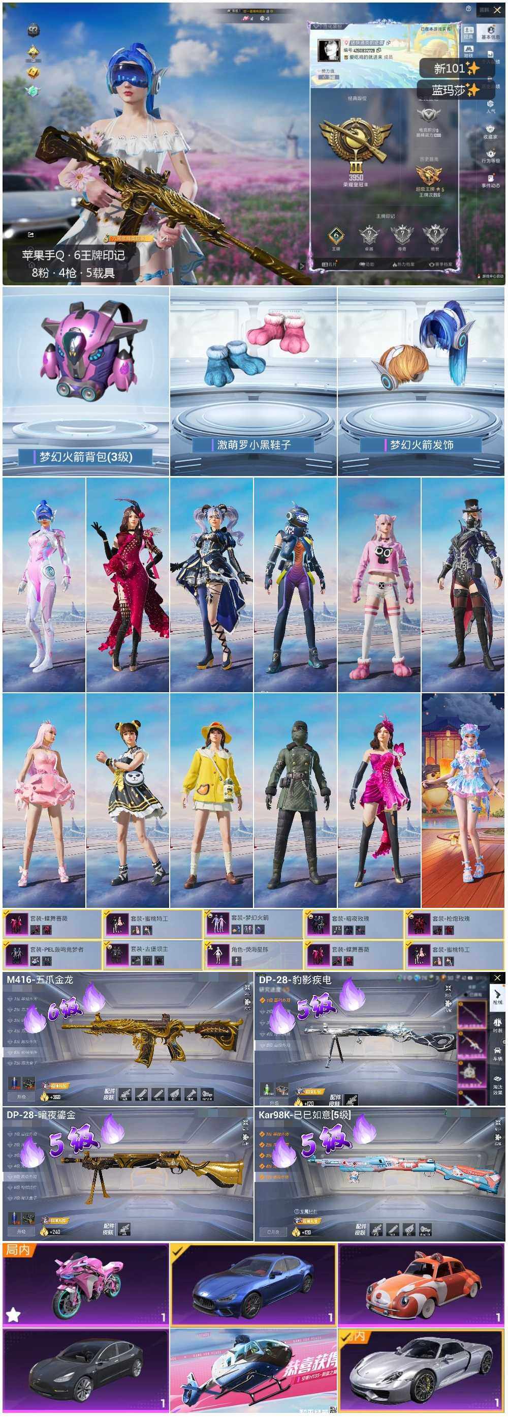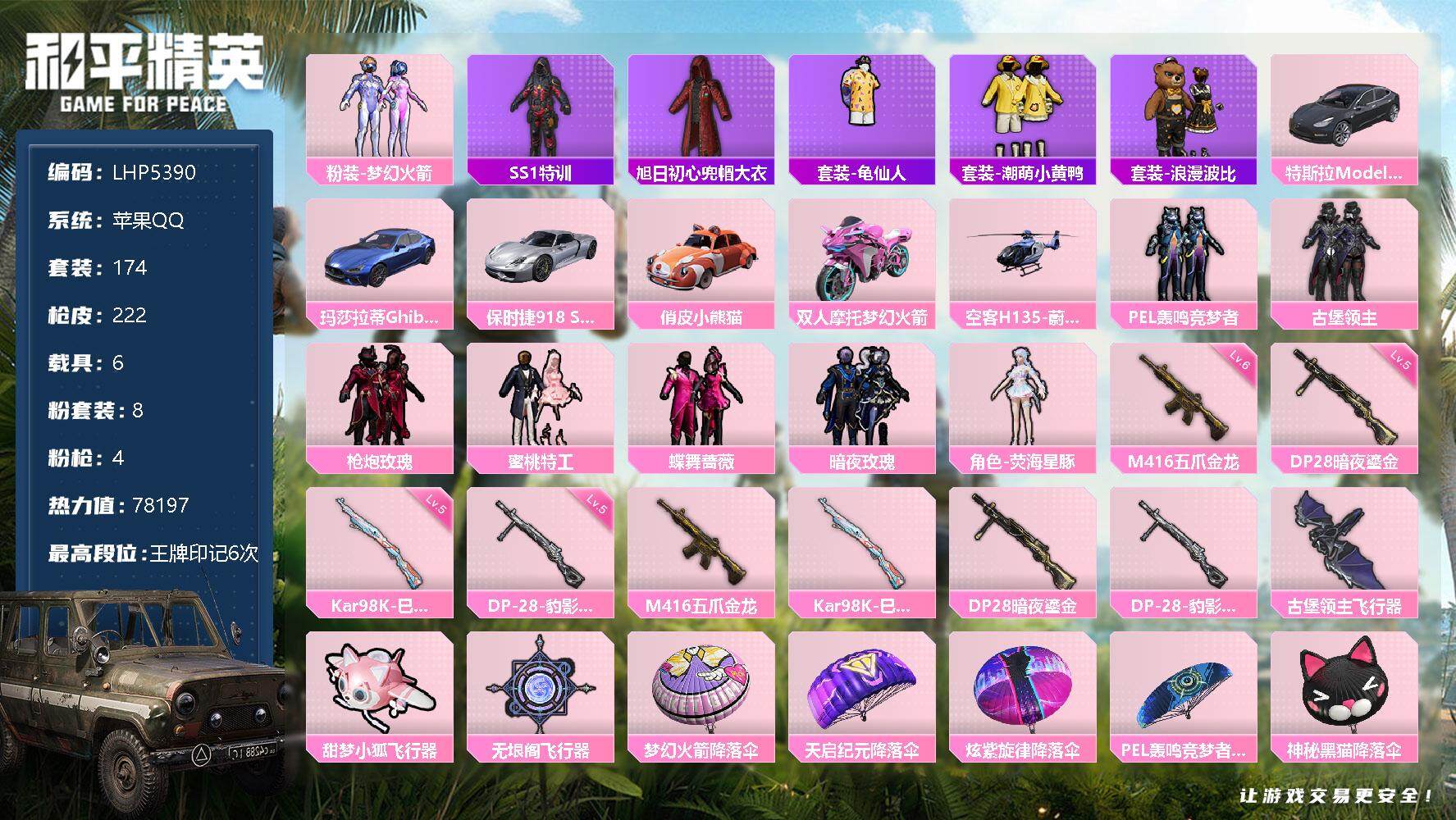 [12522315]素材身法号【特价急出/详情看图】:苹果 手Q-8粉装-4特效枪-6载具-3粉色飞行器-7.8w热力值-6王牌印记-174套装-222枪皮【热门品类】:粉装-梦幻火箭,套装-SS1特训,旭日初心兜帽大衣,套装-龟仙人,套装-潮萌小黄鸭,套装-浪漫波比【粉色载具】:特斯拉Model 3(冷光银),玛莎拉蒂Ghibli(蓝),保时捷918 Spyder(液态银),俏皮小熊猫,双人摩托-梦幻火箭,空客H135-蔚蓝之翼【粉色套装】:粉装-梦幻火箭,粉装-PEL轰鸣竞梦者,粉装-古堡领主,粉装-枪炮玫瑰,粉装-蜜桃特工,粉装-蝶舞蔷薇,粉装-暗夜玫瑰,角色-荧海星豚【粉色枪皮等级】:M416-五爪金龙(六级),Kar98K-巳巳如意(五级),DP-28-暗夜鎏金(五级),DP-28-豹影疾电(五级)【粉色飞行器】:古堡领主飞行器,甜梦小狐飞行器,无垠阁飞行器