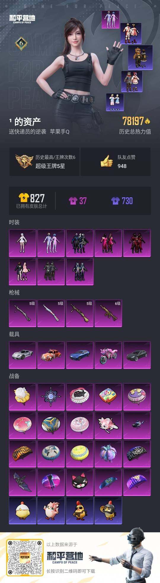 - [13290671]素材身法号/地铁满天赋 苹果 手Q-1神装-4粉装-7特效枪-3载具-4粉色飞行器-7.4w热力值-13王牌印记-139套装-230枪皮【红色神装等级】:灵猫魔法师-塞维尔(二级)【热门品类】:粉装-梦幻火箭,套装-浪漫天命,套装-小丑鱼,套装-龟仙人,套装-暗影哥特,角色-Mark.06【粉色载具】:玛莎拉蒂Ghibli(蓝),双人摩托-梦幻火箭,黑曜夜骑【粉色套装】:粉装-银河战甲,粉装-梦幻火箭,角色-洛天依,粉装-蓝莓炮弹【粉色枪皮等级】:AKM-星际浪客(六级),M416-电玩时刻(五级),AUG-星之彼岸(七级),UMP45-量子极限(五级),Vector-最终圣卫者(三级),Kar98K-巳巳如意(五级),DP-28-豹影疾电(五级)【粉色飞行器】:梦幻火箭飞行器,星际浪客飞行器,灵猫魔法师飞行器,灵珠游龙飞行器