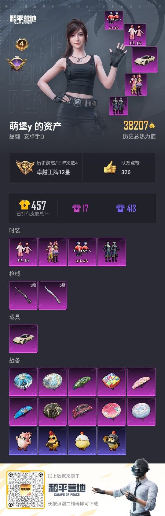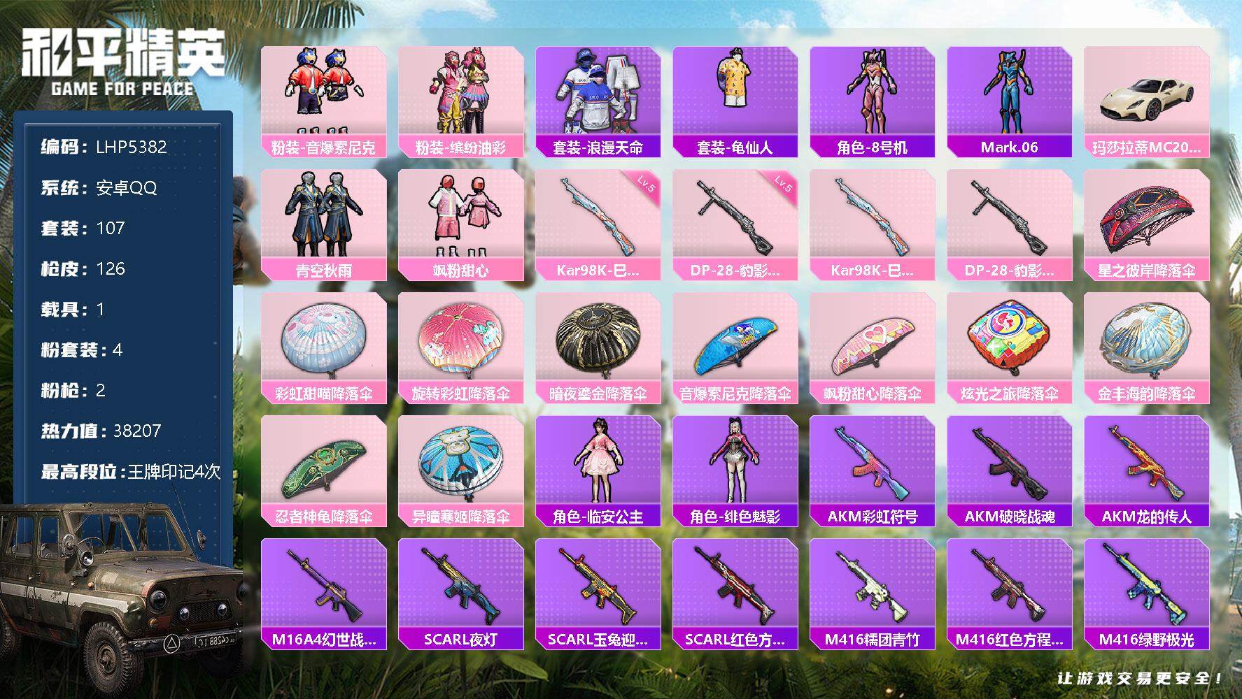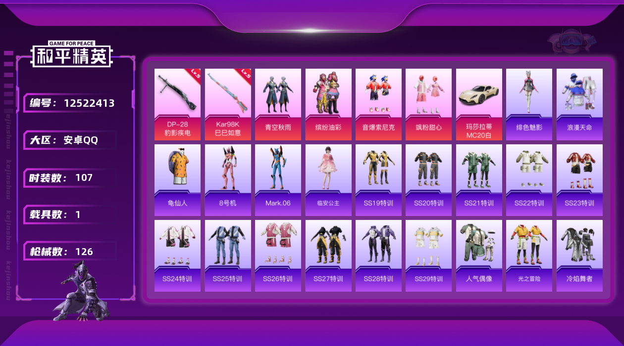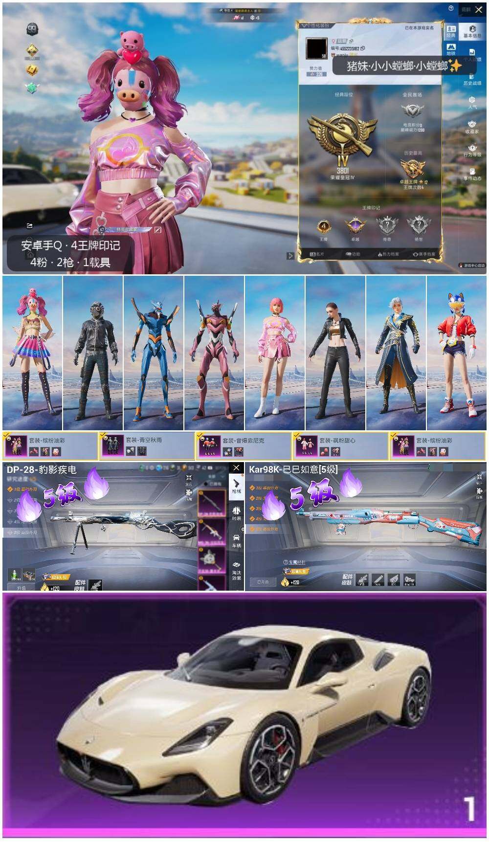 [12522413]【特价急出/详情看图】:安卓 手Q-4粉装-2特效枪-1载具-3.8w热力值-4王牌印记-107套装-126枪皮【热门品类】:粉装-音爆索尼克,粉装-缤纷油彩,套装-浪漫天命,套装-龟仙人,角色-8号机,角色-Mark.06【粉色载具】:玛莎拉蒂MC20(星石白)【粉色套装】:粉装-缤纷油彩,粉装-青空秋雨,粉装-音爆索尼克,粉装-飒粉甜心【粉色枪皮等级】:Kar98K-巳巳如意(五级),DP-28-豹影疾电(五级)