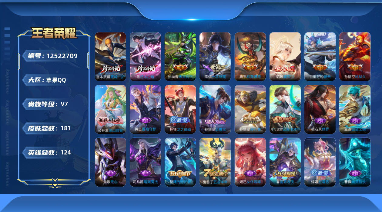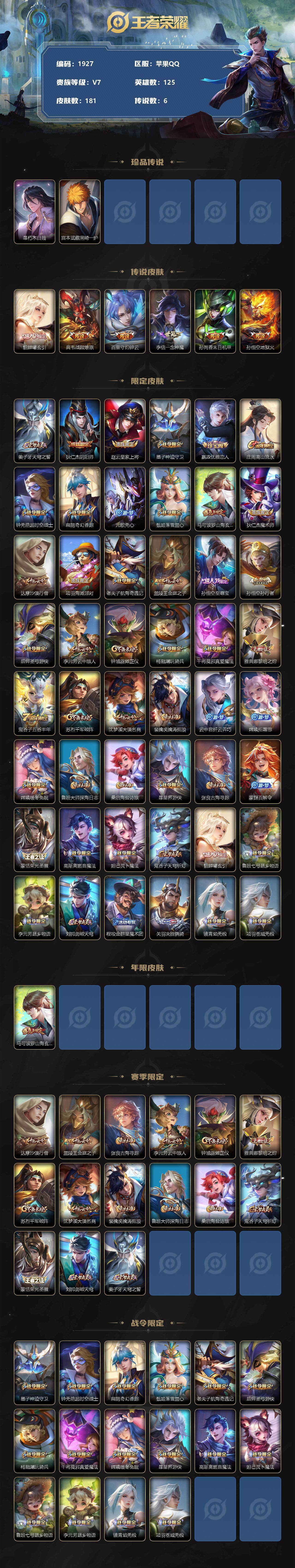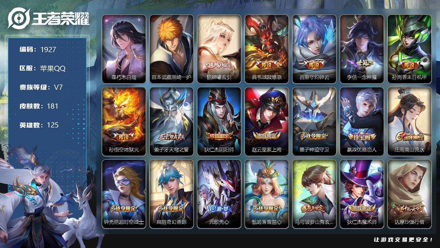 [12522709]【商品标题】:苹果Q-V7-最强王者段位-125英雄-181皮肤-0典藏-0珍品无双-0无双-2珍品传说-6传说-54史诗
