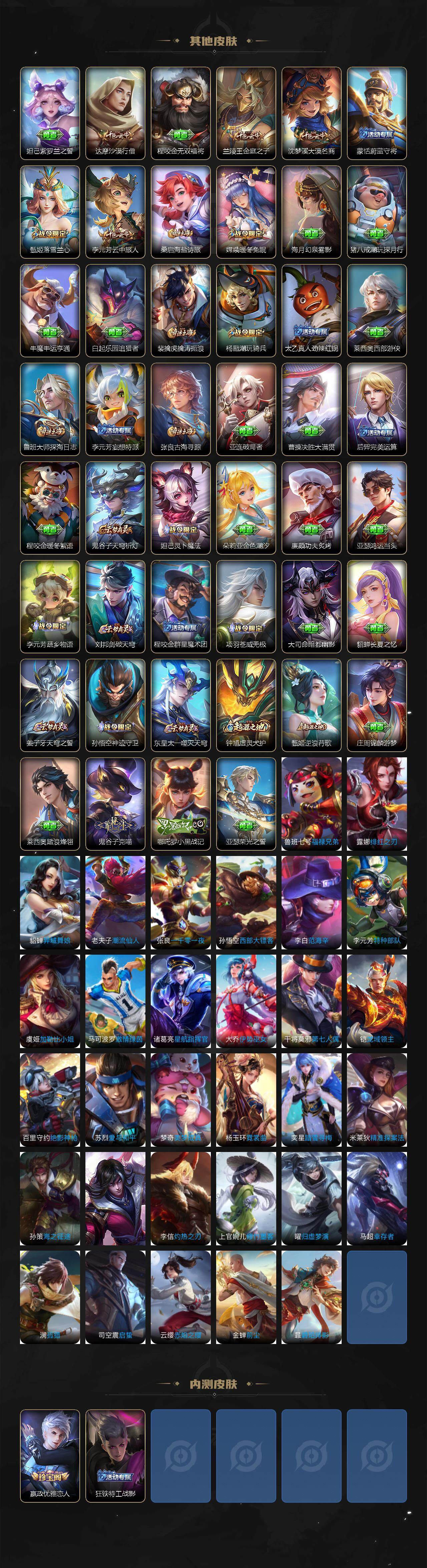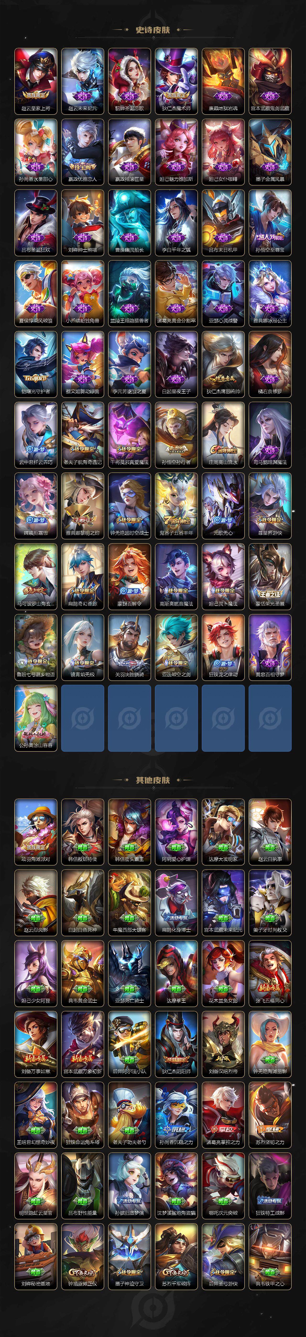 【限定皮肤】:姜子牙天穹之誓,狄仁杰阴阳师,赵云皇家上将,墨子神迹守卫,嬴政优雅恋人,庄周高山流水,钟无艳超时空战士,扁鹊奇幻香踪,元歌无心,甄姬落雪兰心,马可波罗山海玄木吟,狄仁杰魔术师,达摩沙漠行僧,项羽海滩派对,老夫子航海奇遇记,兰陵王金庭之子,孙悟空至尊宝,孙悟空孙行者,后羿圣弓游侠,李元芳云中旅人,钟馗驱傩正仪,杨戬潮玩骑兵,干将莫邪真爱魔法,雅典娜黎明之约,鬼谷子五谷丰年,苏烈千军破阵,沈梦溪大漠名商,裴擒虎擒涛扼浪,云中君纤云弄巧,嫦娥拒霜思,嫦娥暖冬兔眠,鲁班大师探海日志,桑启海盐诗旅,暃星界游侠,张良古海寻踪,蒙犽百解令,蒙恬荣光圣徽,高渐离燃音魔法,妲己灵卜魔法,鬼谷子天穹祈灯,貂蝉曦玄引,鲁班七号蔬乡物语,李元芳蔬乡物语,刘邦剑破天穹,程咬金群星魔术团,关羽决胜骁骑,镜青焰无极,项羽苍威无极