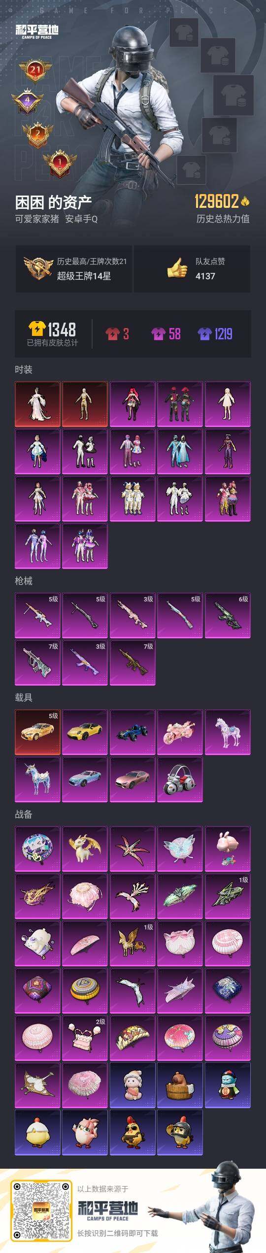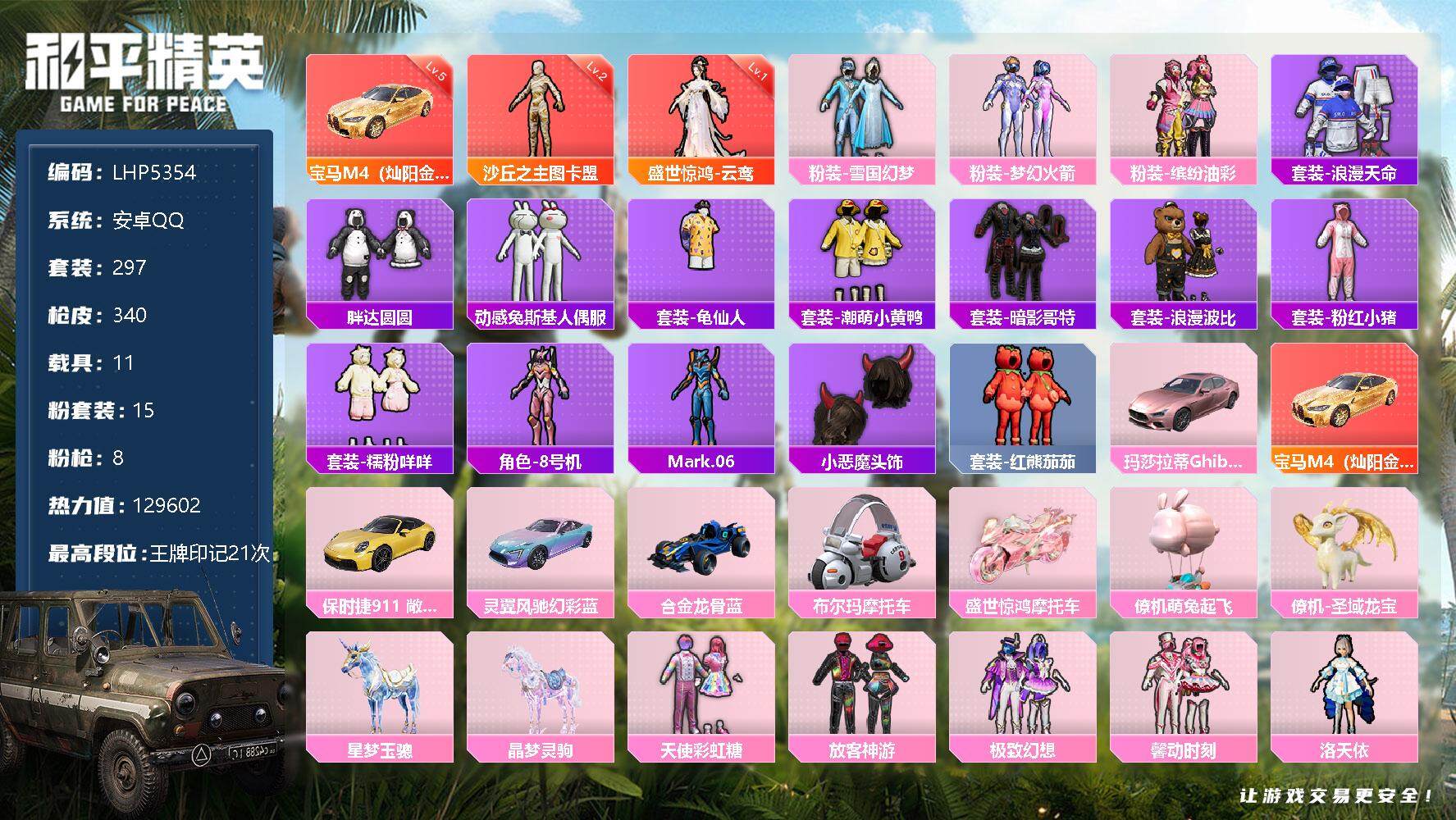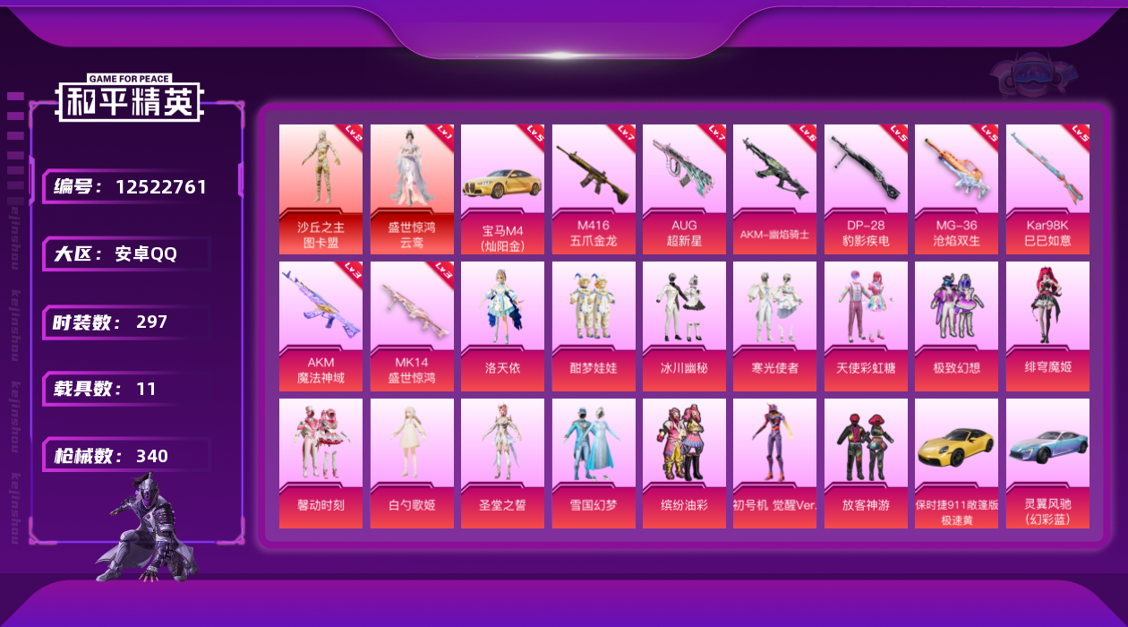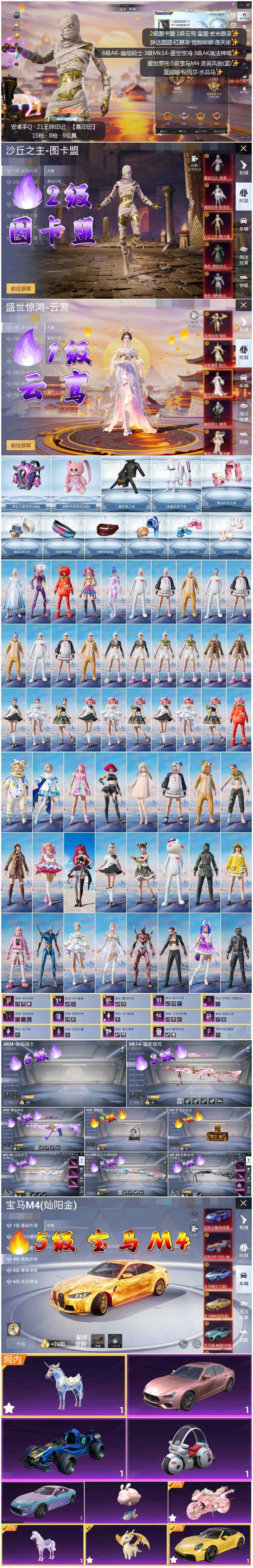 [12522761]素材身法号/宝马M4(灿阳金)(五级)/绝世印记1/地铁满天赋【特价急出/详情看图】:安卓 手Q-2神装-15粉装-8特效枪-11载具-9粉色飞行器-12.9w热力值-21王牌印记-297套装-340枪皮【红色载具】:宝马M4(灿阳金)(五级)【红色神装等级】:盛世惊鸿-云鸾(一级),沙丘之主-图卡盟(二级)【热门品类】:粉装-雪国幻梦,粉装-梦幻火箭,粉装-缤纷油彩,套装-浪漫天命,套装-胖达圆圆,套装-动感兔斯基人偶服,套装-龟仙人,套装-潮萌小黄鸭,套装-暗影哥特,套装-浪漫波比,套装-粉红小猪,套装-糯粉咩咩,角色-8号机,角色-Mark.06,小恶魔头饰,套装-红熊茄茄【粉色载具】:玛莎拉蒂Ghibli(粉),宝马M4(灿阳金),保时捷911 敞篷版(极速黄),灵翼风驰(幻彩蓝),合金龙骨(蓝),布尔玛摩托车,盛世惊鸿摩托车,僚机-萌兔起飞,僚机-圣域龙宝,星梦玉骢,晶梦灵驹【粉色套装】:粉装-天使彩虹糖,粉装-雪国幻梦,粉装-梦幻火箭,粉装-缤纷油彩,粉装-放客神游,粉装-极致幻想,粉装-馨动时刻,角色-洛天依,粉装-酣梦娃娃,粉装-冰川幽秘,粉装-寒光使者,角色-白勺歌姬,角色-圣堂之誓,角色-初号机 觉醒Ver.,角色-绯穹魔姬【粉色枪皮等级】:AKM-魔法神域(三级),AKM-幽焰骑士(六级),M416-五爪金龙(七级),AUG-超新星(七级),Kar98K-巳巳如意(五级),Mk14-盛世惊鸿(三级),DP-28-豹影疾电(五级),MG-36-沧焰双生(五级)【粉色飞行器】:酣梦熊熊飞行器,潮汐统领飞行器,天之羽翼飞行器,粉樱探戈飞行器,沙丘之主天马,幽焰列车飞行器,凤舞九天飞行器,万象金身飞行器