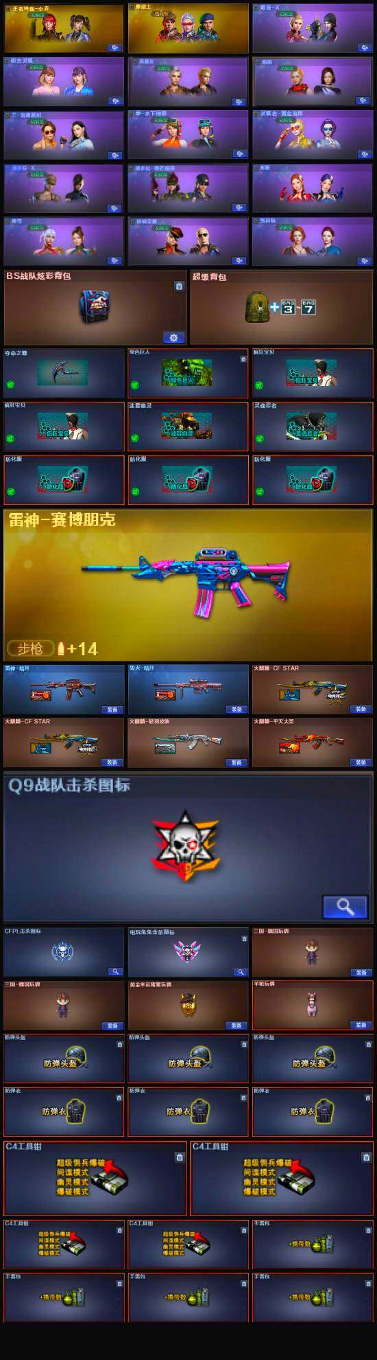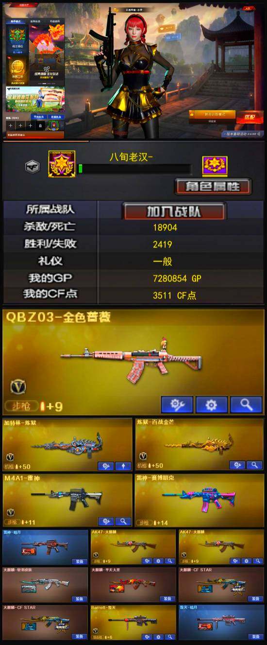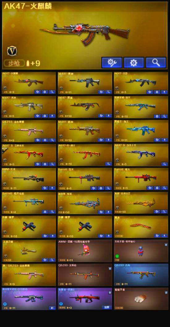 【英雄级武器】:QBZ03-金色蔷薇,M4A1-雷神,M4A1-死神,加特林-炼狱,AK47-无影,AK47-火麒麟*2,AWM-天龙,Barrett-毁灭,Barrett-极光,AK47-黑鲨,M4A1-猎神,黑骑士-海王,AK47-B-常胜将军,沙鹰-修罗*2,屠龙
