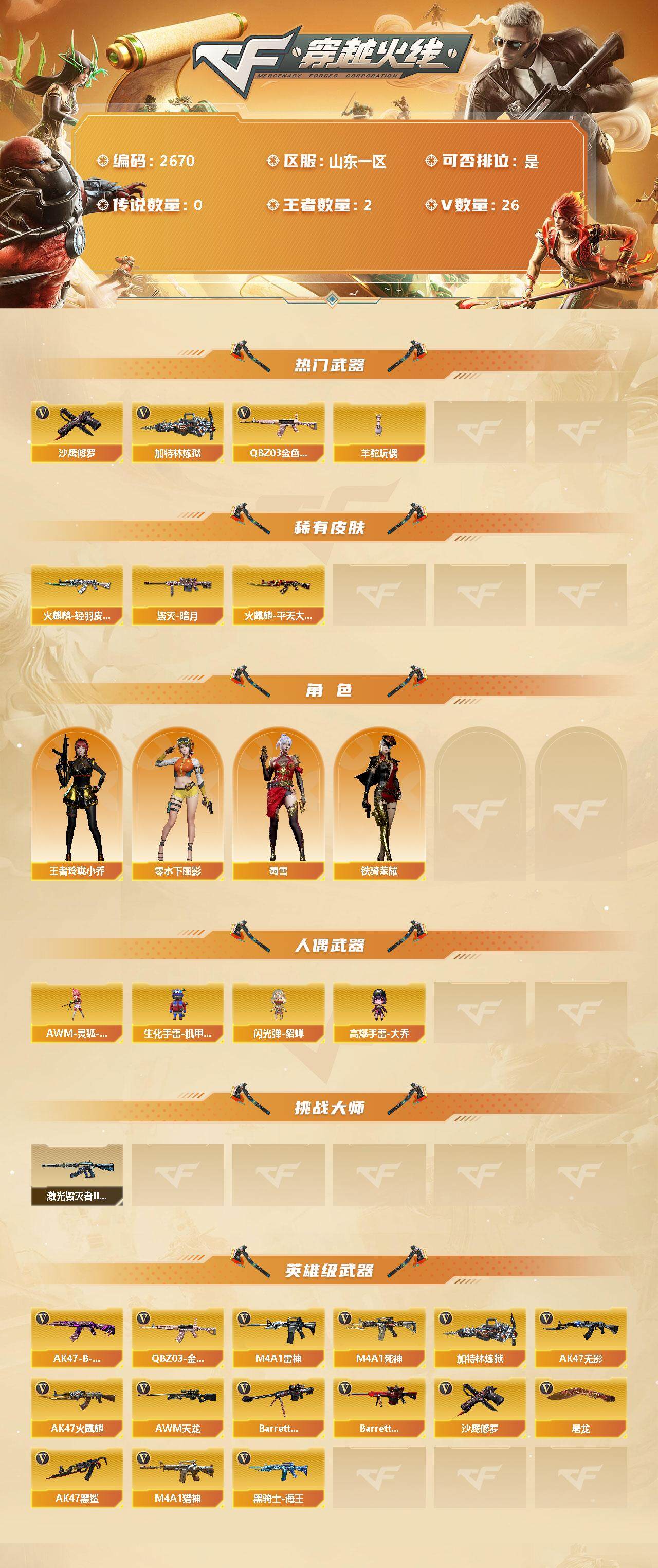 [12522535]【商品标题】:山东一区-26V-2王者-0炫金 【热门武器】:QBZ03-金色蔷薇,加特林-炼狱,羊驼玩偶,沙鹰-修罗*2 【稀有皮肤】:火麒麟-轻羽皮肤,火麒麟-平天大圣,毁灭-暗月 【角色】:王者玲珑-小乔,零-水下丽影,蜀雪,铁骑荣耀 【人偶武器】:AWM-灵狐-15周年嘉年华,生化手雷-机甲核心,闪光弹-貂蝉,高爆手雷-大乔 【挑战大师】:激光毁灭者III-白马银枪 【英雄级武器】:QBZ03-金色蔷薇,M4A1-雷神,M4A1-死神,加特林-炼狱,AK47-无影,AK47-火麒麟*2,AWM-天龙,Barrett-毁灭,Barrett-极光,AK47-黑鲨,M4A1-猎神,黑骑士-海王,AK47-B-常胜将军,沙鹰-修罗*2,屠龙 【特殊枪械】:1炼狱