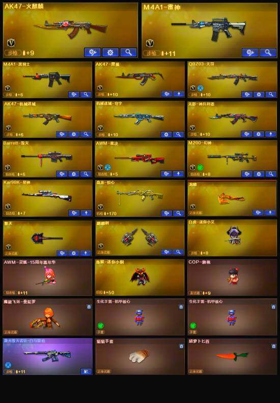 【英雄级武器】:无影-神兵利器,M4A1-雷神,M4A1-黑骑士,AK47-火麒麟,Barrett-毁灭,AWM-裁决,AK47-机械迷城,QBZ03-天罚,Kar98K-星神,M200-幻神,AK47-黑鲨,麒麟刺,擎天,龙啸